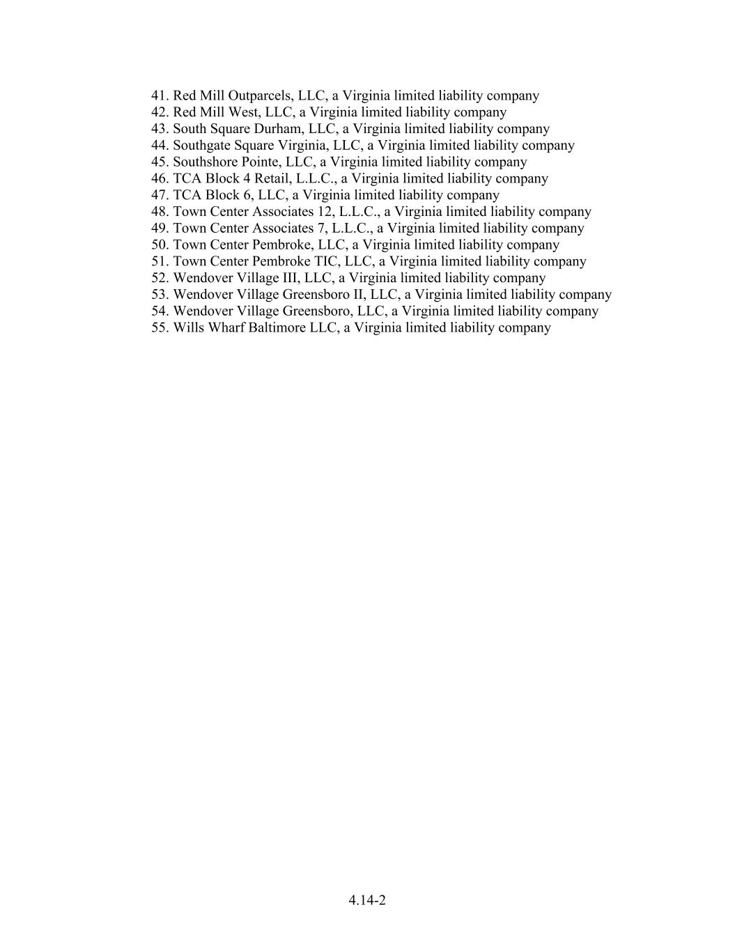 4.14-2 41. Red Mill Outparcels, LLC, a Virginia limited liability company 42. Red Mill West, LLC, a Virginia limited liability company 43. South Square Durham, LLC, a Virginia limited liability company 44. Southgate Square Virginia, LLC, a Virginia limited liability company 45. Southshore Pointe, LLC, a Virginia limited liability company 46. TCA Block 4 Retail, L.L.C., a Virginia limited liability company 47. TCA Block 6, LLC, a Virginia limited liability company 48. Town Center Associates 12, L.L.C., a Virginia limited liability company 49. Town Center Associates 7, L.L.C., a Virginia limited liability company 50. Town Center Pembroke, LLC, a Virginia limited liability company 51. Town Center Pembroke TIC, LLC, a Virginia limited liability company 52. Wendover Village III, LLC, a Virginia limited liability company 53. Wendover Village Greensboro II, LLC, a Virginia limited liability company 54. Wendover Village Greensboro, LLC, a Virginia limited liability company 55. Wills Wharf Baltimore LLC, a Virginia limited liability company