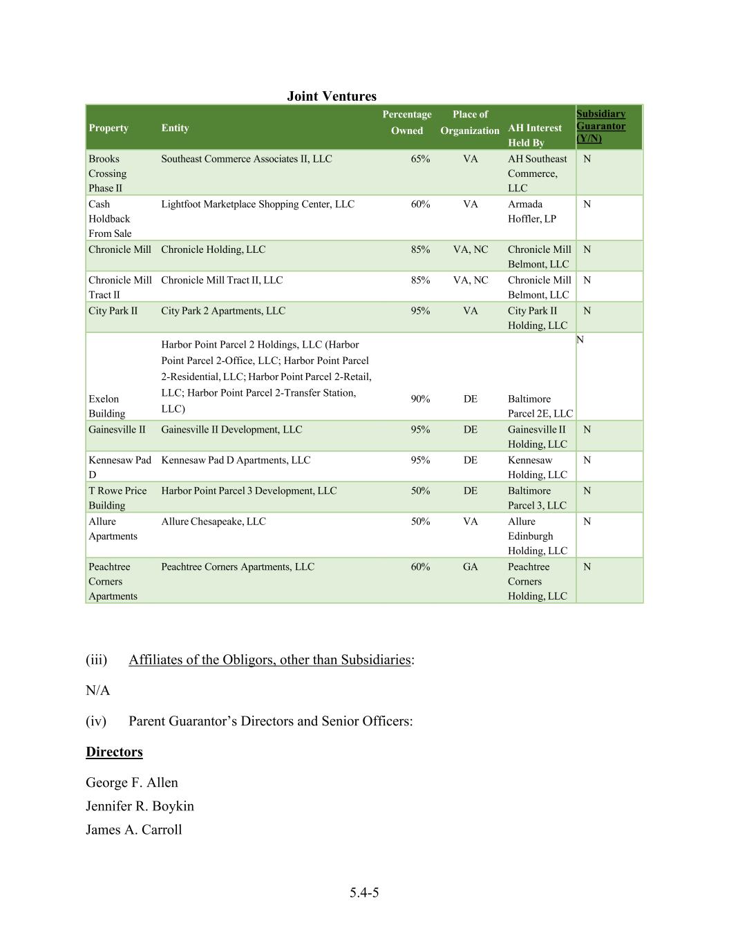5.4-5 Joint Ventures Property Entity Percentage Owned Place of Organization AH Interest Held By Subsidiary Guarantor (Y/N) Brooks Crossing Phase II Southeast Commerce Associates II, LLC 65% VA AH Southeast Commerce, LLC N Cash Holdback From Sale Lightfoot Marketplace Shopping Center, LLC 60% VA Armada Hoffler, LP N Chronicle Mill Chronicle Holding, LLC 85% VA, NC Chronicle Mill Belmont, LLC N Chronicle Mill Tract II Chronicle Mill Tract II, LLC 85% VA, NC Chronicle Mill Belmont, LLC N City Park II City Park 2 Apartments, LLC 95% VA City Park II Holding, LLC N Exelon Building Harbor Point Parcel 2 Holdings, LLC (Harbor Point Parcel 2-Office, LLC; Harbor Point Parcel 2-Residential, LLC; Harbor Point Parcel 2-Retail, LLC; Harbor Point Parcel 2-Transfer Station, LLC) 90% DE Baltimore Parcel 2E, LLC N Gainesville II Gainesville II Development, LLC 95% DE Gainesville II Holding, LLC N Kennesaw Pad D Kennesaw Pad D Apartments, LLC 95% DE Kennesaw Holding, LLC N T Rowe Price Building Harbor Point Parcel 3 Development, LLC 50% DE Baltimore Parcel 3, LLC N Allure Apartments Allure Chesapeake, LLC 50% VA Allure Edinburgh Holding, LLC N Peachtree Corners Apartments Peachtree Corners Apartments, LLC 60% GA Peachtree Corners Holding, LLC N (iii) Affiliates of the Obligors, other than Subsidiaries: N/A (iv) Parent Guarantor’s Directors and Senior Officers: Directors George F. Allen Jennifer R. Boykin James A. Carroll