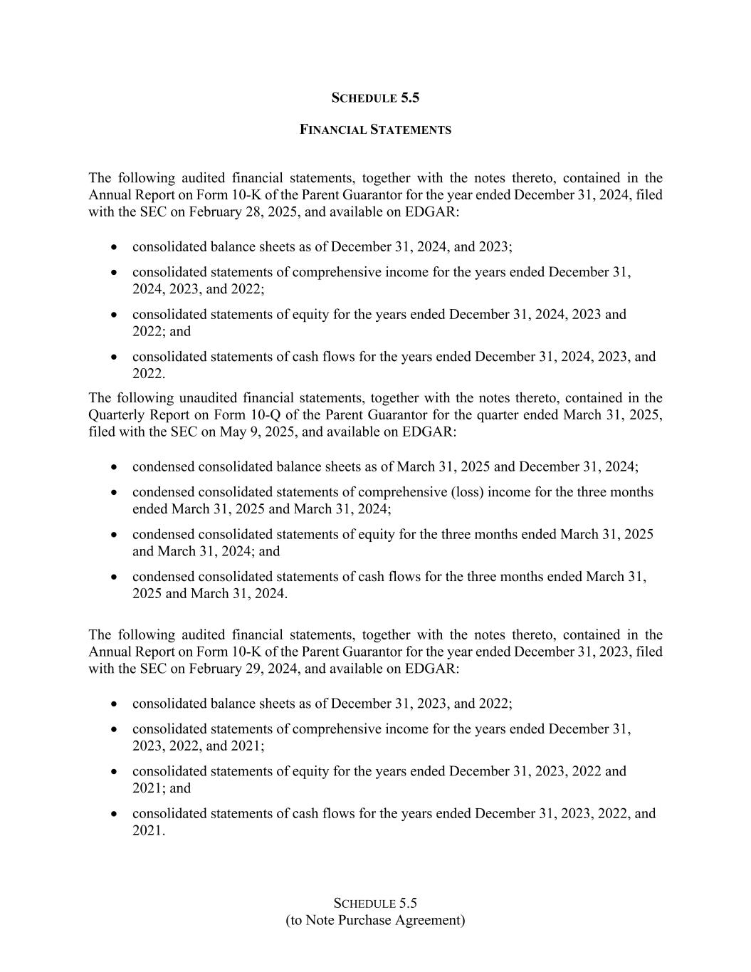 SCHEDULE 5.5 (to Note Purchase Agreement) SCHEDULE 5.5 FINANCIAL STATEMENTS The following audited financial statements, together with the notes thereto, contained in the Annual Report on Form 10-K of the Parent Guarantor for the year ended December 31, 2024, filed with the SEC on February 28, 2025, and available on EDGAR: consolidated balance sheets as of December 31, 2024, and 2023; consolidated statements of comprehensive income for the years ended December 31, 2024, 2023, and 2022; consolidated statements of equity for the years ended December 31, 2024, 2023 and 2022; and consolidated statements of cash flows for the years ended December 31, 2024, 2023, and 2022. The following unaudited financial statements, together with the notes thereto, contained in the Quarterly Report on Form 10-Q of the Parent Guarantor for the quarter ended March 31, 2025, filed with the SEC on May 9, 2025, and available on EDGAR: condensed consolidated balance sheets as of March 31, 2025 and December 31, 2024; condensed consolidated statements of comprehensive (loss) income for the three months ended March 31, 2025 and March 31, 2024; condensed consolidated statements of equity for the three months ended March 31, 2025 and March 31, 2024; and condensed consolidated statements of cash flows for the three months ended March 31, 2025 and March 31, 2024. The following audited financial statements, together with the notes thereto, contained in the Annual Report on Form 10-K of the Parent Guarantor for the year ended December 31, 2023, filed with the SEC on February 29, 2024, and available on EDGAR: consolidated balance sheets as of December 31, 2023, and 2022; consolidated statements of comprehensive income for the years ended December 31, 2023, 2022, and 2021; consolidated statements of equity for the years ended December 31, 2023, 2022 and 2021; and consolidated statements of cash flows for the years ended December 31, 2023, 2022, and 2021.