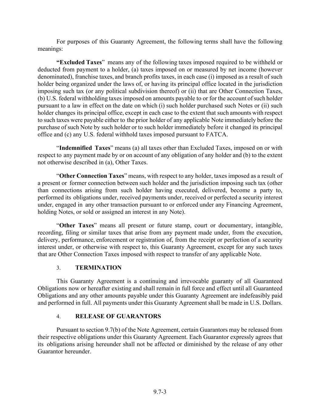 9.7-3 For purposes of this Guaranty Agreement, the following terms shall have the following meanings: “Excluded Taxes” means any of the following taxes imposed required to be withheld or deducted from payment to a holder, (a) taxes imposed on or measured by net income (however denominated), franchise taxes, and branch profits taxes, in each case (i) imposed as a result of such holder being organized under the laws of, or having its principal office located in the jurisdiction imposing such tax (or any political subdivision thereof) or (ii) that are Other Connection Taxes, (b) U.S. federal withholding taxes imposed on amounts payable to or for the account of such holder pursuant to a law in effect on the date on which (i) such holder purchased such Notes or (ii) such holder changes its principal office, except in each case to the extent that such amounts with respect to such taxes were payable either to the prior holder of any applicable Note immediately before the purchase of such Note by such holder or to such holder immediately before it changed its principal office and (c) any U.S. federal withhold taxes imposed pursuant to FATCA. “Indemnified Taxes” means (a) all taxes other than Excluded Taxes, imposed on or with respect to any payment made by or on account of any obligation of any holder and (b) to the extent not otherwise described in (a), Other Taxes. “Other Connection Taxes” means, with respect to any holder, taxes imposed as a result of a present or former connection between such holder and the jurisdiction imposing such tax (other than connections arising from such holder having executed, delivered, become a party to, performed its obligations under, received payments under, received or perfected a security interest under, engaged in any other transaction pursuant to or enforced under any Financing Agreement, holding Notes, or sold or assigned an interest in any Note). “Other Taxes” means all present or future stamp, court or documentary, intangible, recording, filing or similar taxes that arise from any payment made under, from the execution, delivery, performance, enforcement or registration of, from the receipt or perfection of a security interest under, or otherwise with respect to, this Guaranty Agreement, except for any such taxes that are Other Connection Taxes imposed with respect to transfer of any applicable Note. 3. TERMINATION This Guaranty Agreement is a continuing and irrevocable guaranty of all Guaranteed Obligations now or hereafter existing and shall remain in full force and effect until all Guaranteed Obligations and any other amounts payable under this Guaranty Agreement are indefeasibly paid and performed in full. All payments under this Guaranty Agreement shall be made in U.S. Dollars. 4. RELEASE OF GUARANTORS Pursuant to section 9.7(b) of the Note Agreement, certain Guarantors may be released from their respective obligations under this Guaranty Agreement. Each Guarantor expressly agrees that its obligations arising hereunder shall not be affected or diminished by the release of any other Guarantor hereunder.