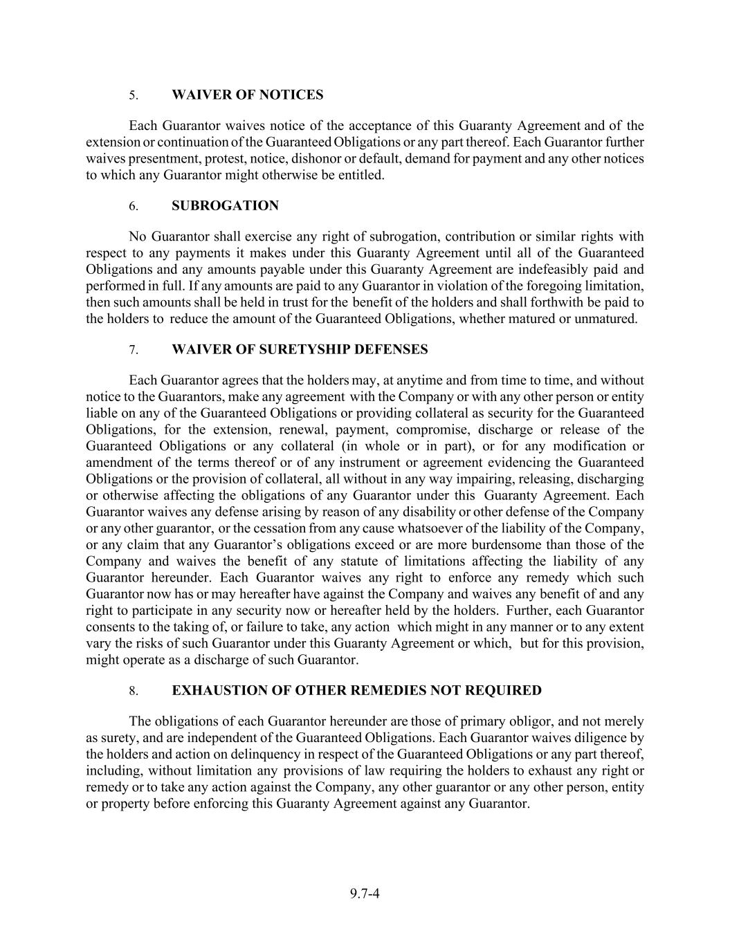 9.7-4 5. WAIVER OF NOTICES Each Guarantor waives notice of the acceptance of this Guaranty Agreement and of the extension or continuation of the Guaranteed Obligations or any part thereof. Each Guarantor further waives presentment, protest, notice, dishonor or default, demand for payment and any other notices to which any Guarantor might otherwise be entitled. 6. SUBROGATION No Guarantor shall exercise any right of subrogation, contribution or similar rights with respect to any payments it makes under this Guaranty Agreement until all of the Guaranteed Obligations and any amounts payable under this Guaranty Agreement are indefeasibly paid and performed in full. If any amounts are paid to any Guarantor in violation of the foregoing limitation, then such amounts shall be held in trust for the benefit of the holders and shall forthwith be paid to the holders to reduce the amount of the Guaranteed Obligations, whether matured or unmatured. 7. WAIVER OF SURETYSHIP DEFENSES Each Guarantor agrees that the holders may, at anytime and from time to time, and without notice to the Guarantors, make any agreement with the Company or with any other person or entity liable on any of the Guaranteed Obligations or providing collateral as security for the Guaranteed Obligations, for the extension, renewal, payment, compromise, discharge or release of the Guaranteed Obligations or any collateral (in whole or in part), or for any modification or amendment of the terms thereof or of any instrument or agreement evidencing the Guaranteed Obligations or the provision of collateral, all without in any way impairing, releasing, discharging or otherwise affecting the obligations of any Guarantor under this Guaranty Agreement. Each Guarantor waives any defense arising by reason of any disability or other defense of the Company or any other guarantor, or the cessation from any cause whatsoever of the liability of the Company, or any claim that any Guarantor’s obligations exceed or are more burdensome than those of the Company and waives the benefit of any statute of limitations affecting the liability of any Guarantor hereunder. Each Guarantor waives any right to enforce any remedy which such Guarantor now has or may hereafter have against the Company and waives any benefit of and any right to participate in any security now or hereafter held by the holders. Further, each Guarantor consents to the taking of, or failure to take, any action which might in any manner or to any extent vary the risks of such Guarantor under this Guaranty Agreement or which, but for this provision, might operate as a discharge of such Guarantor. 8. EXHAUSTION OF OTHER REMEDIES NOT REQUIRED The obligations of each Guarantor hereunder are those of primary obligor, and not merely as surety, and are independent of the Guaranteed Obligations. Each Guarantor waives diligence by the holders and action on delinquency in respect of the Guaranteed Obligations or any part thereof, including, without limitation any provisions of law requiring the holders to exhaust any right or remedy or to take any action against the Company, any other guarantor or any other person, entity or property before enforcing this Guaranty Agreement against any Guarantor.