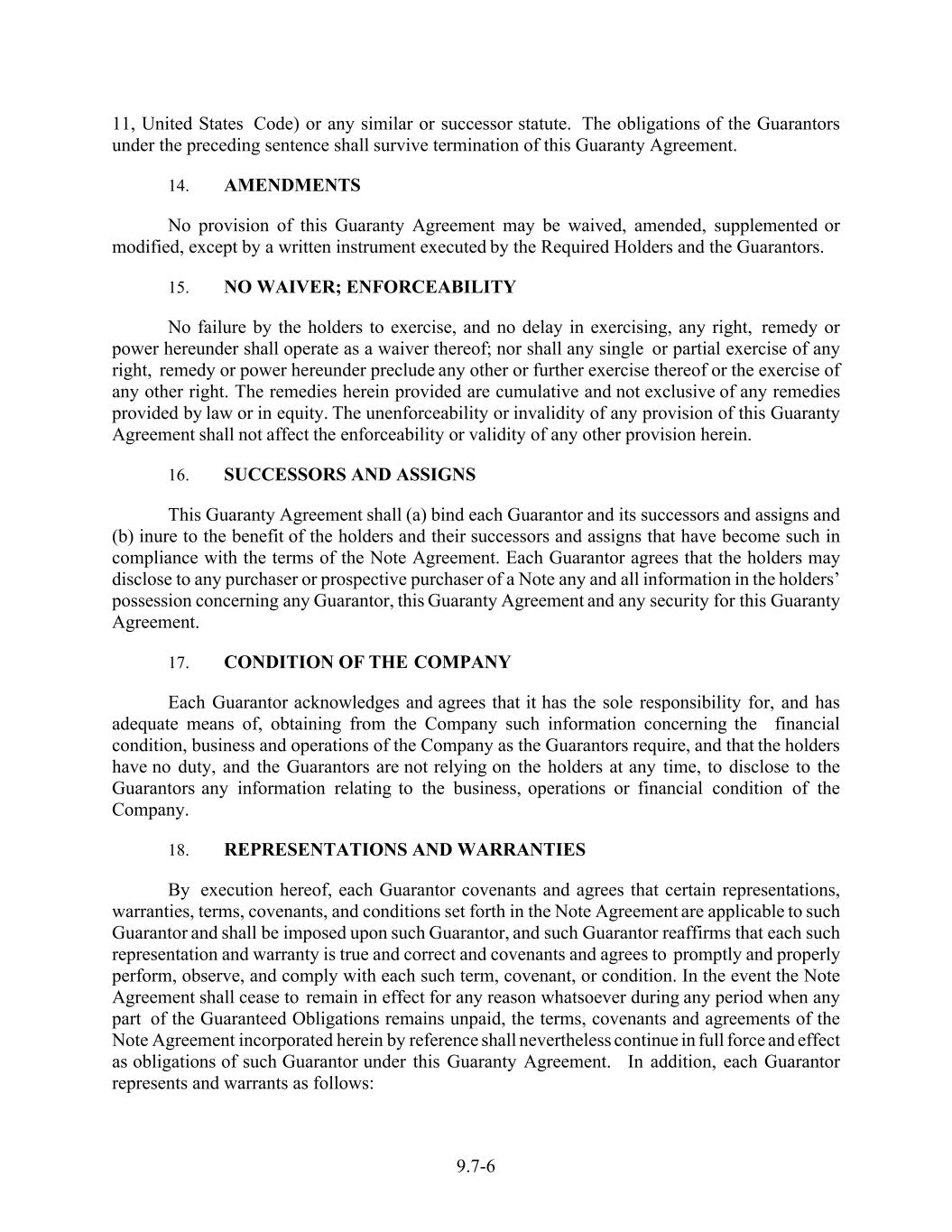 9.7-6 11, United States Code) or any similar or successor statute. The obligations of the Guarantors under the preceding sentence shall survive termination of this Guaranty Agreement. 14. AMENDMENTS No provision of this Guaranty Agreement may be waived, amended, supplemented or modified, except by a written instrument executed by the Required Holders and the Guarantors. 15. NO WAIVER; ENFORCEABILITY No failure by the holders to exercise, and no delay in exercising, any right, remedy or power hereunder shall operate as a waiver thereof; nor shall any single or partial exercise of any right, remedy or power hereunder preclude any other or further exercise thereof or the exercise of any other right. The remedies herein provided are cumulative and not exclusive of any remedies provided by law or in equity. The unenforceability or invalidity of any provision of this Guaranty Agreement shall not affect the enforceability or validity of any other provision herein. 16. SUCCESSORS AND ASSIGNS This Guaranty Agreement shall (a) bind each Guarantor and its successors and assigns and (b) inure to the benefit of the holders and their successors and assigns that have become such in compliance with the terms of the Note Agreement. Each Guarantor agrees that the holders may disclose to any purchaser or prospective purchaser of a Note any and all information in the holders’ possession concerning any Guarantor, this Guaranty Agreement and any security for this Guaranty Agreement. 17. CONDITION OF THE COMPANY Each Guarantor acknowledges and agrees that it has the sole responsibility for, and has adequate means of, obtaining from the Company such information concerning the financial condition, business and operations of the Company as the Guarantors require, and that the holders have no duty, and the Guarantors are not relying on the holders at any time, to disclose to the Guarantors any information relating to the business, operations or financial condition of the Company. 18. REPRESENTATIONS AND WARRANTIES By execution hereof, each Guarantor covenants and agrees that certain representations, warranties, terms, covenants, and conditions set forth in the Note Agreement are applicable to such Guarantor and shall be imposed upon such Guarantor, and such Guarantor reaffirms that each such representation and warranty is true and correct and covenants and agrees to promptly and properly perform, observe, and comply with each such term, covenant, or condition. In the event the Note Agreement shall cease to remain in effect for any reason whatsoever during any period when any part of the Guaranteed Obligations remains unpaid, the terms, covenants and agreements of the Note Agreement incorporated herein by reference shall nevertheless continue in full force and effect as obligations of such Guarantor under this Guaranty Agreement. In addition, each Guarantor represents and warrants as follows: