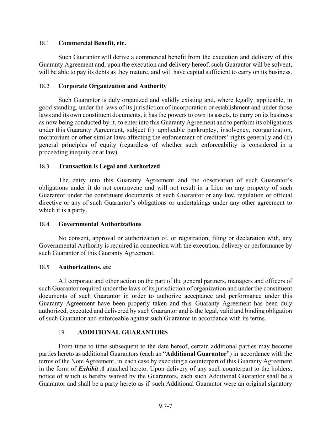 9.7-7 18.1 Commercial Benefit, etc. Such Guarantor will derive a commercial benefit from the execution and delivery of this Guaranty Agreement and, upon the execution and delivery hereof, such Guarantor will be solvent, will be able to pay its debts as they mature, and will have capital sufficient to carry on its business. 18.2 Corporate Organization and Authority Such Guarantor is duly organized and validly existing and, where legally applicable, in good standing, under the laws of its jurisdiction of incorporation or establishment and under those laws and its own constituent documents, it has the powers to own its assets, to carry on its business as now being conducted by it, to enter into this Guaranty Agreement and to perform its obligations under this Guaranty Agreement, subject (i) applicable bankruptcy, insolvency, reorganization, moratorium or other similar laws affecting the enforcement of creditors’ rights generally and (ii) general principles of equity (regardless of whether such enforceability is considered in a proceeding inequity or at law). 18.3 Transaction is Legal and Authorized The entry into this Guaranty Agreement and the observation of such Guarantor’s obligations under it do not contravene and will not result in a Lien on any property of such Guarantor under the constituent documents of such Guarantor or any law, regulation or official directive or any of such Guarantor’s obligations or undertakings under any other agreement to which it is a party. 18.4 Governmental Authorizations No consent, approval or authorization of, or registration, filing or declaration with, any Governmental Authority is required in connection with the execution, delivery or performance by such Guarantor of this Guaranty Agreement. 18.5 Authorizations, etc All corporate and other action on the part of the general partners, managers and officers of such Guarantor required under the laws of its jurisdiction of organization and under the constituent documents of such Guarantor in order to authorize acceptance and performance under this Guaranty Agreement have been properly taken and this Guaranty Agreement has been duly authorized, executed and delivered by such Guarantor and is the legal, valid and binding obligation of such Guarantor and enforceable against such Guarantor in accordance with its terms. 19. ADDITIONAL GUARANTORS From time to time subsequent to the date hereof, certain additional parties may become parties hereto as additional Guarantors (each an “Additional Guarantor”) in accordance with the terms of the Note Agreement, in each case by executing a counterpart of this Guaranty Agreement in the form of Exhibit A attached hereto. Upon delivery of any such counterpart to the holders, notice of which is hereby waived by the Guarantors, each such Additional Guarantor shall be a Guarantor and shall be a party hereto as if such Additional Guarantor were an original signatory