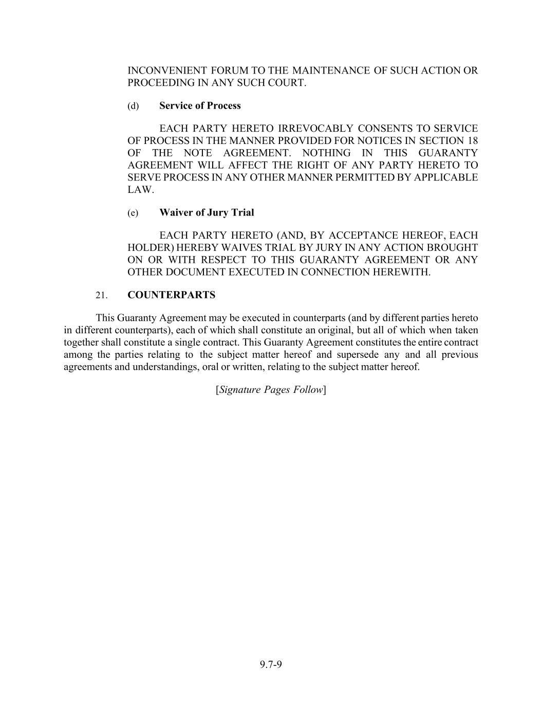 9.7-9 INCONVENIENT FORUM TO THE MAINTENANCE OF SUCH ACTION OR PROCEEDING IN ANY SUCH COURT. (d) Service of Process EACH PARTY HERETO IRREVOCABLY CONSENTS TO SERVICE OF PROCESS IN THE MANNER PROVIDED FOR NOTICES IN SECTION 18 OF THE NOTE AGREEMENT. NOTHING IN THIS GUARANTY AGREEMENT WILL AFFECT THE RIGHT OF ANY PARTY HERETO TO SERVE PROCESS IN ANY OTHER MANNER PERMITTED BY APPLICABLE LAW. (e) Waiver of Jury Trial EACH PARTY HERETO (AND, BY ACCEPTANCE HEREOF, EACH HOLDER) HEREBY WAIVES TRIAL BY JURY IN ANY ACTION BROUGHT ON OR WITH RESPECT TO THIS GUARANTY AGREEMENT OR ANY OTHER DOCUMENT EXECUTED IN CONNECTION HEREWITH. 21. COUNTERPARTS This Guaranty Agreement may be executed in counterparts (and by different parties hereto in different counterparts), each of which shall constitute an original, but all of which when taken together shall constitute a single contract. This Guaranty Agreement constitutes the entire contract among the parties relating to the subject matter hereof and supersede any and all previous agreements and understandings, oral or written, relating to the subject matter hereof. [Signature Pages Follow]