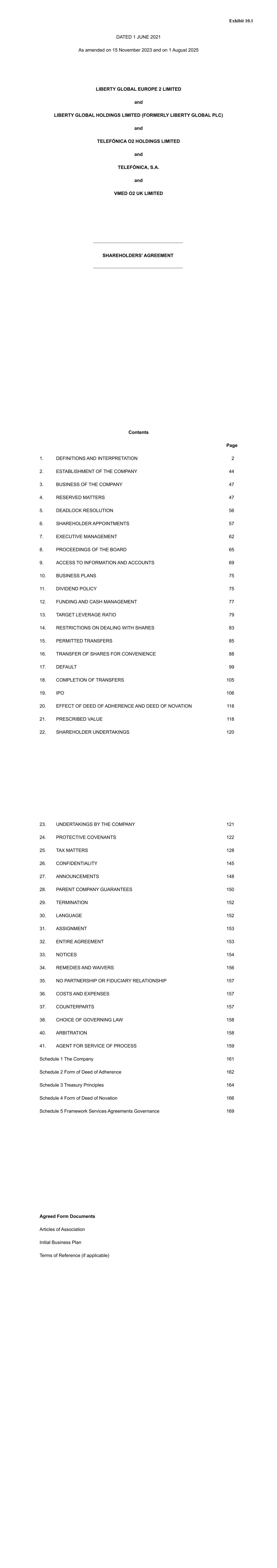 Exhibit 10.1 DATED 1 JUNE 2021 As amended on 15 November 2023 and on 1 August 2025 LIBERTY GLOBAL EUROPE 2 LIMITED and LIBERTY GLOBAL HOLDINGS LIMITED (FORMERLY LIBERTY GLOBAL PLC) and TELEFÓNICA O2 HOLDINGS LIMITED and TELEFÓNICA, S.A. and VMED O2 UK LIMITED SHAREHOLDERS’ AGREEMENT Contents Page 1. DEFINITIONS AND INTERPRETATION 2 2. ESTABLISHMENT OF THE COMPANY 44 3. BUSINESS OF THE COMPANY 47 4. RESERVED MATTERS 47 5. DEADLOCK RESOLUTION 56 6. SHAREHOLDER APPOINTMENTS 57 7. EXECUTIVE MANAGEMENT 62 8. PROCEEDINGS OF THE BOARD 65 9. ACCESS TO INFORMATION AND ACCOUNTS 69 10. BUSINESS PLANS 75 11. DIVIDEND POLICY 75 12. FUNDING AND CASH MANAGEMENT 77 13. TARGET LEVERAGE RATIO 79 14. RESTRICTIONS ON DEALING WITH SHARES 83 15. PERMITTED TRANSFERS 85 16. TRANSFER OF SHARES FOR CONVENIENCE 88 17. DEFAULT 99 18. COMPLETION OF TRANSFERS 105 19. IPO 106 20. EFFECT OF DEED OF ADHERENCE AND DEED OF NOVATION 118 21. PRESCRIBED VALUE 118 22. SHAREHOLDER UNDERTAKINGS 120 23. UNDERTAKINGS BY THE COMPANY 121 24. PROTECTIVE COVENANTS 122 25. TAX MATTERS 128 26. CONFIDENTIALITY 145 27. ANNOUNCEMENTS 148 28. PARENT COMPANY GUARANTEES 150 29. TERMINATION 152 30. LANGUAGE 152 31. ASSIGNMENT 153 32. ENTIRE AGREEMENT 153 33. NOTICES 154 34. REMEDIES AND WAIVERS 156 35. NO PARTNERSHIP OR FIDUCIARY RELATIONSHIP 157 36. COSTS AND EXPENSES 157 37. COUNTERPARTS 157 38. CHOICE OF GOVERNING LAW 158 40. ARBITRATION 158 41. AGENT FOR SERVICE OF PROCESS 159 Schedule 1 The Company 161 Schedule 2 Form of Deed of Adherence 162 Schedule 3 Treasury Principles 164 Schedule 4 Form of Deed of Novation 166 Schedule 5 Framework Services Agreements Governance 169 Agreed Form Documents Articles of Association Initial Business Plan Terms of Reference (if applicable)