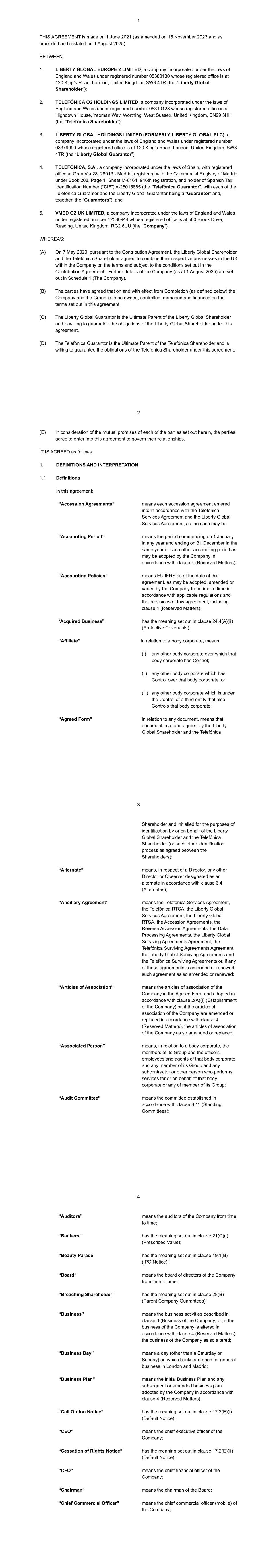 1 THIS AGREEMENT is made on 1 June 2021 (as amended on 15 November 2023 and as amended and restated on 1 August 2025) BETWEEN: 1. LIBERTY GLOBAL EUROPE 2 LIMITED, a company incorporated under the laws of England and Wales under registered number 08380130 whose registered office is at 120 King’s Road, London, United Kingdom, SW3 4TR (the “Liberty Global Shareholder”); 2. TELEFÓNICA O2 HOLDINGS LIMITED, a company incorporated under the laws of England and Wales under registered number 05310128 whose registered office is at Highdown House, Yeoman Way, Worthing, West Sussex, United Kingdom, BN99 3HH (the “Telefónica Shareholder”); 3. LIBERTY GLOBAL HOLDINGS LIMITED (FORMERLY LIBERTY GLOBAL PLC), a company incorporated under the laws of England and Wales under registered number 08379990 whose registered office is at 120 King’s Road, London, United Kingdom, SW3 4TR (the “Liberty Global Guarantor”); 4. TELEFÓNICA, S.A., a company incorporated under the laws of Spain, with registered office at Gran Via 28, 28013 - Madrid, registered with the Commercial Registry of Madrid under Book 208, Page 1, Sheet M-6164, 946th registration, and holder of Spanish Tax Identification Number (“CIF”) A-28015865 (the “Telefónica Guarantor”, with each of the Telefónica Guarantor and the Liberty Global Guarantor being a “Guarantor” and, together, the “Guarantors”); and 5. VMED O2 UK LIMITED, a company incorporated under the laws of England and Wales under registered number 12580944 whose registered office is at 500 Brook Drive, Reading, United Kingdom, RG2 6UU (the “Company”). WHEREAS: (A) On 7 May 2020, pursuant to the Contribution Agreement, the Liberty Global Shareholder and the Telefónica Shareholder agreed to combine their respective businesses in the UK within the Company on the terms and subject to the conditions set out in the Contribution Agreement. Further details of the Company (as at 1 August 2025) are set out in Schedule 1 (The Company). (B) The parties have agreed that on and with effect from Completion (as defined below) the Company and the Group is to be owned, controlled, managed and financed on the terms set out in this agreement. (C) The Liberty Global Guarantor is the Ultimate Parent of the Liberty Global Shareholder and is willing to guarantee the obligations of the Liberty Global Shareholder under this agreement. (D) The Telefónica Guarantor is the Ultimate Parent of the Telefónica Shareholder and is willing to guarantee the obligations of the Telefónica Shareholder under this agreement. 2 (E) In consideration of the mutual promises of each of the parties set out herein, the parties agree to enter into this agreement to govern their relationships. IT IS AGREED as follows: 1. DEFINITIONS AND INTERPRETATION 1.1 Definitions In this agreement: “Accession Agreements” means each accession agreement entered into in accordance with the Telefónica Services Agreement and the Liberty Global Services Agreement, as the case may be; “Accounting Period” means the period commencing on 1 January in any year and ending on 31 December in the same year or such other accounting period as may be adopted by the Company in accordance with clause 4 (Reserved Matters); “Accounting Policies” means EU IFRS as at the date of this agreement, as may be adopted, amended or varied by the Company from time to time in accordance with applicable regulations and the provisions of this agreement, including clause 4 (Reserved Matters); “Acquired Business” has the meaning set out in clause 24.4(A)(ii) (Protective Covenants); “Affiliate” in relation to a body corporate, means: (i) any other body corporate over which that body corporate has Control; (ii) any other body corporate which has Control over that body corporate; or (iii) any other body corporate which is under the Control of a third entity that also Controls that body corporate; “Agreed Form” in relation to any document, means that document in a form agreed by the Liberty Global Shareholder and the Telefónica 3 Shareholder and initialled for the purposes of identification by or on behalf of the Liberty Global Shareholder and the Telefónica Shareholder (or such other identification process as agreed between the Shareholders); “Alternate” means, in respect of a Director, any other Director or Observer designated as an alternate in accordance with clause 6.4 (Alternates); “Ancillary Agreement” means the Telefónica Services Agreement, the Telefónica RTSA, the Liberty Global Services Agreement, the Liberty Global RTSA, the Accession Agreements, the Reverse Accession Agreements, the Data Processing Agreements, the Liberty Global Surviving Agreements Agreement, the Telefónica Surviving Agreements Agreement, the Liberty Global Surviving Agreements and the Telefónica Surviving Agreements or, if any of those agreements is amended or renewed, such agreement as so amended or renewed; “Articles of Association” means the articles of association of the Company in the Agreed Form and adopted in accordance with clause 2(A)(i) (Establishment of the Company) or, if the articles of association of the Company are amended or replaced in accordance with clause 4 (Reserved Matters), the articles of association of the Company as so amended or replaced; “Associated Person” means, in relation to a body corporate, the members of its Group and the officers, employees and agents of that body corporate and any member of its Group and any subcontractor or other person who performs services for or on behalf of that body corporate or any of member of its Group; “Audit Committee” means the committee established in accordance with clause 8.11 (Standing Committees); 4 “Auditors” means the auditors of the Company from time to time; “Bankers” has the meaning set out in clause 21(C)(i) (Prescribed Value); “Beauty Parade” has the meaning set out in clause 19.1(B) (IPO Notice); “Board” means the board of di