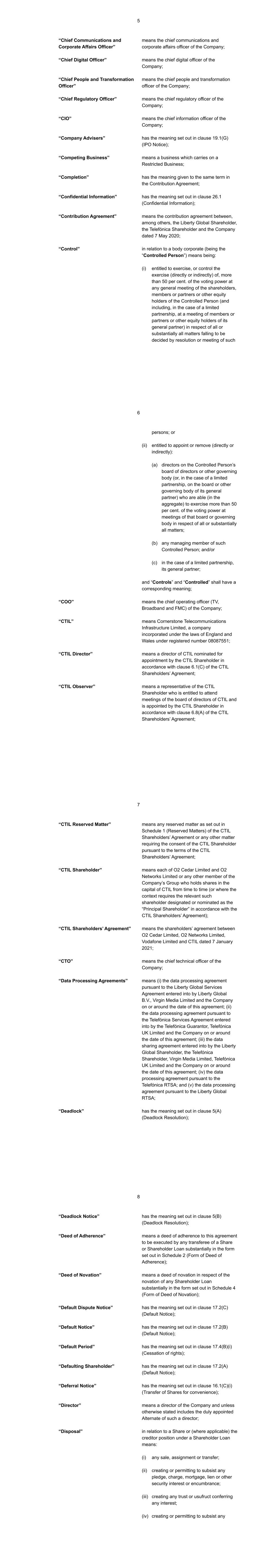 5 “Chief Communications and Corporate Affairs Officer” means the chief communications and corporate affairs officer of the Company; “Chief Digital Officer” means the chief digital officer of the Company; “Chief People and Transformation Officer” means the chief people and transformation officer of the Company; “Chief Regulatory Officer” means the chief regulatory officer of the Company; “CIO” means the chief information officer of the Company; “Company Advisers” has the meaning set out in clause 19.1(G) (IPO Notice); “Competing Business” means a business which carries on a Restricted Business; “Completion” has the meaning given to the same term in the Contribution Agreement; “Confidential Information” has the meaning set out in clause 26.1 (Confidential Information); “Contribution Agreement” means the contribution agreement between, among others, the Liberty Global Shareholder, the Telefónica Shareholder and the Company dated 7 May 2020; “Control” in relation to a body corporate (being the “Controlled Person”) means being: (i) entitled to exercise, or control the exercise (directly or indirectly) of, more than 50 per cent. of the voting power at any general meeting of the shareholders, members or partners or other equity holders of the Controlled Person (and including, in the case of a limited partnership, at a meeting of members or partners or other equity holders of its general partner) in respect of all or substantially all matters falling to be decided by resolution or meeting of such 6 persons; or (ii) entitled to appoint or remove (directly or indirectly): (a) directors on the Controlled Person’s board of directors or other governing body (or, in the case of a limited partnership, on the board or other governing body of its general partner) who are able (in the aggregate) to exercise more than 50 per cent. of the voting power at meetings of that board or governing body in respect of all or substantially all matters; (b) any managing member of such Controlled Person; and/or (c) in the case of a limited partnership, its general partner; and “Controls” and “Controlled” shall have a corresponding meaning; “COO” means the chief operating officer (TV, Broadband and FMC) of the Company; “CTIL” means Cornerstone Telecommunications Infrastructure Limited, a company incorporated under the laws of England and Wales under registered number 08087551; “CTIL Director” means a director of CTIL nominated for appointment by the CTIL Shareholder in accordance with clause 6.1(C) of the CTIL Shareholders’ Agreement; “CTIL Observer” means a representative of the CTIL Shareholder who is entitled to attend meetings of the board of directors of CTIL and is appointed by the CTIL Shareholder in accordance with clause 6.8(A) of the CTIL Shareholders’ Agreement; 7 “CTIL Reserved Matter” means any reserved matter as set out in Schedule 1 (Reserved Matters) of the CTIL Shareholders’ Agreement or any other matter requiring the consent of the CTIL Shareholder pursuant to the terms of the CTIL Shareholders’ Agreement; “CTIL Shareholder” means each of O2 Cedar Limited and O2 Networks Limited or any other member of the Company’s Group who holds shares in the capital of CTIL from time to time (or where the context requires the relevant such shareholder designated or nominated as the “Principal Shareholder” in accordance with the CTIL Shareholders’ Agreement); “CTIL Shareholders’ Agreement” means the shareholders’ agreement between O2 Cedar Limited, O2 Networks Limited, Vodafone Limited and CTIL dated 7 January 2021; “CTO” means the chief technical officer of the Company; “Data Processing Agreements” means (i) the data processing agreement pursuant to the Liberty Global Services Agreement entered into by Liberty Global B.V., Virgin Media Limited and the Company on or around the date of this agreement; (ii) the data processing agreement pursuant to the Telefónica Services Agreement entered into by the Telefónica Guarantor, Telefónica UK Limited and the Company on or around the date of this agreement; (iii) the data sharing agreement entered into by the Liberty Global Shareholder, the Telefónica Shareholder, Virgin Media Limited, Telefónica UK Limited and the Company on or around the date of this agreement; (iv) the data processing agreement pursuant to the Telefónica RTSA; and (v) the data processing agreement pursuant to the Liberty Global RTSA; “Deadlock” has the meaning set out in clause 5(A) (Deadlock Resolution); 8 “Deadlock Notice” has the meaning set out in clause 5(B) (Deadlock Resolution); “Deed of Adherence” means a deed of adherence to this agreement to be executed by any transferee of a Share or Shareholder Loan substantially in the form set out in Schedule 2 (Form of Deed of Adherence); “Deed of Novation” means a deed of novation in respect of the novation of any Shareholder Loan substantially in the form set out in Schedule 4 (Form of Deed of Novation); “Default Dispute Notice” has the meaning set out in clause 17.2(C) (Default Notice); “Default Notice” has the meaning set out in clause 17.2(B) (Default Notice); “Default Period” has the meaning set out in clause 17.4(B)(i) (Cessation of rights); “Defaulting Shareholder” has the meaning set out in clause 17.2(A) (Default Notice); “Deferral Notice” has the meaning set out in clause 16.1(C)(i) (Transfer of Shares for convenience); “Director” means a director of the Company and unless otherwise stated includes the duly appointed Alternate of such a director; “Disposal” in relation to a Share or (where applicable) the creditor position under a Shareholder Loan means: (i) any sale, assignment or transfer; (ii) creating or permitting to subsist any pledge, charge, mortgage, lien or other security interest or encumbrance; (iii) creating any trust or usufruct conferring any interest; (iv) creating or pe