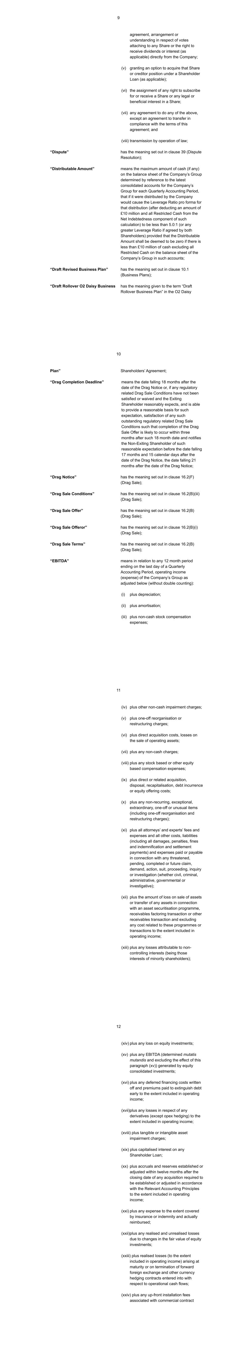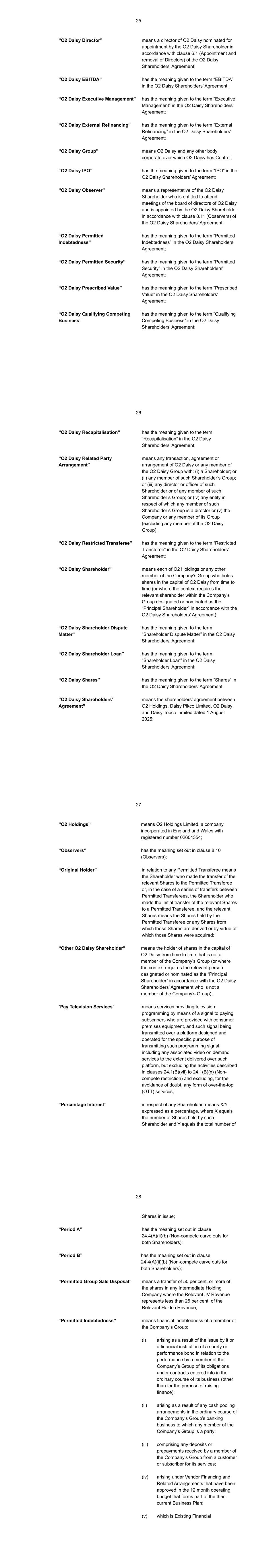 25 “O2 Daisy Director” means a director of O2 Daisy nominated for appointment by the O2 Daisy Shareholder in accordance with clause 6.1 (Appointment and removal of Directors) of the O2 Daisy Shareholders’ Agreement; “O2 Daisy EBITDA” has the meaning given to the term “EBITDA” in the O2 Daisy Shareholders’ Agreement; “O2 Daisy Executive Management” has the meaning given to the term “Executive Management” in the O2 Daisy Shareholders’ Agreement; “O2 Daisy External Refinancing” has the meaning given to the term “External Refinancing” in the O2 Daisy Shareholders’ Agreement; “O2 Daisy Group” means O2 Daisy and any other body corporate over which O2 Daisy has Control; “O2 Daisy IPO” has the meaning given to the term “IPO” in the O2 Daisy Shareholders’ Agreement; “O2 Daisy Observer” means a representative of the O2 Daisy Shareholder who is entitled to attend meetings of the board of directors of O2 Daisy and is appointed by the O2 Daisy Shareholder in accordance with clause 8.11 (Observers) of the O2 Daisy Shareholders’ Agreement; “O2 Daisy Permitted Indebtedness” has the meaning given to the term “Permitted Indebtedness” in the O2 Daisy Shareholders’ Agreement; “O2 Daisy Permitted Security” has the meaning given to the term “Permitted Security” in the O2 Daisy Shareholders’ Agreement; “O2 Daisy Prescribed Value” has the meaning given to the term “Prescribed Value” in the O2 Daisy Shareholders’ Agreement; “O2 Daisy Qualifying Competing Business” has the meaning given to the term “Qualifying Competing Business” in the O2 Daisy Shareholders’ Agreement; 26 “O2 Daisy Recapitalisation” has the meaning given to the term “Recapitalisation” in the O2 Daisy Shareholders’ Agreement; “O2 Daisy Related Party Arrangement” means any transaction, agreement or arrangement of O2 Daisy or any member of the O2 Daisy Group with: (i) a Shareholder; or (ii) any member of such Shareholder’s Group; or (iii) any director or officer of such Shareholder or of any member of such Shareholder’s Group; or (iv) any entity in respect of which any member of such Shareholder’s Group is a director or (v) the Company or any member of its Group (excluding any member of the O2 Daisy Group); “O2 Daisy Restricted Transferee” has the meaning given to the term “Restricted Transferee” in the O2 Daisy Shareholders’ Agreement; “O2 Daisy Shareholder” means each of O2 Holdings or any other member of the Company’s Group who holds shares in the capital of O2 Daisy from time to time (or where the context requires the relevant shareholder within the Company’s Group designated or nominated as the “Principal Shareholder” in accordance with the O2 Daisy Shareholders’ Agreement); “O2 Daisy Shareholder Dispute Matter” has the meaning given to the term “Shareholder Dispute Matter” in the O2 Daisy Shareholders’ Agreement; “O2 Daisy Shareholder Loan” has the meaning given to the term “Shareholder Loan” in the O2 Daisy Shareholders’ Agreement; “O2 Daisy Shares” has the meaning given to the term “Shares” in the O2 Daisy Shareholders’ Agreement; “O2 Daisy Shareholders’ Agreement” means the shareholders’ agreement between O2 Holdings, Daisy Pikco Limited, O2 Daisy and Daisy Topco Limited dated 1 August 2025; 27 “O2 Holdings” means O2 Holdings Limited, a company incorporated in England and Wales with registered number 02604354; “Observers” has the meaning set out in clause 8.10 (Observers); “Original Holder” in relation to any Permitted Transferee means the Shareholder who made the transfer of the relevant Shares to the Permitted Transferee or, in the case of a series of transfers between Permitted Transferees, the Shareholder who made the initial transfer of the relevant Shares to a Permitted Transferee, and the relevant Shares means the Shares held by the Permitted Transferee or any Shares from which those Shares are derived or by virtue of which those Shares were acquired; “Other O2 Daisy Shareholder” means the holder of shares in the capital of O2 Daisy from time to time that is not a member of the Company’s Group (or where the context requires the relevant person designated or nominated as the “Principal Shareholder” in accordance with the O2 Daisy Shareholders’ Agreement who is not a member of the Company’s Group); “Pay Television Services” means services providing television programming by means of a signal to paying subscribers who are provided with consumer premises equipment, and such signal being transmitted over a platform designed and operated for the specific purpose of transmitting such programming signal, including any associated video on demand services to the extent delivered over such platform, but excluding the activities described in clauses 24.1(B)(vii) to 24.1(B)(x) (Non- compete restriction) and excluding, for the avoidance of doubt, any form of over-the-top (OTT) services; “Percentage Interest” in respect of any Shareholder, means X/Y expressed as a percentage, where X equals the number of Shares held by such Shareholder and Y equals the total number of 28 Shares in issue; “Period A” has the meaning set out in clause 24.4(A)(ii)(b) (Non-compete carve outs for both Shareholders); “Period B” has the meaning set out in clause 24.4(A)(ii)(b) (Non-compete carve outs for both Shareholders); “Permitted Group Sale Disposal” means a transfer of 50 per cent. or more of the shares in any Intermediate Holding Company where the Relevant JV Revenue represents less than 25 per cent. of the Relevant Holdco Revenue; “Permitted Indebtedness” means financial indebtedness of a member of the Company’s Group: (i) arising as a result of the issue by it or a financial institution of a surety or performance bond in relation to the performance by a member of the Company’s Group of its obligations under contracts entered into in th