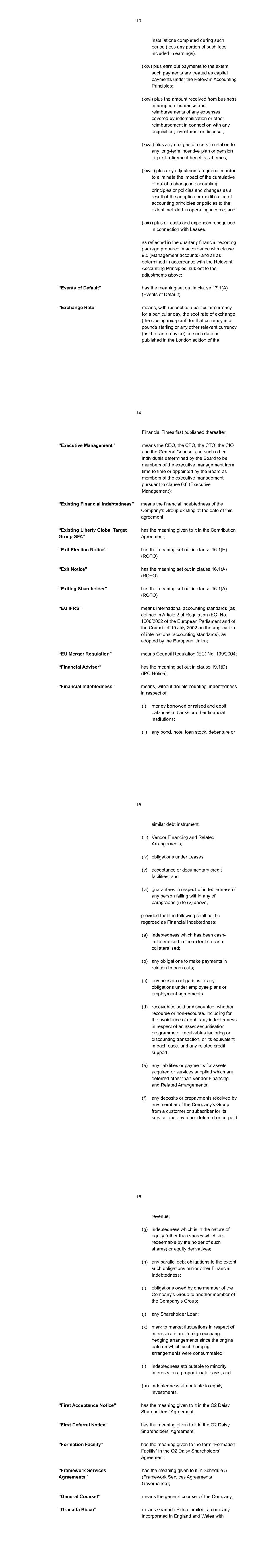 13 installations completed during such period (less any portion of such fees included in earnings); (xxv) plus earn out payments to the extent such payments are treated as capital payments under the Relevant Accounting Principles; (xxvi) plus the amount received from business interruption insurance and reimbursements of any expenses covered by indemnification or other reimbursement in connection with any acquisition, investment or disposal; (xxvii) plus any charges or costs in relation to any long-term incentive plan or pension or post-retirement benefits schemes; (xxviii) plus any adjustments required in order to eliminate the impact of the cumulative effect of a change in accounting principles or policies and changes as a result of the adoption or modification of accounting principles or policies to the extent included in operating income; and (xxix) plus all costs and expenses recognised in connection with Leases, as reflected in the quarterly financial reporting package prepared in accordance with clause 9.5 (Management accounts) and all as determined in accordance with the Relevant Accounting Principles, subject to the adjustments above; “Events of Default” has the meaning set out in clause 17.1(A) (Events of Default); “Exchange Rate” means, with respect to a particular currency for a particular day, the spot rate of exchange (the closing mid-point) for that currency into pounds sterling or any other relevant currency (as the case may be) on such date as published in the London edition of the 14 Financial Times first published thereafter; “Executive Management” means the CEO, the CFO, the CTO, the CIO and the General Counsel and such other individuals determined by the Board to be members of the executive management from time to time or appointed by the Board as members of the executive management pursuant to clause 6.8 (Executive Management); “Existing Financial Indebtedness” means the financial indebtedness of the Company’s Group existing at the date of this agreement; “Existing Liberty Global Target Group SFA” has the meaning given to it in the Contribution Agreement; “Exit Election Notice” has the meaning set out in clause 16.1(H) (ROFO); “Exit Notice” has the meaning set out in clause 16.1(A) (ROFO); “Exiting Shareholder” has the meaning set out in clause 16.1(A) (ROFO); “EU IFRS” means international accounting standards (as defined in Article 2 of Regulation (EC) No. 1606/2002 of the European Parliament and of the Council of 19 July 2002 on the application of international accounting standards), as adopted by the European Union; “EU Merger Regulation” means Council Regulation (EC) No. 139/2004; “Financial Adviser” has the meaning set out in clause 19.1(D) (IPO Notice); “Financial Indebtedness” means, without double counting, indebtedness in respect of: (i) money borrowed or raised and debit balances at banks or other financial institutions; (ii) any bond, note, loan stock, debenture or 15 similar debt instrument; (iii) Vendor Financing and Related Arrangements; (iv) obligations under Leases; (v) acceptance or documentary credit facilities; and (vi) guarantees in respect of indebtedness of any person falling within any of paragraphs (i) to (v) above, provided that the following shall not be regarded as Financial Indebtedness: (a) indebtedness which has been cash- collateralised to the extent so cash- collateralised; (b) any obligations to make payments in relation to earn outs; (c) any pension obligations or any obligations under employee plans or employment agreements; (d) receivables sold or discounted, whether recourse or non-recourse, including for the avoidance of doubt any indebtedness in respect of an asset securitisation programme or receivables factoring or discounting transaction, or its equivalent in each case, and any related credit support; (e) any liabilities or payments for assets acquired or services supplied which are deferred other than Vendor Financing and Related Arrangements; (f) any deposits or prepayments received by any member of the Company’s Group from a customer or subscriber for its service and any other deferred or prepaid 16 revenue; (g) indebtedness which is in the nature of equity (other than shares which are redeemable by the holder of such shares) or equity derivatives; (h) any parallel debt obligations to the extent such obligations mirror other Financial Indebtedness; (i) obligations owed by one member of the Company’s Group to another member of the Company’s Group; (j) any Shareholder Loan; (k) mark to market fluctuations in respect of interest rate and foreign exchange hedging arrangements since the original date on which such hedging arrangements were consummated; (l) indebtedness attributable to minority interests on a proportionate basis; and (m) indebtedness attributable to equity investments. “First Acceptance Notice” has the meaning given to it in the O2 Daisy Shareholders’ Agreement; “First Deferral Notice” has the meaning given to it in the O2 Daisy Shareholders’ Agreement; “Formation Facility” has the meaning given to the term “Formation Facility” in the O2 Daisy Shareholders’ Agreement; “Framework Services Agreements” has the meaning given to it in Schedule 5 (Framework Services Agreements Governance); “General Counsel” means the general counsel of the Company; “Granada Bidco” means Granada Bidco Limited, a company incorporated in England and Wales with