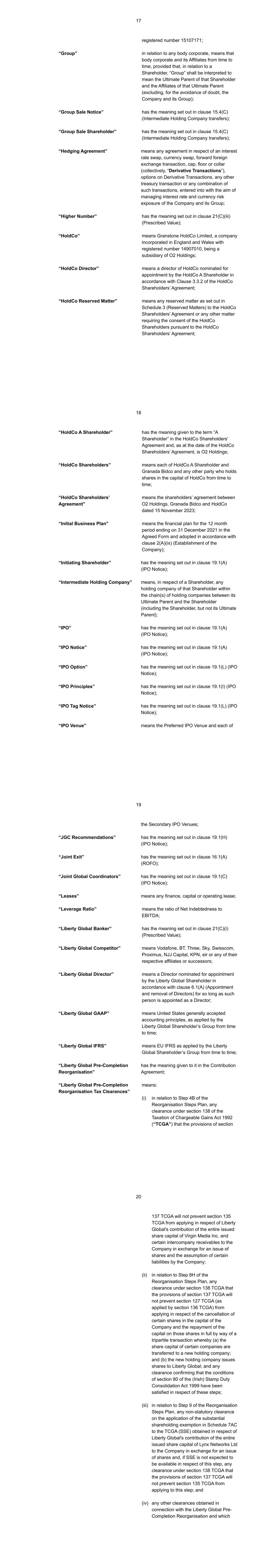 17 registered number 15107171; “Group” in relation to any body corporate, means that body corporate and its Affiliates from time to time, provided that, in relation to a Shareholder, “Group” shall be interpreted to mean the Ultimate Parent of that Shareholder and the Affiliates of that Ultimate Parent (excluding, for the avoidance of doubt, the Company and its Group); “Group Sale Notice” has the meaning set out in clause 15.4(C) (Intermediate Holding Company transfers); “Group Sale Shareholder” has the meaning set out in clause 15.4(C) (Intermediate Holding Company transfers); “Hedging Agreement” means any agreement in respect of an interest rate swap, currency swap, forward foreign exchange transaction, cap, floor or collar (collectively, “Derivative Transactions”), options on Derivative Transactions, any other treasury transaction or any combination of such transactions, entered into with the aim of managing interest rate and currency risk exposure of the Company and its Group; “Higher Number” has the meaning set out in clause 21(C)(iii) (Prescribed Value); “HoldCo” means Granstone HoldCo Limited, a company incorporated in England and Wales with registered number 14907010, being a subsidiary of O2 Holdings; “HoldCo Director” means a director of HoldCo nominated for appointment by the HoldCo A Shareholder in accordance with Clause 3.3.2 of the HoldCo Shareholders’ Agreement; “HoldCo Reserved Matter” means any reserved matter as set out in Schedule 3 (Reserved Matters) to the HoldCo Shareholders’ Agreement or any other matter requiring the consent of the HoldCo Shareholders pursuant to the HoldCo Shareholders’ Agreement; 18 “HoldCo A Shareholder” has the meaning given to the term “A Shareholder” in the HoldCo Shareholders’ Agreement and, as at the date of the HoldCo Shareholders’ Agreement, is O2 Holdings; “HoldCo Shareholders” means each of HoldCo A Shareholder and Granada Bidco and any other party who holds shares in the capital of HoldCo from time to time; “HoldCo Shareholders’ Agreement” means the shareholders’ agreement between O2 Holdings, Granada Bidco and HoldCo dated 15 November 2023; “Initial Business Plan” means the financial plan for the 12 month period ending on 31 December 2021 in the Agreed Form and adopted in accordance with clause 2(A)(ix) (Establishment of the Company); “Initiating Shareholder” has the meaning set out in clause 19.1(A) (IPO Notice); “Intermediate Holding Company” means, in respect of a Shareholder, any holding company of that Shareholder within the chain(s) of holding companies between its Ultimate Parent and the Shareholder (including the Shareholder, but not its Ultimate Parent); “IPO” has the meaning set out in clause 19.1(A) (IPO Notice); “IPO Notice” has the meaning set out in clause 19.1(A) (IPO Notice); “IPO Option” has the meaning set out in clause 19.1(L) (IPO Notice); “IPO Principles” has the meaning set out in clause 19.1(I) (IPO Notice); “IPO Tag Notice” has the meaning set out in clause 19.1(L) (IPO Notice); “IPO Venue” means the Preferred IPO Venue and each of 19 the Secondary IPO Venues; “JGC Recommendations” has the meaning set out in clause 19.1(H) (IPO Notice); “Joint Exit” has the meaning set out in clause 16.1(A) (ROFO); “Joint Global Coordinators” has the meaning set out in clause 19.1(C) (IPO Notice); “Leases” means any finance, capital or operating lease; “Leverage Ratio” means the ratio of Net Indebtedness to EBITDA; “Liberty Global Banker” has the meaning set out in clause 21(C)(i) (Prescribed Value); “Liberty Global Competitor” means Vodafone, BT, Three, Sky, Swisscom, Proximus, NJJ Capital, KPN, eir or any of their respective affiliates or successors; “Liberty Global Director” means a Director nominated for appointment by the Liberty Global Shareholder in accordance with clause 6.1(A) (Appointment and removal of Directors) for so long as such person is appointed as a Director; “Liberty Global GAAP” means United States generally accepted accounting principles, as applied by the Liberty Global Shareholder’s Group from time to time; “Liberty Global IFRS” means EU IFRS as applied by the Liberty Global Shareholder’s Group from time to time; “Liberty Global Pre-Completion Reorganisation” has the meaning given to it in the Contribution Agreement; “Liberty Global Pre-Completion Reorganisation Tax Clearances” means: (i) in relation to Step 4B of the Reorganisation Steps Plan, any clearance under section 138 of the Taxation of Chargeable Gains Act 1992 (“TCGA”) that the provisions of section 20 137 TCGA will not prevent section 135 TCGA from applying in respect of Liberty Global's contribution of the entire issued share capital of Virgin Media Inc. and certain intercompany receivables to the Company in exchange for an issue of shares and the assumption of certain liabilities by the Company; (ii) in relation to Step 8H of the Reorganisation Steps Plan, any clearance under section 138 TCGA that the provisions of section 137 TCGA will not prevent section 127 TCGA (as applied by section 136 TCGA) from applying in respect of the cancellation of certain shares in the capital of the Company and the repayment of the capital on those shares in full by way of a tripartite transaction whereby (a) the share capital of certain companies are transferred to a new holding company; and (b) the new holding company issues shares to Liberty Global; and any clearance confirming that the conditions of section 80 of the (Irish) Stamp Duty Consolidation Act 1999 have been satisfied in respect of these steps; (iii) in relation to Step 9 of the Reorganisation Steps Plan, any non-statutory clearance on the application of the substantial shareholding exemption in Schedule 7AC to the TCGA (SSE) obtained in respect of Liberty Global's contribution of the entire issued share capital of Lynx Networks Ltd to t