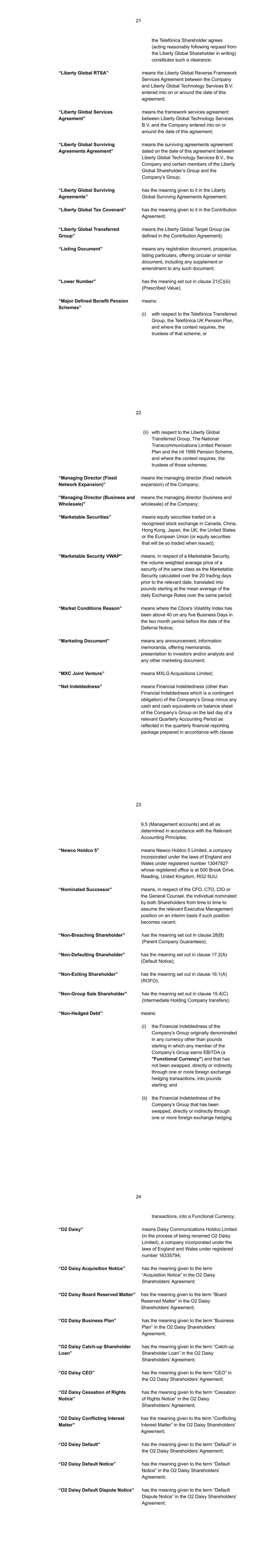 21 the Telefónica Shareholder agrees (acting reasonably following request from the Liberty Global Shareholder in writing) constitutes such a clearance; “Liberty Global RTSA” means the Liberty Global Reverse Framework Services Agreement between the Company and Liberty Global Technology Services B.V. entered into on or around the date of this agreement; “Liberty Global Services Agreement” means the framework services agreement between Liberty Global Technology Services B.V. and the Company entered into on or around the date of this agreement; “Liberty Global Surviving Agreements Agreement” means the surviving agreements agreement dated on the date of this agreement between Liberty Global Technology Services B.V., the Company and certain members of the Liberty Global Shareholder’s Group and the Company’s Group; “Liberty Global Surviving Agreements” has the meaning given to it in the Liberty Global Surviving Agreements Agreement; “Liberty Global Tax Covenant” has the meaning given to it in the Contribution Agreement; “Liberty Global Transferred Group” means the Liberty Global Target Group (as defined in the Contribution Agreement); “Listing Document” means any registration document, prospectus, listing particulars, offering circular or similar document, including any supplement or amendment to any such document; “Lower Number” has the meaning set out in clause 21(C)(iii) (Prescribed Value); “Major Defined Benefit Pension Schemes” means: (i) with respect to the Telefónica Transferred Group, the Telefónica UK Pension Plan, and where the context requires, the trustees of that scheme; or 22 (ii) with respect to the Liberty Global Transferred Group, The National Transcommunications Limited Pension Plan and the ntl 1999 Pension Scheme, and where the context requires, the trustees of those schemes; “Managing Director (Fixed Network Expansion)” means the managing director (fixed network expansion) of the Company; “Managing Director (Business and Wholesale)” means the managing director (business and wholesale) of the Company; “Marketable Securities” means equity securities traded on a recognised stock exchange in Canada, China, Hong Kong, Japan, the UK, the United States or the European Union (or equity securities that will be so traded when issued); “Marketable Security VWAP” means, in respect of a Marketable Security, the volume weighted average price of a security of the same class as the Marketable Security calculated over the 20 trading days prior to the relevant date, translated into pounds sterling at the mean average of the daily Exchange Rates over the same period; “Market Conditions Reason” means where the Cboe's Volatility Index has been above 40 on any five Business Days in the two month period before the date of the Deferral Notice; “Marketing Document” means any announcement, information memoranda, offering memoranda, presentation to investors and/or analysts and any other marketing document; “MXC Joint Venture” means MXLG Acquisitions Limited; “Net Indebtedness” means Financial Indebtedness (other than Financial Indebtedness which is a contingent obligation) of the Company’s Group minus any cash and cash equivalents on balance sheet of the Company’s Group on the last day of a relevant Quarterly Accounting Period as reflected in the quarterly financial reporting package prepared in accordance with clause 23 9.5 (Management accounts) and all as determined in accordance with the Relevant Accounting Principles; “Newco Holdco 5” means Newco Holdco 5 Limited, a company incorporated under the laws of England and Wales under registered number 13047827 whose registered office is at 500 Brook Drive, Reading, United Kingdom, RG2 6UU; “Nominated Successor” means, in respect of the CFO, CTO, CIO or the General Counsel, the individual nominated by both Shareholders from time to time to assume the relevant Executive Management position on an interim basis if such position becomes vacant; “Non-Breaching Shareholder” has the meaning set out in clause 28(B) (Parent Company Guarantees); “Non-Defaulting Shareholder” has the meaning set out in clause 17.2(A) (Default Notice); “Non-Exiting Shareholder” has the meaning set out in clause 16.1(A) (ROFO); “Non-Group Sale Shareholder” has the meaning set out in clause 15.4(C) (Intermediate Holding Company transfers); “Non-Hedged Debt” means: (i) the Financial Indebtedness of the Company’s Group originally denominated in any currency other than pounds sterling in which any member of the Company’s Group earns EBITDA (a "Functional Currency") and that has not been swapped, directly or indirectly through one or more foreign exchange hedging transactions, into pounds sterling; and (ii) the Financial Indebtedness of the Company’s Group that has been swapped, directly or indirectly through one or more foreign exchange hedging 24 transactions, into a Functional Currency; “O2 Daisy” means Daisy Communications Holdco Limited (in the process of being renamed O2 Daisy Limited), a company incorporated under the laws of England and Wales under registered number 16335794; “O2 Daisy Acquisition Notice” has the meaning given to the term “Acquisition Notice” in the O2 Daisy Shareholders’ Agreement; “O2 Daisy Board Reserved Matter” has the meaning given to the term “Board Reserved Matter” in the O2 Daisy Shareholders’ Agreement; “O2 Daisy Business Plan” has the meaning given to the term “Business Plan” in the O2 Daisy Shareholders’ Agreement; “O2 Daisy Catch-up Shareholder Loan” has the meaning given to the term “Catch-up Shareholder Loan” in the O2 Daisy Shareholders’ Agreement; “O2 Daisy CEO” has the meaning given to the term “CEO” in the O2 Daisy Shareholders’ Agreement; “O2 Daisy Cessation of Rights Notice” has the meaning given to the term “Cessation of Rights Notice” in the O2 Daisy Shareholders’ Agre
