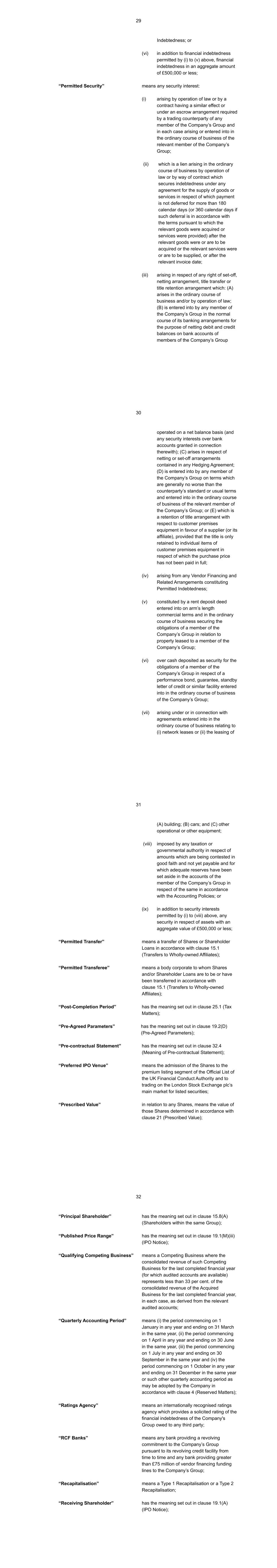 29 Indebtedness; or (vi) in addition to financial indebtedness permitted by (i) to (v) above, financial indebtedness in an aggregate amount of £500,000 or less; “Permitted Security” means any security interest: (i) arising by operation of law or by a contract having a similar effect or under an escrow arrangement required by a trading counterparty of any member of the Company’s Group and in each case arising or entered into in the ordinary course of business of the relevant member of the Company’s Group; (ii) which is a lien arising in the ordinary course of business by operation of law or by way of contract which secures indebtedness under any agreement for the supply of goods or services in respect of which payment is not deferred for more than 180 calendar days (or 360 calendar days if such deferral is in accordance with the terms pursuant to which the relevant goods were acquired or services were provided) after the relevant goods were or are to be acquired or the relevant services were or are to be supplied, or after the relevant invoice date; (iii) arising in respect of any right of set-off, netting arrangement, title transfer or title retention arrangement which: (A) arises in the ordinary course of business and/or by operation of law; (B) is entered into by any member of the Company’s Group in the normal course of its banking arrangements for the purpose of netting debit and credit balances on bank accounts of members of the Company’s Group 30 operated on a net balance basis (and any security interests over bank accounts granted in connection therewith); (C) arises in respect of netting or set-off arrangements contained in any Hedging Agreement; (D) is entered into by any member of the Company’s Group on terms which are generally no worse than the counterparty’s standard or usual terms and entered into in the ordinary course of business of the relevant member of the Company’s Group; or (E) which is a retention of title arrangement with respect to customer premises equipment in favour of a supplier (or its affiliate), provided that the title is only retained to individual items of customer premises equipment in respect of which the purchase price has not been paid in full; (iv) arising from any Vendor Financing and Related Arrangements constituting Permitted Indebtedness; (v) constituted by a rent deposit deed entered into on arm’s length commercial terms and in the ordinary course of business securing the obligations of a member of the Company’s Group in relation to property leased to a member of the Company’s Group; (vi) over cash deposited as security for the obligations of a member of the Company’s Group in respect of a performance bond, guarantee, standby letter of credit or similar facility entered into in the ordinary course of business of the Company’s Group; (vii) arising under or in connection with agreements entered into in the ordinary course of business relating to (i) network leases or (ii) the leasing of 31 (A) building; (B) cars; and (C) other operational or other equipment; (viii) imposed by any taxation or governmental authority in respect of amounts which are being contested in good faith and not yet payable and for which adequate reserves have been set aside in the accounts of the member of the Company’s Group in respect of the same in accordance with the Accounting Policies; or (ix) in addition to security interests permitted by (i) to (viii) above, any security in respect of assets with an aggregate value of £500,000 or less; “Permitted Transfer” means a transfer of Shares or Shareholder Loans in accordance with clause 15.1 (Transfers to Wholly-owned Affiliates); “Permitted Transferee” means a body corporate to whom Shares and/or Shareholder Loans are to be or have been transferred in accordance with clause 15.1 (Transfers to Wholly-owned Affiliates); “Post-Completion Period” has the meaning set out in clause 25.1 (Tax Matters); “Pre-Agreed Parameters” has the meaning set out in clause 19.2(D) (Pre-Agreed Parameters); “Pre-contractual Statement” has the meaning set out in clause 32.4 (Meaning of Pre-contractual Statement); “Preferred IPO Venue” means the admission of the Shares to the premium listing segment of the Official List of the UK Financial Conduct Authority and to trading on the London Stock Exchange plc’s main market for listed securities; “Prescribed Value” in relation to any Shares, means the value of those Shares determined in accordance with clause 21 (Prescribed Value); 32 “Principal Shareholder” has the meaning set out in clause 15.8(A) (Shareholders within the same Group); “Published Price Range” has the meaning set out in clause 19.1(M)(iii) (IPO Notice); “Qualifying Competing Business” means a Competing Business where the consolidated revenue of such Competing Business for the last completed financial year (for which audited accounts are available) represents less than 33 per cent. of the consolidated revenue of the Acquired Business for the last completed financial year, in each case, as derived from the relevant audited accounts; “Quarterly Accounting Period” means (i) the period commencing on 1 January in any year and ending on 31 March in the same year, (ii) the period commencing on 1 April in any year and ending on 30 June in the same year, (iii) the period commencing on 1 July in any year and ending on 30 September in the same year and (iv) the period commencing on 1 October in any year and ending on 31 December in the same year or such other quarterly accounting period as may be adopted by the Company in accordance with clause 4 (Reserved Matters); “Ratings Agency” means an internationally recognised ratings agency which provides a solicited rating of the financial indebtedness of the Company's Group owed to any third party; “RCF Banks” means any bank providing a revolving commitment to the Company’s Group pursuant to its revolving credit facility