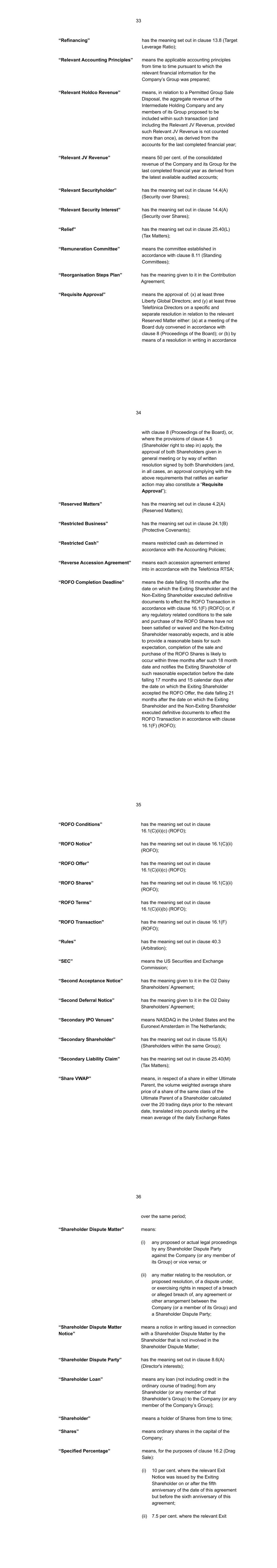 33 “Refinancing” has the meaning set out in clause 13.8 (Target Leverage Ratio); “Relevant Accounting Principles” means the applicable accounting principles from time to time pursuant to which the relevant financial information for the Company’s Group was prepared; “Relevant Holdco Revenue” means, in relation to a Permitted Group Sale Disposal, the aggregate revenue of the Intermediate Holding Company and any members of its Group proposed to be included within such transaction (and including the Relevant JV Revenue, provided such Relevant JV Revenue is not counted more than once), as derived from the accounts for the last completed financial year; “Relevant JV Revenue” means 50 per cent. of the consolidated revenue of the Company and its Group for the last completed financial year as derived from the latest available audited accounts; “Relevant Securityholder” has the meaning set out in clause 14.4(A) (Security over Shares); “Relevant Security Interest” has the meaning set out in clause 14.4(A) (Security over Shares); “Relief” has the meaning set out in clause 25.40(L) (Tax Matters); “Remuneration Committee” means the committee established in accordance with clause 8.11 (Standing Committees); “Reorganisation Steps Plan” has the meaning given to it in the Contribution Agreement; “Requisite Approval” means the approval of: (x) at least three Liberty Global Directors; and (y) at least three Telefónica Directors on a specific and separate resolution in relation to the relevant Reserved Matter either: (a) at a meeting of the Board duly convened in accordance with clause 8 (Proceedings of the Board); or (b) by means of a resolution in writing in accordance 34 with clause 8 (Proceedings of the Board), or, where the provisions of clause 4.5 (Shareholder right to step in) apply, the approval of both Shareholders given in general meeting or by way of written resolution signed by both Shareholders (and, in all cases, an approval complying with the above requirements that ratifies an earlier action may also constitute a “Requisite Approval”); “Reserved Matters” has the meaning set out in clause 4.2(A) (Reserved Matters); “Restricted Business” has the meaning set out in clause 24.1(B) (Protective Covenants); “Restricted Cash” means restricted cash as determined in accordance with the Accounting Policies; “Reverse Accession Agreement” means each accession agreement entered into in accordance with the Telefónica RTSA; “ROFO Completion Deadline” means the date falling 18 months after the date on which the Exiting Shareholder and the Non-Exiting Shareholder executed definitive documents to effect the ROFO Transaction in accordance with clause 16.1(F) (ROFO) or, if any regulatory related conditions to the sale and purchase of the ROFO Shares have not been satisfied or waived and the Non-Exiting Shareholder reasonably expects, and is able to provide a reasonable basis for such expectation, completion of the sale and purchase of the ROFO Shares is likely to occur within three months after such 18 month date and notifies the Exiting Shareholder of such reasonable expectation before the date falling 17 months and 15 calendar days after the date on which the Exiting Shareholder accepted the ROFO Offer, the date falling 21 months after the date on which the Exiting Shareholder and the Non-Exiting Shareholder executed definitive documents to effect the ROFO Transaction in accordance with clause 16.1(F) (ROFO); 35 “ROFO Conditions” has the meaning set out in clause 16.1(C)(ii)(c) (ROFO); “ROFO Notice” has the meaning set out in clause 16.1(C)(ii) (ROFO); “ROFO Offer” has the meaning set out in clause 16.1(C)(ii)(c) (ROFO); “ROFO Shares” has the meaning set out in clause 16.1(C)(ii) (ROFO); “ROFO Terms” has the meaning set out in clause 16.1(C)(ii)(b) (ROFO); "ROFO Transaction" has the meaning set out in clause 16.1(F) (ROFO); “Rules” has the meaning set out in clause 40.3 (Arbitration); “SEC” means the US Securities and Exchange Commission; “Second Acceptance Notice” has the meaning given to it in the O2 Daisy Shareholders’ Agreement; “Second Deferral Notice” has the meaning given to it in the O2 Daisy Shareholders’ Agreement; “Secondary IPO Venues” means NASDAQ in the United States and the Euronext Amsterdam in The Netherlands; “Secondary Shareholder” has the meaning set out in clause 15.8(A) (Shareholders within the same Group); “Secondary Liability Claim” has the meaning set out in clause 25.40(M) (Tax Matters); “Share VWAP” means, in respect of a share in either Ultimate Parent, the volume weighted average share price of a share of the same class of the Ultimate Parent of a Shareholder calculated over the 20 trading days prior to the relevant date, translated into pounds sterling at the mean average of the daily Exchange Rates 36 over the same period; “Shareholder Dispute Matter” means: (i) any proposed or actual legal proceedings by any Shareholder Dispute Party against the Company (or any member of its Group) or vice versa; or (ii) any matter relating to the resolution, or proposed resolution, of a dispute under, or exercising rights in respect of a breach or alleged breach of, any agreement or other arrangement between the Company (or a member of its Group) and a Shareholder Dispute Party; “Shareholder Dispute Matter Notice” means a notice in writing issued in connection with a Shareholder Dispute Matter by the Shareholder that is not involved in the Shareholder Dispute Matter; “Shareholder Dispute Party” has the meaning set out in clause 8.6(A) (Director's interests); “Shareholder Loan” means any loan (not including credit in the ordinary course of trading) from any Shareholder (or any member of that Shareholder’s Group) to the Company (or any member of the Company’s Group); “Shareholder” means a holder of Shares from time to time; “Shares” means ordinary 