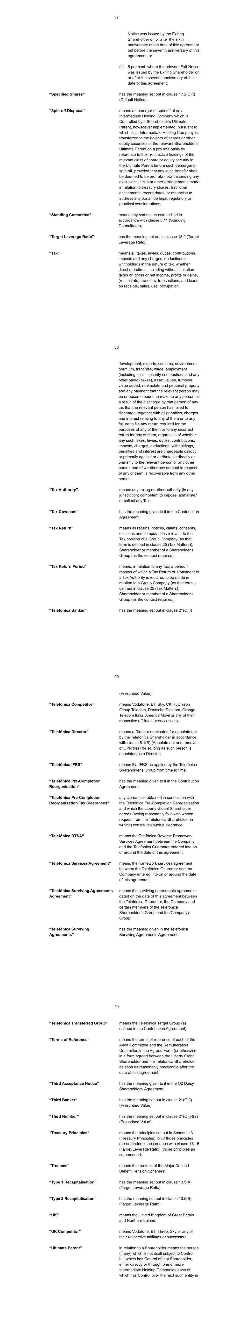 37 Notice was issued by the Exiting Shareholder on or after the sixth anniversary of the date of this agreement but before the seventh anniversary of this agreement; or (iii) 5 per cent. where the relevant Exit Notice was issued by the Exiting Shareholder on or after the seventh anniversary of the date of this agreement; “Specified Shares” has the meaning set out in clause 17.2(E)(i) (Default Notice); “Spin-off Disposal” means a demerger or spin-off of any Intermediate Holding Company which is Controlled by a Shareholder’s Ultimate Parent, howsoever implemented, pursuant to which such Intermediate Holding Company is transferred to the holders of shares or other equity securities of the relevant Shareholder's Ultimate Parent on a pro rata basis by reference to their respective holdings of the relevant class of share or equity security in the Ultimate Parent before such demerger or spin-off, provided that any such transfer shall be deemed to be pro rata notwithstanding any exclusions, limits or other arrangements made in relation to treasury shares, fractional entitlements, record dates, or otherwise to address any bona fide legal, regulatory or practical considerations; “Standing Committee” means any committee established in accordance with clause 8.11 (Standing Committees); “Target Leverage Ratio” has the meaning set out in clause 13.2 (Target Leverage Ratio); “Tax” means all taxes, levies, duties, contributions, imposts and any charges, deductions or withholdings in the nature of tax, whether direct or indirect, including without limitation taxes on gross or net income, profits or gains, (real estate) transfers, transactions, and taxes on receipts, sales, use, occupation, 38 development, exports, customs, environment, premium, franchise, wage, employment (including social security contributions and any other payroll taxes), asset values, turnover, value added, real estate and personal property and any payment that the relevant person may be or become bound to make to any person as a result of the discharge by that person of any tax that the relevant person has failed to discharge, together with all penalties, charges and interest relating to any of them or to any failure to file any return required for the purposes of any of them or to any incorrect return for any of them, regardless of whether any such taxes, levies, duties, contributions, imposts, charges, deductions, withholdings, penalties and interest are chargeable directly or primarily against or attributable directly or primarily to the relevant person or any other person and of whether any amount in respect of any of them is recoverable from any other person; “Tax Authority” means any taxing or other authority (in any jurisdiction) competent to impose, administer or collect any Tax; “Tax Covenant” has the meaning given to it in the Contribution Agreement; “Tax Return” means all returns, notices, claims, consents, elections and computations relevant to the Tax position of a Group Company (as that term is defined in clause 25 (Tax Matters)), Shareholder or member of a Shareholder's Group (as the context requires); “Tax Return Period” means, in relation to any Tax, a period in respect of which a Tax Return or a payment to a Tax Authority is required to be made in relation to a Group Company (as that term is defined in clause 25 (Tax Matters)), Shareholder or member of a Shareholder's Group (as the context requires); “Telefónica Banker” has the meaning set out in clause 21(C)(i) 39 (Prescribed Value); “Telefónica Competitor” means Vodafone, BT, Sky, CK Hutchison Group Telecom, Deutsche Telekom, Orange, Telecom Italia, América Móvil or any of their respective affiliates or successors; “Telefónica Director” means a Director nominated for appointment by the Telefónica Shareholder in accordance with clause 6.1(B) (Appointment and removal of Directors) for so long as such person is appointed as a Director; “Telefónica IFRS” means EU IFRS as applied by the Telefónica Shareholder’s Group from time to time; “Telefónica Pre-Completion Reorganisation” has the meaning given to it in the Contribution Agreement; “Telefónica Pre-Completion Reorganisation Tax Clearances” any clearances obtained in connection with the Telefónica Pre-Completion Reorganisation and which the Liberty Global Shareholder agrees (acting reasonably following written request from the Telefónica Shareholder in writing) constitutes such a clearance; “Telefónica RTSA” means the Telefónica Reverse Framework Services Agreement between the Company and the Telefónica Guarantor entered into on or around the date of this agreement; “Telefónica Services Agreement” means the framework services agreement between the Telefónica Guarantor and the Company entered into on or around the date of this agreement; “Telefónica Surviving Agreements Agreement” means the surviving agreements agreement dated on the date of this agreement between the Telefónica Guarantor, the Company and certain members of the Telefónica Shareholder’s Group and the Company’s Group; “Telefónica Surviving Agreements” has the meaning given in the Telefónica Surviving Agreements Agreement; 40 “Telefónica Transferred Group” means the Telefonica Target Group (as defined in the Contribution Agreement); “Terms of Reference” means the terms of reference of each of the Audit Committee and the Remuneration Committee in the Agreed Form (or otherwise in a form agreed between the Liberty Global Shareholder and the Telefónica Shareholder as soon as reasonably practicable after the date of this agreement); “Third Acceptance Notice” has the meaning given to it in the O2 Daisy Shareholders’ Agreement; “Third Banker” has the meaning set out in clause 21(C)(i) (Prescribed Value); “Third Number” has the meaning set out in clause 21(C)(v)(a) (Prescribed Value); “Treasury Principles” means the principles se