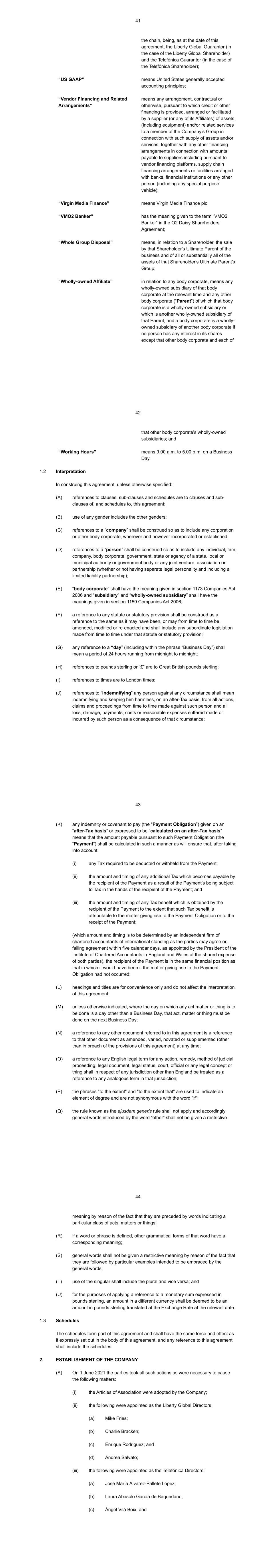 41 the chain, being, as at the date of this agreement, the Liberty Global Guarantor (in the case of the Liberty Global Shareholder) and the Telefónica Guarantor (in the case of the Telefónica Shareholder); “US GAAP” means United States generally accepted accounting principles; “Vendor Financing and Related Arrangements” means any arrangement, contractual or otherwise, pursuant to which credit or other financing is provided, arranged or facilitated by a supplier (or any of its Affiliates) of assets (including equipment) and/or related services to a member of the Company’s Group in connection with such supply of assets and/or services, together with any other financing arrangements in connection with amounts payable to suppliers including pursuant to vendor financing platforms, supply chain financing arrangements or facilities arranged with banks, financial institutions or any other person (including any special purpose vehicle); “Virgin Media Finance” means Virgin Media Finance plc; “VMO2 Banker” has the meaning given to the term “VMO2 Banker” in the O2 Daisy Shareholders’ Agreement; “Whole Group Disposal” means, in relation to a Shareholder, the sale by that Shareholder's Ultimate Parent of the business and of all or substantially all of the assets of that Shareholder's Ultimate Parent's Group; “Wholly-owned Affiliate” in relation to any body corporate, means any wholly-owned subsidiary of that body corporate at the relevant time and any other body corporate (“Parent”) of which that body corporate is a wholly-owned subsidiary or which is another wholly-owned subsidiary of that Parent, and a body corporate is a wholly- owned subsidiary of another body corporate if no person has any interest in its shares except that other body corporate and each of 42 that other body corporate’s wholly-owned subsidiaries; and “Working Hours” means 9.00 a.m. to 5.00 p.m. on a Business Day. 1.2 Interpretation In construing this agreement, unless otherwise specified: (A) references to clauses, sub-clauses and schedules are to clauses and sub- clauses of, and schedules to, this agreement; (B) use of any gender includes the other genders; (C) references to a “company” shall be construed so as to include any corporation or other body corporate, wherever and however incorporated or established; (D) references to a “person” shall be construed so as to include any individual, firm, company, body corporate, government, state or agency of a state, local or municipal authority or government body or any joint venture, association or partnership (whether or not having separate legal personality and including a limited liability partnership); (E) “body corporate” shall have the meaning given in section 1173 Companies Act 2006 and “subsidiary” and “wholly-owned subsidiary” shall have the meanings given in section 1159 Companies Act 2006; (F) a reference to any statute or statutory provision shall be construed as a reference to the same as it may have been, or may from time to time be, amended, modified or re-enacted and shall include any subordinate legislation made from time to time under that statute or statutory provision; (G) any reference to a “day” (including within the phrase “Business Day”) shall mean a period of 24 hours running from midnight to midnight; (H) references to pounds sterling or “£” are to Great British pounds sterling; (I) references to times are to London times; (J) references to “indemnifying” any person against any circumstance shall mean indemnifying and keeping him harmless, on an after-Tax basis, from all actions, claims and proceedings from time to time made against such person and all loss, damage, payments, costs or reasonable expenses suffered made or incurred by such person as a consequence of that circumstance; 43 (K) any indemnity or covenant to pay (the “Payment Obligation”) given on an “after-Tax basis” or expressed to be “calculated on an after-Tax basis” means that the amount payable pursuant to such Payment Obligation (the “Payment”) shall be calculated in such a manner as will ensure that, after taking into account: (i) any Tax required to be deducted or withheld from the Payment; (ii) the amount and timing of any additional Tax which becomes payable by the recipient of the Payment as a result of the Payment’s being subject to Tax in the hands of the recipient of the Payment; and (iii) the amount and timing of any Tax benefit which is obtained by the recipient of the Payment to the extent that such Tax benefit is attributable to the matter giving rise to the Payment Obligation or to the receipt of the Payment; (which amount and timing is to be determined by an independent firm of chartered accountants of international standing as the parties may agree or, failing agreement within five calendar days, as appointed by the President of the Institute of Chartered Accountants in England and Wales at the shared expense of both parties), the recipient of the Payment is in the same financial position as that in which it would have been if the matter giving rise to the Payment Obligation had not occurred; (L) headings and titles are for convenience only and do not affect the interpretation of this agreement; (M) unless otherwise indicated, where the day on which any act matter or thing is to be done is a day other than a Business Day, that act, matter or thing must be done on the next Business Day; (N) a reference to any other document referred to in this agreement is a reference to that other document as amended, varied, novated or supplemented (other than in breach of the provisions of this agreement) at any time; (O) a reference to any English legal term for any action, remedy, method of judicial proceeding, legal document, legal status, court, official or any legal concept or thing shall in respect of any jurisdiction other than England be treated as a reference to any analogous term in t