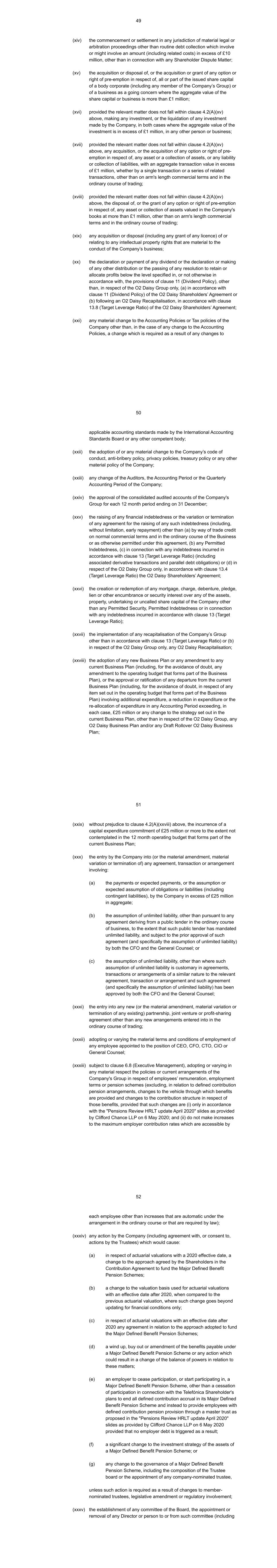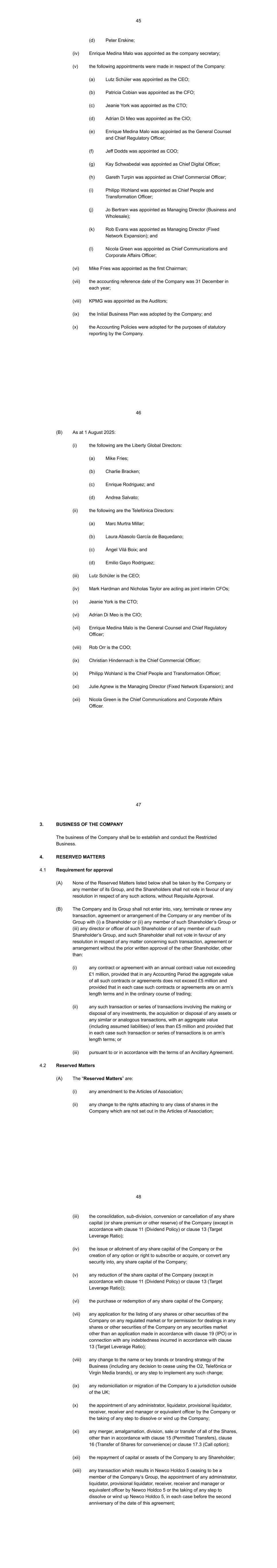 45 (d) Peter Erskine; (iv) Enrique Medina Malo was appointed as the company secretary; (v) the following appointments were made in respect of the Company: (a) Lutz Schüler was appointed as the CEO; (b) Patricia Cobian was appointed as the CFO; (c) Jeanie York was appointed as the CTO; (d) Adrian Di Meo was appointed as the CIO; (e) Enrique Medina Malo was appointed as the General Counsel and Chief Regulatory Officer; (f) Jeff Dodds was appointed as COO; (g) Kay Schwabedal was appointed as Chief Digital Officer; (h) Gareth Turpin was appointed as Chief Commercial Officer; (i) Philipp Wohland was appointed as Chief People and Transformation Officer; (j) Jo Bertram was appointed as Managing Director (Business and Wholesale); (k) Rob Evans was appointed as Managing Director (Fixed Network Expansion); and (l) Nicola Green was appointed as Chief Communications and Corporate Affairs Officer; (vi) Mike Fries was appointed as the first Chairman; (vii) the accounting reference date of the Company was 31 December in each year; (viii) KPMG was appointed as the Auditors; (ix) the Initial Business Plan was adopted by the Company; and (x) the Accounting Policies were adopted for the purposes of statutory reporting by the Company. 46 (B) As at 1 August 2025: (i) the following are the Liberty Global Directors: (a) Mike Fries; (b) Charlie Bracken; (c) Enrique Rodriguez; and (d) Andrea Salvato; (ii) the following are the Telefónica Directors: (a) Marc Murtra Millar; (b) Laura Abasolo García de Baquedano; (c) Ángel Vilá Boix; and (d) Emilio Gayo Rodriguez; (iii) Lutz Schüler is the CEO; (iv) Mark Hardman and Nicholas Taylor are acting as joint interim CFOs; (v) Jeanie York is the CTO; (vi) Adrian Di Meo is the CIO; (vii) Enrique Medina Malo is the General Counsel and Chief Regulatory Officer; (viii) Rob Orr is the COO; (ix) Christian Hindennach is the Chief Commercial Officer; (x) Philipp Wohland is the Chief People and Transformation Officer; (xi) Julie Agnew is the Managing Director (Fixed Network Expansion); and (xii) Nicola Green is the Chief Communications and Corporate Affairs Officer. 47 3. BUSINESS OF THE COMPANY The business of the Company shall be to establish and conduct the Restricted Business. 4. RESERVED MATTERS 4.1 Requirement for approval (A) None of the Reserved Matters listed below shall be taken by the Company or any member of its Group, and the Shareholders shall not vote in favour of any resolution in respect of any such actions, without Requisite Approval. (B) The Company and its Group shall not enter into, vary, terminate or renew any transaction, agreement or arrangement of the Company or any member of its Group with (i) a Shareholder or (ii) any member of such Shareholder’s Group or (iii) any director or officer of such Shareholder or of any member of such Shareholder’s Group, and such Shareholder shall not vote in favour of any resolution in respect of any matter concerning such transaction, agreement or arrangement without the prior written approval of the other Shareholder, other than: (i) any contract or agreement with an annual contract value not exceeding £1 million, provided that in any Accounting Period the aggregate value of all such contracts or agreements does not exceed £5 million and provided that in each case such contracts or agreements are on arm’s length terms and in the ordinary course of trading; (ii) any such transaction or series of transactions involving the making or disposal of any investments, the acquisition or disposal of any assets or any similar or analogous transactions, with an aggregate value (including assumed liabilities) of less than £5 million and provided that in each case such transaction or series of transactions is on arm’s length terms; or (iii) pursuant to or in accordance with the terms of an Ancillary Agreement. 4.2 Reserved Matters (A) The “Reserved Matters” are: (i) any amendment to the Articles of Association; (ii) any change to the rights attaching to any class of shares in the Company which are not set out in the Articles of Association; 48 (iii) the consolidation, sub-division, conversion or cancellation of any share capital (or share premium or other reserve) of the Company (except in accordance with clause 11 (Dividend Policy) or clause 13 (Target Leverage Ratio); (iv) the issue or allotment of any share capital of the Company or the creation of any option or right to subscribe or acquire, or convert any security into, any share capital of the Company; (v) any reduction of the share capital of the Company (except in accordance with clause 11 (Dividend Policy) or clause 13 (Target Leverage Ratio)); (vi) the purchase or redemption of any share capital of the Company; (vii) any application for the listing of any shares or other securities of the Company on any regulated market or for permission for dealings in any shares or other securities of the Company on any securities market other than an application made in accordance with clause 19 (IPO) or in connection with any indebtedness incurred in accordance with clause 13 (Target Leverage Ratio); (viii) any change to the name or key brands or branding strategy of the Business (including any decision to cease using the O2, Telefónica or Virgin Media brands), or any step to implement any such change; (ix) any redomiciliation or migration of the Company to a jurisdiction outside of the UK; (x) the appointment of any administrator, liquidator, provisional liquidator, receiver, receiver and manager or equivalent officer by the Company or the taking of any step to dissolve or wind up the Company; (xi) any merger, amalgamation, division, sale or transfer of all of the Shares, other than in accordance with clause 15 (Permitted Transfers), clause 16 (Transfer of Shares for convenience) or clause 17.3 (Call option); (xii) the repayment of capital or assets of the Company to any Shareholder; (xiii) any transaction which results in Newco Holdco 5 ceasing to be a member of the 