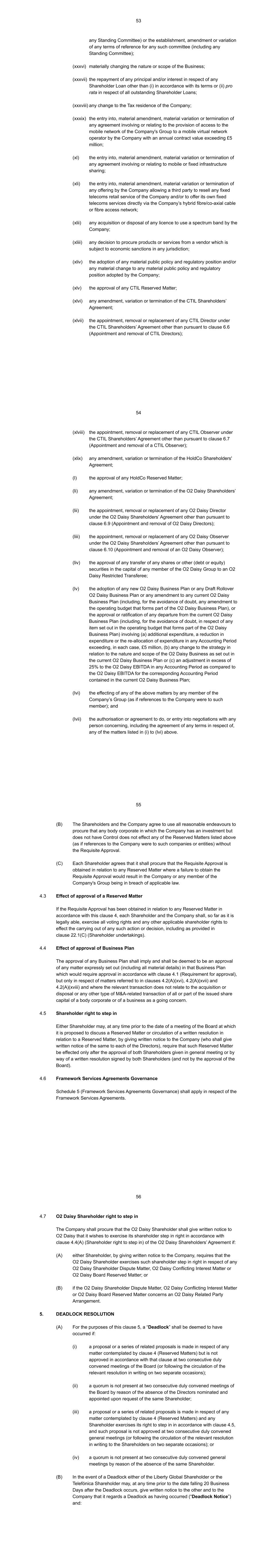 53 any Standing Committee) or the establishment, amendment or variation of any terms of reference for any such committee (including any Standing Committee); (xxxvi) materially changing the nature or scope of the Business; (xxxvii) the repayment of any principal and/or interest in respect of any Shareholder Loan other than (i) in accordance with its terms or (ii) pro rata in respect of all outstanding Shareholder Loans; (xxxviii) any change to the Tax residence of the Company; (xxxix) the entry into, material amendment, material variation or termination of any agreement involving or relating to the provision of access to the mobile network of the Company's Group to a mobile virtual network operator by the Company with an annual contract value exceeding £5 million; (xl) the entry into, material amendment, material variation or termination of any agreement involving or relating to mobile or fixed infrastructure sharing; (xli) the entry into, material amendment, material variation or termination of any offering by the Company allowing a third party to resell any fixed telecoms retail service of the Company and/or to offer its own fixed telecoms services directly via the Company’s hybrid fibre/co-axial cable or fibre access network; (xlii) any acquisition or disposal of any licence to use a spectrum band by the Company; (xliii) any decision to procure products or services from a vendor which is subject to economic sanctions in any jurisdiction; (xliv) the adoption of any material public policy and regulatory position and/or any material change to any material public policy and regulatory position adopted by the Company; (xlv) the approval of any CTIL Reserved Matter; (xlvi) any amendment, variation or termination of the CTIL Shareholders’ Agreement; (xlvii) the appointment, removal or replacement of any CTIL Director under the CTIL Shareholders’ Agreement other than pursuant to clause 6.6 (Appointment and removal of CTIL Directors); 54 (xlviii) the appointment, removal or replacement of any CTIL Observer under the CTIL Shareholders’ Agreement other than pursuant to clause 6.7 (Appointment and removal of a CTIL Observer); (xlix) any amendment, variation or termination of the HoldCo Shareholders' Agreement; (l) the approval of any HoldCo Reserved Matter; (li) any amendment, variation or termination of the O2 Daisy Shareholders’ Agreement; (lii) the appointment, removal or replacement of any O2 Daisy Director under the O2 Daisy Shareholders’ Agreement other than pursuant to clause 6.9 (Appointment and removal of O2 Daisy Directors); (liii) the appointment, removal or replacement of any O2 Daisy Observer under the O2 Daisy Shareholders’ Agreement other than pursuant to clause 6.10 (Appointment and removal of an O2 Daisy Observer); (liv) the approval of any transfer of any shares or other (debt or equity) securities in the capital of any member of the O2 Daisy Group to an O2 Daisy Restricted Transferee; (lv) the adoption of any new O2 Daisy Business Plan or any Draft Rollover O2 Daisy Business Plan or any amendment to any current O2 Daisy Business Plan (including, for the avoidance of doubt, any amendment to the operating budget that forms part of the O2 Daisy Business Plan), or the approval or ratification of any departure from the current O2 Daisy Business Plan (including, for the avoidance of doubt, in respect of any item set out in the operating budget that forms part of the O2 Daisy Business Plan) involving (a) additional expenditure, a reduction in expenditure or the re-allocation of expenditure in any Accounting Period exceeding, in each case, £5 million, (b) any change to the strategy in relation to the nature and scope of the O2 Daisy Business as set out in the current O2 Daisy Business Plan or (c) an adjustment in excess of 25% to the O2 Daisy EBITDA in any Accounting Period as compared to the O2 Daisy EBITDA for the corresponding Accounting Period contained in the current O2 Daisy Business Plan; (lvi) the effecting of any of the above matters by any member of the Company’s Group (as if references to the Company were to such member); and (lvii) the authorisation or agreement to do, or entry into negotiations with any person concerning, including the agreement of any terms in respect of, any of the matters listed in (i) to (lvi) above. 55 (B) The Shareholders and the Company agree to use all reasonable endeavours to procure that any body corporate in which the Company has an investment but does not have Control does not effect any of the Reserved Matters listed above (as if references to the Company were to such companies or entities) without the Requisite Approval. (C) Each Shareholder agrees that it shall procure that the Requisite Approval is obtained in relation to any Reserved Matter where a failure to obtain the Requisite Approval would result in the Company or any member of the Company's Group being in breach of applicable law. 4.3 Effect of approval of a Reserved Matter If the Requisite Approval has been obtained in relation to any Reserved Matter in accordance with this clause 4, each Shareholder and the Company shall, so far as it is legally able, exercise all voting rights and any other applicable shareholder rights to effect the carrying out of any such action or decision, including as provided in clause 22.1(C) (Shareholder undertakings). 4.4 Effect of approval of Business Plan The approval of any Business Plan shall imply and shall be deemed to be an approval of any matter expressly set out (including all material details) in that Business Plan which would require approval in accordance with clause 4.1 (Requirement for approval), but only in respect of matters referred to in clauses 4.2(A)(xvi), 4.2(A)(xvii) and 4.2(A)(xviii) and where the relevant transaction does not relate to the acquisition or disposal or any other type of M&A-related transaction of all or part of the issued share capital of a body corporate or of a business as a going concern. 4.5 Shar