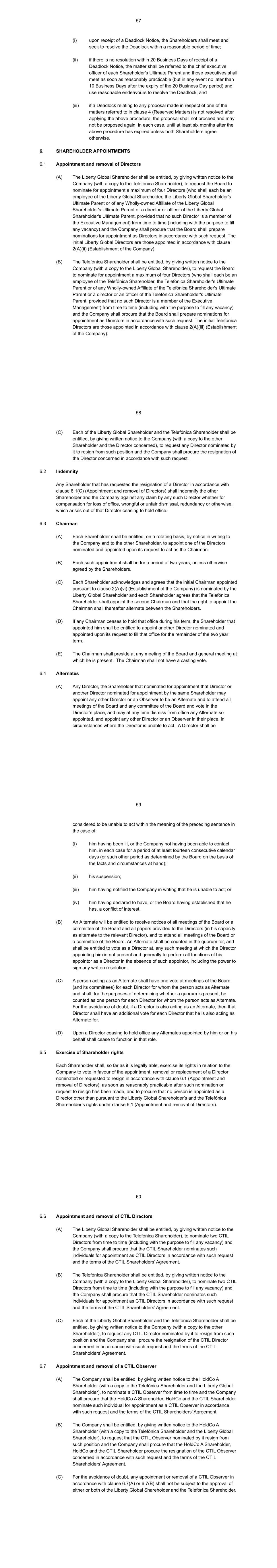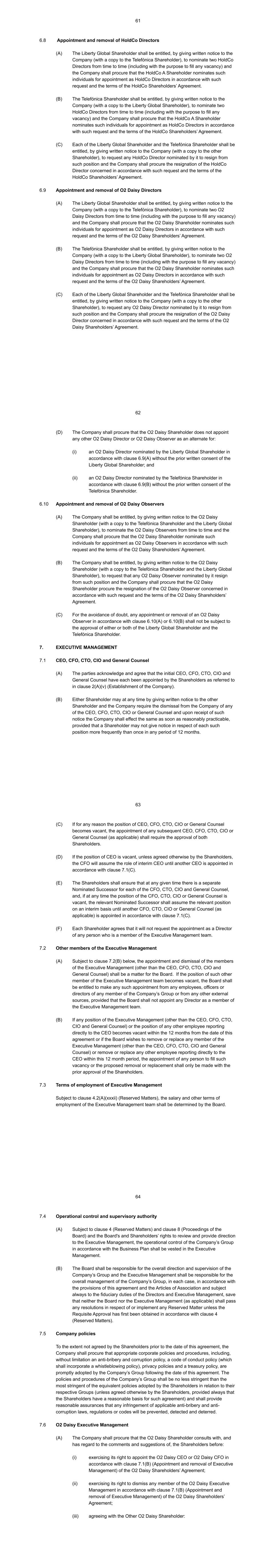 61 6.8 Appointment and removal of HoldCo Directors (A) The Liberty Global Shareholder shall be entitled, by giving written notice to the Company (with a copy to the Telefónica Shareholder), to nominate two HoldCo Directors from time to time (including with the purpose to fill any vacancy) and the Company shall procure that the HoldCo A Shareholder nominates such individuals for appointment as HoldCo Directors in accordance with such request and the terms of the HoldCo Shareholders’ Agreement. (B) The Telefónica Shareholder shall be entitled, by giving written notice to the Company (with a copy to the Liberty Global Shareholder), to nominate two HoldCo Directors from time to time (including with the purpose to fill any vacancy) and the Company shall procure that the HoldCo A Shareholder nominates such individuals for appointment as HoldCo Directors in accordance with such request and the terms of the HoldCo Shareholders’ Agreement. (C) Each of the Liberty Global Shareholder and the Telefónica Shareholder shall be entitled, by giving written notice to the Company (with a copy to the other Shareholder), to request any HoldCo Director nominated by it to resign from such position and the Company shall procure the resignation of the HoldCo Director concerned in accordance with such request and the terms of the HoldCo Shareholders’ Agreement. 6.9 Appointment and removal of O2 Daisy Directors (A) The Liberty Global Shareholder shall be entitled, by giving written notice to the Company (with a copy to the Telefónica Shareholder), to nominate two O2 Daisy Directors from time to time (including with the purpose to fill any vacancy) and the Company shall procure that the O2 Daisy Shareholder nominates such individuals for appointment as O2 Daisy Directors in accordance with such request and the terms of the O2 Daisy Shareholders’ Agreement. (B) The Telefónica Shareholder shall be entitled, by giving written notice to the Company (with a copy to the Liberty Global Shareholder), to nominate two O2 Daisy Directors from time to time (including with the purpose to fill any vacancy) and the Company shall procure that the O2 Daisy Shareholder nominates such individuals for appointment as O2 Daisy Directors in accordance with such request and the terms of the O2 Daisy Shareholders’ Agreement. (C) Each of the Liberty Global Shareholder and the Telefónica Shareholder shall be entitled, by giving written notice to the Company (with a copy to the other Shareholder), to request any O2 Daisy Director nominated by it to resign from such position and the Company shall procure the resignation of the O2 Daisy Director concerned in accordance with such request and the terms of the O2 Daisy Shareholders’ Agreement. 62 (D) The Company shall procure that the O2 Daisy Shareholder does not appoint any other O2 Daisy Director or O2 Daisy Observer as an alternate for: (i) an O2 Daisy Director nominated by the Liberty Global Shareholder in accordance with clause 6.9(A) without the prior written consent of the Liberty Global Shareholder; and (ii) an O2 Daisy Director nominated by the Telefónica Shareholder in accordance with clause 6.9(B) without the prior written consent of the Telefónica Shareholder. 6.10 Appointment and removal of O2 Daisy Observers (A) The Company shall be entitled, by giving written notice to the O2 Daisy Shareholder (with a copy to the Telefónica Shareholder and the Liberty Global Shareholder), to nominate the O2 Daisy Observers from time to time and the Company shall procure that the O2 Daisy Shareholder nominate such individuals for appointment as O2 Daisy Observers in accordance with such request and the terms of the O2 Daisy Shareholders’ Agreement. (B) The Company shall be entitled, by giving written notice to the O2 Daisy Shareholder (with a copy to the Telefónica Shareholder and the Liberty Global Shareholder), to request that any O2 Daisy Observer nominated by it resign from such position and the Company shall procure that the O2 Daisy Shareholder procure the resignation of the O2 Daisy Observer concerned in accordance with such request and the terms of the O2 Daisy Shareholders’ Agreement. (C) For the avoidance of doubt, any appointment or removal of an O2 Daisy Observer in accordance with clause 6.10(A) or 6.10(B) shall not be subject to the approval of either or both of the Liberty Global Shareholder and the Telefónica Shareholder. 7. EXECUTIVE MANAGEMENT 7.1 CEO, CFO, CTO, CIO and General Counsel (A) The parties acknowledge and agree that the initial CEO, CFO, CTO, CIO and General Counsel have each been appointed by the Shareholders as referred to in clause 2(A)(v) (Establishment of the Company). (B) Either Shareholder may at any time by giving written notice to the other Shareholder and the Company require the dismissal from the Company of any of the CEO, CFO, CTO, CIO or General Counsel and upon receipt of such notice the Company shall effect the same as soon as reasonably practicable, provided that a Shareholder may not give notice in respect of each such position more frequently than once in any period of 12 months. 63 (C) If for any reason the position of CEO, CFO, CTO, CIO or General Counsel becomes vacant, the appointment of any subsequent CEO, CFO, CTO, CIO or General Counsel (as applicable) shall require the approval of both Shareholders. (D) If the position of CEO is vacant, unless agreed otherwise by the Shareholders, the CFO will assume the role of interim CEO until another CEO is appointed in accordance with clause 7.1(C). (E) The Shareholders shall ensure that at any given time there is a separate Nominated Successor for each of the CFO, CTO, CIO and General Counsel, and, if at any time the position of the CFO, CTO, CIO or General Counsel is vacant, the relevant Nominated Successor shall assume the relevant position on an interim basis until another CFO, CTO, CIO or General Counsel (as applicable) is appointed in accordance with clause 7.1(C). (F) Each