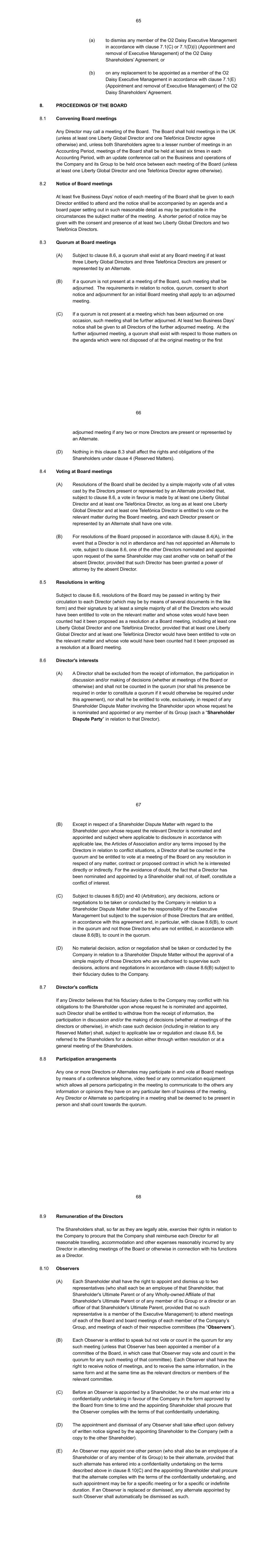 65 (a) to dismiss any member of the O2 Daisy Executive Management in accordance with clause 7.1(C) or 7.1(D)(i) (Appointment and removal of Executive Management) of the O2 Daisy Shareholders’ Agreement; or (b) on any replacement to be appointed as a member of the O2 Daisy Executive Management in accordance with clause 7.1(E) (Appointment and removal of Executive Management) of the O2 Daisy Shareholders’ Agreement. 8. PROCEEDINGS OF THE BOARD 8.1 Convening Board meetings Any Director may call a meeting of the Board. The Board shall hold meetings in the UK (unless at least one Liberty Global Director and one Telefónica Director agree otherwise) and, unless both Shareholders agree to a lesser number of meetings in an Accounting Period, meetings of the Board shall be held at least six times in each Accounting Period, with an update conference call on the Business and operations of the Company and its Group to be held once between each meeting of the Board (unless at least one Liberty Global Director and one Telefónica Director agree otherwise). 8.2 Notice of Board meetings At least five Business Days’ notice of each meeting of the Board shall be given to each Director entitled to attend and the notice shall be accompanied by an agenda and a board paper setting out in such reasonable detail as may be practicable in the circumstances the subject matter of the meeting. A shorter period of notice may be given with the consent and presence of at least two Liberty Global Directors and two Telefónica Directors. 8.3 Quorum at Board meetings (A) Subject to clause 8.6, a quorum shall exist at any Board meeting if at least three Liberty Global Directors and three Telefónica Directors are present or represented by an Alternate. (B) If a quorum is not present at a meeting of the Board, such meeting shall be adjourned. The requirements in relation to notice, quorum, consent to short notice and adjournment for an initial Board meeting shall apply to an adjourned meeting. (C) If a quorum is not present at a meeting which has been adjourned on one occasion, such meeting shall be further adjourned. At least two Business Days’ notice shall be given to all Directors of the further adjourned meeting. At the further adjourned meeting, a quorum shall exist with respect to those matters on the agenda which were not disposed of at the original meeting or the first 66 adjourned meeting if any two or more Directors are present or represented by an Alternate. (D) Nothing in this clause 8.3 shall affect the rights and obligations of the Shareholders under clause 4 (Reserved Matters). 8.4 Voting at Board meetings (A) Resolutions of the Board shall be decided by a simple majority vote of all votes cast by the Directors present or represented by an Alternate provided that, subject to clause 8.6, a vote in favour is made by at least one Liberty Global Director and at least one Telefónica Director, as long as at least one Liberty Global Director and at least one Telefónica Director is entitled to vote on the relevant matter during the Board meeting, and each Director present or represented by an Alternate shall have one vote. (B) For resolutions of the Board proposed in accordance with clause 8.4(A), in the event that a Director is not in attendance and has not appointed an Alternate to vote, subject to clause 8.6, one of the other Directors nominated and appointed upon request of the same Shareholder may cast another vote on behalf of the absent Director, provided that such Director has been granted a power of attorney by the absent Director. 8.5 Resolutions in writing Subject to clause 8.6, resolutions of the Board may be passed in writing by their circulation to each Director (which may be by means of several documents in the like form) and their signature by at least a simple majority of all of the Directors who would have been entitled to vote on the relevant matter and whose votes would have been counted had it been proposed as a resolution at a Board meeting, including at least one Liberty Global Director and one Telefónica Director, provided that at least one Liberty Global Director and at least one Telefónica Director would have been entitled to vote on the relevant matter and whose vote would have been counted had it been proposed as a resolution at a Board meeting. 8.6 Director's interests (A) A Director shall be excluded from the receipt of information, the participation in discussion and/or making of decisions (whether at meetings of the Board or otherwise) and shall not be counted in the quorum (nor shall his presence be required in order to constitute a quorum if it would otherwise be required under this agreement), nor shall he be entitled to vote, exclusively, in respect of any Shareholder Dispute Matter involving the Shareholder upon whose request he is nominated and appointed or any member of its Group (each a “Shareholder Dispute Party” in relation to that Director). 67 (B) Except in respect of a Shareholder Dispute Matter with regard to the Shareholder upon whose request the relevant Director is nominated and appointed and subject where applicable to disclosure in accordance with applicable law, the Articles of Association and/or any terms imposed by the Directors in relation to conflict situations, a Director shall be counted in the quorum and be entitled to vote at a meeting of the Board on any resolution in respect of any matter, contract or proposed contract in which he is interested directly or indirectly. For the avoidance of doubt, the fact that a Director has been nominated and appointed by a Shareholder shall not, of itself, constitute a conflict of interest. (C) Subject to clauses 8.6(D) and 40 (Arbitration), any decisions, actions or negotiations to be taken or conducted by the Company in relation to a Shareholder Dispute Matter shall be the responsibility of the Executive Management but subject to the supervision of those Directors that are entitled, in accordance with thi