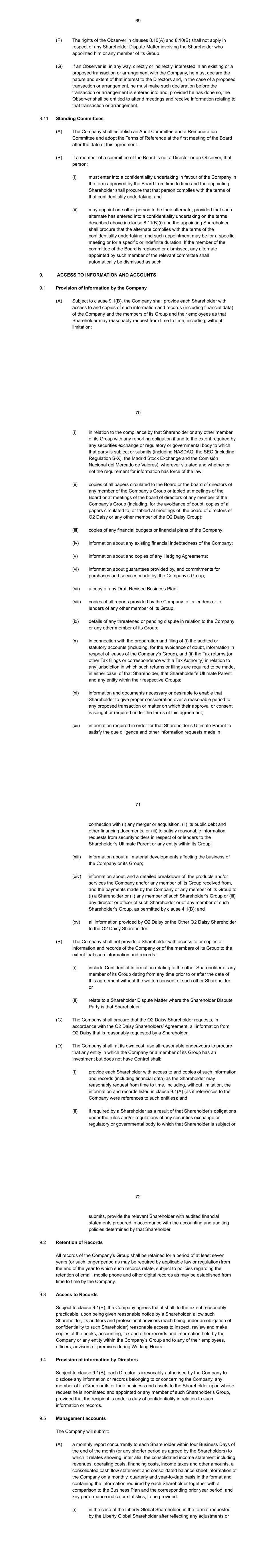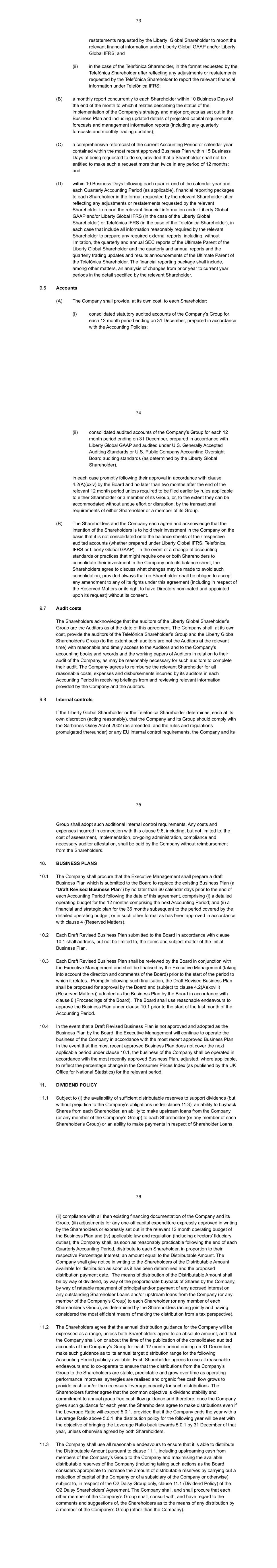 73 restatements requested by the Liberty Global Shareholder to report the relevant financial information under Liberty Global GAAP and/or Liberty Global IFRS; and (ii) in the case of the Telefónica Shareholder, in the format requested by the Telefónica Shareholder after reflecting any adjustments or restatements requested by the Telefónica Shareholder to report the relevant financial information under Telefónica IFRS; (B) a monthly report concurrently to each Shareholder within 10 Business Days of the end of the month to which it relates describing the status of the implementation of the Company’s strategy and major projects as set out in the Business Plan and including updated details of projected capital requirements, forecasts and management information reports (including any quarterly forecasts and monthly trading updates); (C) a comprehensive reforecast of the current Accounting Period or calendar year contained within the most recent approved Business Plan within 15 Business Days of being requested to do so, provided that a Shareholder shall not be entitled to make such a request more than twice in any period of 12 months; and (D) within 10 Business Days following each quarter end of the calendar year and each Quarterly Accounting Period (as applicable), financial reporting packages to each Shareholder in the format requested by the relevant Shareholder after reflecting any adjustments or restatements requested by the relevant Shareholder to report the relevant financial information under Liberty Global GAAP and/or Liberty Global IFRS (in the case of the Liberty Global Shareholder) or Telefónica IFRS (in the case of the Telefónica Shareholder), in each case that include all information reasonably required by the relevant Shareholder to prepare any required external reports, including, without limitation, the quarterly and annual SEC reports of the Ultimate Parent of the Liberty Global Shareholder and the quarterly and annual reports and the quarterly trading updates and results announcements of the Ultimate Parent of the Telefónica Shareholder. The financial reporting package shall include, among other matters, an analysis of changes from prior year to current year periods in the detail specified by the relevant Shareholder. 9.6 Accounts (A) The Company shall provide, at its own cost, to each Shareholder: (i) consolidated statutory audited accounts of the Company’s Group for each 12 month period ending on 31 December, prepared in accordance with the Accounting Policies; 74 (ii) consolidated audited accounts of the Company’s Group for each 12 month period ending on 31 December, prepared in accordance with Liberty Global GAAP and audited under U.S. Generally Accepted Auditing Standards or U.S. Public Company Accounting Oversight Board auditing standards (as determined by the Liberty Global Shareholder), in each case promptly following their approval in accordance with clause 4.2(A)(xxiv) by the Board and no later than two months after the end of the relevant 12 month period unless required to be filed earlier by rules applicable to either Shareholder or a member of its Group, or, to the extent they can be accommodated without undue effort or disruption, by the transactional requirements of either Shareholder or a member of its Group. (B) The Shareholders and the Company each agree and acknowledge that the intention of the Shareholders is to hold their investment in the Company on the basis that it is not consolidated onto the balance sheets of their respective audited accounts (whether prepared under Liberty Global IFRS, Telefónica IFRS or Liberty Global GAAP). In the event of a change of accounting standards or practices that might require one or both Shareholders to consolidate their investment in the Company onto its balance sheet, the Shareholders agree to discuss what changes may be made to avoid such consolidation, provided always that no Shareholder shall be obliged to accept any amendment to any of its rights under this agreement (including in respect of the Reserved Matters or its right to have Directors nominated and appointed upon its request) without its consent. 9.7 Audit costs The Shareholders acknowledge that the auditors of the Liberty Global Shareholder’s Group are the Auditors as at the date of this agreement. The Company shall, at its own cost, provide the auditors of the Telefónica Shareholder’s Group and the Liberty Global Shareholder's Group (to the extent such auditors are not the Auditors at the relevant time) with reasonable and timely access to the Auditors and to the Company’s accounting books and records and the working papers of Auditors in relation to their audit of the Company, as may be reasonably necessary for such auditors to complete their audit. The Company agrees to reimburse the relevant Shareholder for all reasonable costs, expenses and disbursements incurred by its auditors in each Accounting Period in receiving briefings from and reviewing relevant information provided by the Company and the Auditors. 9.8 Internal controls If the Liberty Global Shareholder or the Telefónica Shareholder determines, each at its own discretion (acting reasonably), that the Company and its Group should comply with the Sarbanes-Oxley Act of 2002 (as amended, and the rules and regulations promulgated thereunder) or any EU internal control requirements, the Company and its 75 Group shall adopt such additional internal control requirements. Any costs and expenses incurred in connection with this clause 9.8, including, but not limited to, the cost of assessment, implementation, on-going administration, compliance and necessary auditor attestation, shall be paid by the Company without reimbursement from the Shareholders. 10. BUSINESS PLANS 10.1 The Company shall procure that the Executive Management shall prepare a draft Business Plan which is submitted to the Board to replace the existing Business Plan (a “Draft Revised Business Plan”) by no l