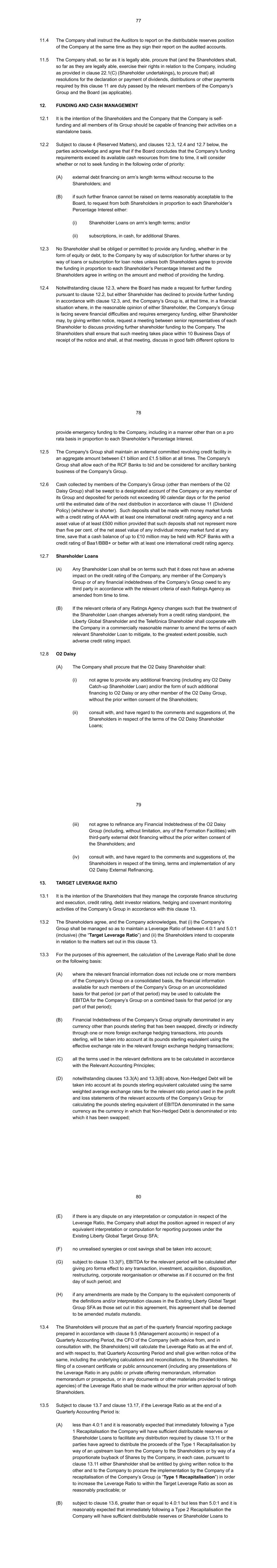 77 11.4 The Company shall instruct the Auditors to report on the distributable reserves position of the Company at the same time as they sign their report on the audited accounts. 11.5 The Company shall, so far as it is legally able, procure that (and the Shareholders shall, so far as they are legally able, exercise their rights in relation to the Company, including as provided in clause 22.1(C) (Shareholder undertakings), to procure that) all resolutions for the declaration or payment of dividends, distributions or other payments required by this clause 11 are duly passed by the relevant members of the Company’s Group and the Board (as applicable). 12. FUNDING AND CASH MANAGEMENT 12.1 It is the intention of the Shareholders and the Company that the Company is self- funding and all members of its Group should be capable of financing their activities on a standalone basis. 12.2 Subject to clause 4 (Reserved Matters), and clauses 12.3, 12.4 and 12.7 below, the parties acknowledge and agree that if the Board concludes that the Company's funding requirements exceed its available cash resources from time to time, it will consider whether or not to seek funding in the following order of priority: (A) external debt financing on arm’s length terms without recourse to the Shareholders; and (B) if such further finance cannot be raised on terms reasonably acceptable to the Board, to request from both Shareholders in proportion to each Shareholder’s Percentage Interest either: (i) Shareholder Loans on arm’s length terms; and/or (ii) subscriptions, in cash, for additional Shares. 12.3 No Shareholder shall be obliged or permitted to provide any funding, whether in the form of equity or debt, to the Company by way of subscription for further shares or by way of loans or subscription for loan notes unless both Shareholders agree to provide the funding in proportion to each Shareholder’s Percentage Interest and the Shareholders agree in writing on the amount and method of providing the funding. 12.4 Notwithstanding clause 12.3, where the Board has made a request for further funding pursuant to clause 12.2, but either Shareholder has declined to provide further funding in accordance with clause 12.3, and, the Company’s Group is, at that time, in a financial situation where, in the reasonable opinion of either Shareholder, the Company’s Group is facing severe financial difficulties and requires emergency funding, either Shareholder may, by giving written notice, request a meeting between senior representatives of each Shareholder to discuss providing further shareholder funding to the Company. The Shareholders shall ensure that such meeting takes place within 10 Business Days of receipt of the notice and shall, at that meeting, discuss in good faith different options to 78 provide emergency funding to the Company, including in a manner other than on a pro rata basis in proportion to each Shareholder’s Percentage Interest. 12.5 The Company's Group shall maintain an external committed revolving credit facility in an aggregate amount between £1 billion and £1.5 billion at all times. The Company's Group shall allow each of the RCF Banks to bid and be considered for ancillary banking business of the Company's Group. 12.6 Cash collected by members of the Company’s Group (other than members of the O2 Daisy Group) shall be swept to a designated account of the Company or any member of its Group and deposited for periods not exceeding 90 calendar days or for the period until the estimated date of the next distribution in accordance with clause 11 (Dividend Policy) (whichever is shorter). Such deposits shall be made with money market funds with a credit rating of AAA with at least one international credit rating agency and a net asset value of at least £500 million provided that such deposits shall not represent more than five per cent. of the net asset value of any individual money market fund at any time, save that a cash balance of up to £10 million may be held with RCF Banks with a credit rating of Baa1/BBB+ or better with at least one international credit rating agency. 12.7 Shareholder Loans (A) Any Shareholder Loan shall be on terms such that it does not have an adverse impact on the credit rating of the Company, any member of the Company’s Group or of any financial indebtedness of the Company’s Group owed to any third party in accordance with the relevant criteria of each Ratings Agency as amended from time to time. (B) If the relevant criteria of any Ratings Agency changes such that the treatment of the Shareholder Loan changes adversely from a credit rating standpoint, the Liberty Global Shareholder and the Telefónica Shareholder shall cooperate with the Company in a commercially reasonable manner to amend the terms of each relevant Shareholder Loan to mitigate, to the greatest extent possible, such adverse credit rating impact. 12.8 O2 Daisy (A) The Company shall procure that the O2 Daisy Shareholder shall: (i) not agree to provide any additional financing (including any O2 Daisy Catch-up Shareholder Loan) and/or the form of such additional financing to O2 Daisy or any other member of the O2 Daisy Group, without the prior written consent of the Shareholders; (ii) consult with, and have regard to the comments and suggestions of, the Shareholders in respect of the terms of the O2 Daisy Shareholder Loans; 79 (iii) not agree to refinance any Financial Indebtedness of the O2 Daisy Group (including, without limitation, any of the Formation Facilities) with third-party external debt financing without the prior written consent of the Shareholders; and (iv) consult with, and have regard to the comments and suggestions of, the Shareholders in respect of the timing, terms and implementation of any O2 Daisy External Refinancing. 13. TARGET LEVERAGE RATIO 13.1 It is the intention of the Shareholders that they manage the corporate finance structuring and execution, credit rating, debt investor