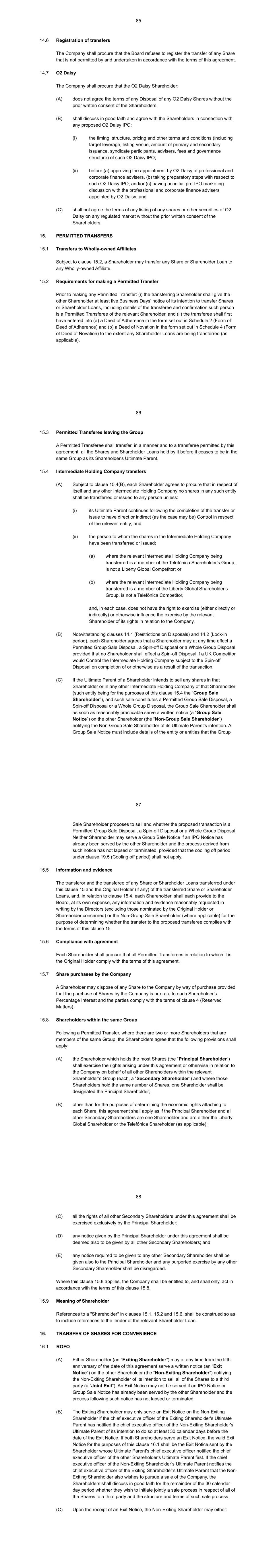 85 14.6 Registration of transfers The Company shall procure that the Board refuses to register the transfer of any Share that is not permitted by and undertaken in accordance with the terms of this agreement. 14.7 O2 Daisy The Company shall procure that the O2 Daisy Shareholder: (A) does not agree the terms of any Disposal of any O2 Daisy Shares without the prior written consent of the Shareholders; (B) shall discuss in good faith and agree with the Shareholders in connection with any proposed O2 Daisy IPO: (i) the timing, structure, pricing and other terms and conditions (including target leverage, listing venue, amount of primary and secondary issuance, syndicate participants, advisers, fees and governance structure) of such O2 Daisy IPO; (ii) before (a) approving the appointment by O2 Daisy of professional and corporate finance advisers, (b) taking preparatory steps with respect to such O2 Daisy IPO; and/or (c) having an initial pre-IPO marketing discussion with the professional and corporate finance advisers appointed by O2 Daisy; and (C) shall not agree the terms of any listing of any shares or other securities of O2 Daisy on any regulated market without the prior written consent of the Shareholders. 15. PERMITTED TRANSFERS 15.1 Transfers to Wholly-owned Affiliates Subject to clause 15.2, a Shareholder may transfer any Share or Shareholder Loan to any Wholly-owned Affiliate. 15.2 Requirements for making a Permitted Transfer Prior to making any Permitted Transfer: (i) the transferring Shareholder shall give the other Shareholder at least five Business Days’ notice of its intention to transfer Shares or Shareholder Loans, including details of the transferee and confirmation such person is a Permitted Transferee of the relevant Shareholder, and (ii) the transferee shall first have entered into (a) a Deed of Adherence in the form set out in Schedule 2 (Form of Deed of Adherence) and (b) a Deed of Novation in the form set out in Schedule 4 (Form of Deed of Novation) to the extent any Shareholder Loans are being transferred (as applicable). 86 15.3 Permitted Transferee leaving the Group A Permitted Transferee shall transfer, in a manner and to a transferee permitted by this agreement, all the Shares and Shareholder Loans held by it before it ceases to be in the same Group as its Shareholder's Ultimate Parent. 15.4 Intermediate Holding Company transfers (A) Subject to clause 15.4(B), each Shareholder agrees to procure that in respect of itself and any other Intermediate Holding Company no shares in any such entity shall be transferred or issued to any person unless: (i) its Ultimate Parent continues following the completion of the transfer or issue to have direct or indirect (as the case may be) Control in respect of the relevant entity; and (ii) the person to whom the shares in the Intermediate Holding Company have been transferred or issued: (a) where the relevant Intermediate Holding Company being transferred is a member of the Telefónica Shareholder's Group, is not a Liberty Global Competitor; or (b) where the relevant Intermediate Holding Company being transferred is a member of the Liberty Global Shareholder's Group, is not a Telefónica Competitor, and, in each case, does not have the right to exercise (either directly or indirectly) or otherwise influence the exercise by the relevant Shareholder of its rights in relation to the Company. (B) Notwithstanding clauses 14.1 (Restrictions on Disposals) and 14.2 (Lock-in period), each Shareholder agrees that a Shareholder may at any time effect a Permitted Group Sale Disposal, a Spin-off Disposal or a Whole Group Disposal provided that no Shareholder shall effect a Spin-off Disposal if a UK Competitor would Control the Intermediate Holding Company subject to the Spin-off Disposal on completion of or otherwise as a result of the transaction. (C) If the Ultimate Parent of a Shareholder intends to sell any shares in that Shareholder or in any other Intermediate Holding Company of that Shareholder (such entity being for the purposes of this clause 15.4 the “Group Sale Shareholder”), and such sale constitutes a Permitted Group Sale Disposal, a Spin-off Disposal or a Whole Group Disposal, the Group Sale Shareholder shall as soon as reasonably practicable serve a written notice (a “Group Sale Notice”) on the other Shareholder (the “Non-Group Sale Shareholder”) notifying the Non-Group Sale Shareholder of its Ultimate Parent’s intention. A Group Sale Notice must include details of the entity or entities that the Group 87 Sale Shareholder proposes to sell and whether the proposed transaction is a Permitted Group Sale Disposal, a Spin-off Disposal or a Whole Group Disposal. Neither Shareholder may serve a Group Sale Notice if an IPO Notice has already been served by the other Shareholder and the process derived from such notice has not lapsed or terminated, provided that the cooling off period under clause 19.5 (Cooling off period) shall not apply. 15.5 Information and evidence The transferor and the transferee of any Share or Shareholder Loans transferred under this clause 15 and the Original Holder (if any) of the transferred Share or Shareholder Loans, and, in relation to clause 15.4, each Shareholder, shall each provide to the Board, at its own expense, any information and evidence reasonably requested in writing by the Directors (excluding those nominated by the Original Holder or Shareholder concerned) or the Non-Group Sale Shareholder (where applicable) for the purpose of determining whether the transfer to the proposed transferee complies with the terms of this clause 15. 15.6 Compliance with agreement Each Shareholder shall procure that all Permitted Transferees in relation to which it is the Original Holder comply with the terms of this agreement. 15.7 Share purchases by the Company A Shareholder may dispose of any Share to the Company by way of purchase provided that the purchase of Shares by the Company is pro rata to ea