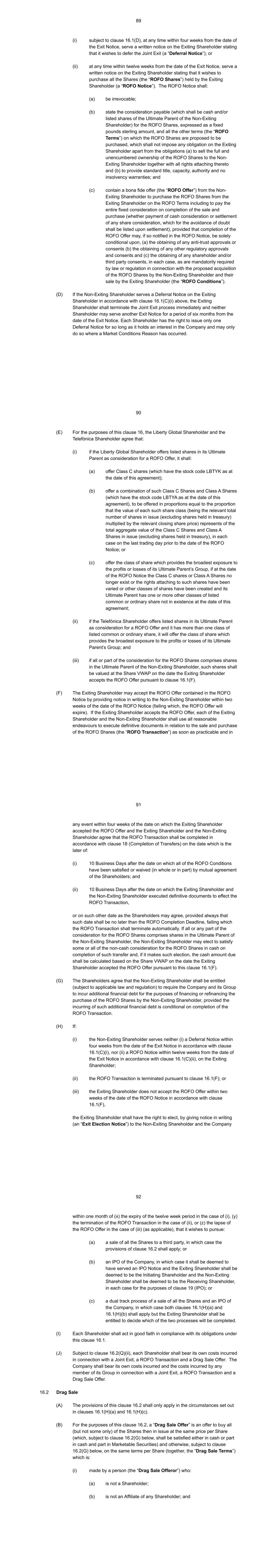 89 (i) subject to clause 16.1(D), at any time within four weeks from the date of the Exit Notice, serve a written notice on the Exiting Shareholder stating that it wishes to defer the Joint Exit (a “Deferral Notice”); or (ii) at any time within twelve weeks from the date of the Exit Notice, serve a written notice on the Exiting Shareholder stating that it wishes to purchase all the Shares (the “ROFO Shares”) held by the Exiting Shareholder (a “ROFO Notice”). The ROFO Notice shall: (a) be irrevocable; (b) state the consideration payable (which shall be cash and/or listed shares of the Ultimate Parent of the Non-Exiting Shareholder) for the ROFO Shares, expressed as a fixed pounds sterling amount, and all the other terms (the “ROFO Terms”) on which the ROFO Shares are proposed to be purchased, which shall not impose any obligation on the Exiting Shareholder apart from the obligations (a) to sell the full and unencumbered ownership of the ROFO Shares to the Non- Exiting Shareholder together with all rights attaching thereto and (b) to provide standard title, capacity, authority and no insolvency warranties; and (c) contain a bona fide offer (the “ROFO Offer”) from the Non- Exiting Shareholder to purchase the ROFO Shares from the Exiting Shareholder on the ROFO Terms including to pay the entire fixed consideration on completion of the sale and purchase (whether payment of cash consideration or settlement of any share consideration, which for the avoidance of doubt shall be listed upon settlement), provided that completion of the ROFO Offer may, if so notified in the ROFO Notice, be solely conditional upon, (a) the obtaining of any anti-trust approvals or consents (b) the obtaining of any other regulatory approvals and consents and (c) the obtaining of any shareholder and/or third party consents, in each case, as are mandatorily required by law or regulation in connection with the proposed acquisition of the ROFO Shares by the Non-Exiting Shareholder and their sale by the Exiting Shareholder (the “ROFO Conditions”). (D) If the Non-Exiting Shareholder serves a Deferral Notice on the Exiting Shareholder in accordance with clause 16.1(C)(i) above, the Exiting Shareholder shall terminate the Joint Exit process immediately and neither Shareholder may serve another Exit Notice for a period of six months from the date of the Exit Notice. Each Shareholder has the right to issue only one Deferral Notice for so long as it holds an interest in the Company and may only do so where a Market Conditions Reason has occurred. 90 (E) For the purposes of this clause 16, the Liberty Global Shareholder and the Telefónica Shareholder agree that: (i) if the Liberty Global Shareholder offers listed shares in its Ultimate Parent as consideration for a ROFO Offer, it shall: (a) offer Class C shares (which have the stock code LBTYK as at the date of this agreement); (b) offer a combination of such Class C Shares and Class A Shares (which have the stock code LBTYA as at the date of this agreement), to be offered in proportions equal to the proportion that the value of each such share class (being the relevant total number of shares in issue (excluding shares held in treasury) multiplied by the relevant closing share price) represents of the total aggregate value of the Class C Shares and Class A Shares in issue (excluding shares held in treasury), in each case on the last trading day prior to the date of the ROFO Notice; or (c) offer the class of share which provides the broadest exposure to the profits or losses of its Ultimate Parent’s Group, if at the date of the ROFO Notice the Class C shares or Class A Shares no longer exist or the rights attaching to such shares have been varied or other classes of shares have been created and its Ultimate Parent has one or more other classes of listed common or ordinary share not in existence at the date of this agreement; (ii) if the Telefónica Shareholder offers listed shares in its Ultimate Parent as consideration for a ROFO Offer and it has more than one class of listed common or ordinary share, it will offer the class of share which provides the broadest exposure to the profits or losses of its Ultimate Parent’s Group; and (iii) if all or part of the consideration for the ROFO Shares comprises shares in the Ultimate Parent of the Non-Exiting Shareholder, such shares shall be valued at the Share VWAP on the date the Exiting Shareholder accepts the ROFO Offer pursuant to clause 16.1(F). (F) The Exiting Shareholder may accept the ROFO Offer contained in the ROFO Notice by providing notice in writing to the Non-Exiting Shareholder within two weeks of the date of the ROFO Notice (failing which, the ROFO Offer will expire). If the Exiting Shareholder accepts the ROFO Offer, each of the Exiting Shareholder and the Non-Exiting Shareholder shall use all reasonable endeavours to execute definitive documents in relation to the sale and purchase of the ROFO Shares (the “ROFO Transaction”) as soon as practicable and in 91 any event within four weeks of the date on which the Exiting Shareholder accepted the ROFO Offer and the Exiting Shareholder and the Non-Exiting Shareholder agree that the ROFO Transaction shall be completed in accordance with clause 18 (Completion of Transfers) on the date which is the later of: (i) 10 Business Days after the date on which all of the ROFO Conditions have been satisfied or waived (in whole or in part) by mutual agreement of the Shareholders; and (ii) 10 Business Days after the date on which the Exiting Shareholder and the Non-Exiting Shareholder executed definitive documents to effect the ROFO Transaction, or on such other date as the Shareholders may agree, provided always that such date shall be no later than the ROFO Completion Deadline, failing which the ROFO Transaction shall terminate automatically. If all or any part of the consideration for the ROFO Shares comprises shares in the Ultimate Parent of the Non-Exiti