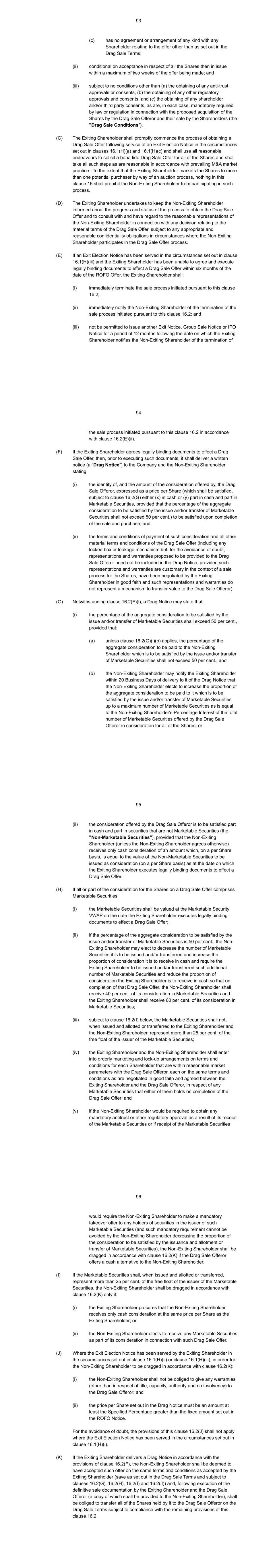 93 (c) has no agreement or arrangement of any kind with any Shareholder relating to the offer other than as set out in the Drag Sale Terms; (ii) conditional on acceptance in respect of all the Shares then in issue within a maximum of two weeks of the offer being made; and (iii) subject to no conditions other than (a) the obtaining of any anti-trust approvals or consents, (b) the obtaining of any other regulatory approvals and consents, and (c) the obtaining of any shareholder and/or third party consents, as are, in each case, mandatorily required by law or regulation in connection with the proposed acquisition of the Shares by the Drag Sale Offeror and their sale by the Shareholders (the "Drag Sale Conditions"). (C) The Exiting Shareholder shall promptly commence the process of obtaining a Drag Sale Offer following service of an Exit Election Notice in the circumstances set out in clauses 16.1(H)(a) and 16.1(H)(c) and shall use all reasonable endeavours to solicit a bona fide Drag Sale Offer for all of the Shares and shall take all such steps as are reasonable in accordance with prevailing M&A market practice. To the extent that the Exiting Shareholder markets the Shares to more than one potential purchaser by way of an auction process, nothing in this clause 16 shall prohibit the Non-Exiting Shareholder from participating in such process. (D) The Exiting Shareholder undertakes to keep the Non-Exiting Shareholder informed about the progress and status of the process to obtain the Drag Sale Offer and to consult with and have regard to the reasonable representations of the Non-Exiting Shareholder in connection with any decision relating to the material terms of the Drag Sale Offer, subject to any appropriate and reasonable confidentiality obligations in circumstances where the Non-Exiting Shareholder participates in the Drag Sale Offer process. (E) If an Exit Election Notice has been served in the circumstances set out in clause 16.1(H)(iii) and the Exiting Shareholder has been unable to agree and execute legally binding documents to effect a Drag Sale Offer within six months of the date of the ROFO Offer, the Exiting Shareholder shall: (i) immediately terminate the sale process initiated pursuant to this clause 16.2; (ii) immediately notify the Non-Exiting Shareholder of the termination of the sale process initiated pursuant to this clause 16.2; and (iii) not be permitted to issue another Exit Notice, Group Sale Notice or IPO Notice for a period of 12 months following the date on which the Exiting Shareholder notifies the Non-Exiting Shareholder of the termination of 94 the sale process initiated pursuant to this clause 16.2 in accordance with clause 16.2(E)(ii). (F) If the Exiting Shareholder agrees legally binding documents to effect a Drag Sale Offer, then, prior to executing such documents, it shall deliver a written notice (a “Drag Notice”) to the Company and the Non-Exiting Shareholder stating: (i) the identity of, and the amount of the consideration offered by, the Drag Sale Offeror, expressed as a price per Share (which shall be satisfied, subject to clause 16.2(G) either (x) in cash or (y) part in cash and part in Marketable Securities, provided that the percentage of the aggregate consideration to be satisfied by the issue and/or transfer of Marketable Securities shall not exceed 50 per cent.) to be satisfied upon completion of the sale and purchase; and (ii) the terms and conditions of payment of such consideration and all other material terms and conditions of the Drag Sale Offer (including any locked box or leakage mechanism but, for the avoidance of doubt, representations and warranties proposed to be provided to the Drag Sale Offeror need not be included in the Drag Notice, provided such representations and warranties are customary in the context of a sale process for the Shares, have been negotiated by the Exiting Shareholder in good faith and such representations and warranties do not represent a mechanism to transfer value to the Drag Sale Offeror). (G) Notwithstanding clause 16.2(F)(i), a Drag Notice may state that: (i) the percentage of the aggregate consideration to be satisfied by the issue and/or transfer of Marketable Securities shall exceed 50 per cent., provided that: (a) unless clause 16.2(G)(i)(b) applies, the percentage of the aggregate consideration to be paid to the Non-Exiting Shareholder which is to be satisfied by the issue and/or transfer of Marketable Securities shall not exceed 50 per cent.; and (b) the Non-Exiting Shareholder may notify the Exiting Shareholder within 20 Business Days of delivery to it of the Drag Notice that the Non-Exiting Shareholder elects to increase the proportion of the aggregate consideration to be paid to it which is to be satisfied by the issue and/or transfer of Marketable Securities up to a maximum number of Marketable Securities as is equal to the Non-Exiting Shareholder's Percentage Interest of the total number of Marketable Securities offered by the Drag Sale Offeror in consideration for all of the Shares; or 95 (ii) the consideration offered by the Drag Sale Offeror is to be satisfied part in cash and part in securities that are not Marketable Securities (the "Non-Marketable Securities"), provided that the Non-Exiting Shareholder (unless the Non-Exiting Shareholder agrees otherwise) receives only cash consideration of an amount which, on a per Share basis, is equal to the value of the Non-Marketable Securities to be issued as consideration (on a per Share basis) as at the date on which the Exiting Shareholder executes legally binding documents to effect a Drag Sale Offer. (H) If all or part of the consideration for the Shares on a Drag Sale Offer comprises Marketable Securities: (i) the Marketable Securities shall be valued at the Marketable Security VWAP on the date the Exiting Shareholder executes legally binding documents to effect a Drag Sale Offer; (ii) if the percentage of the aggregate consideration to be sat