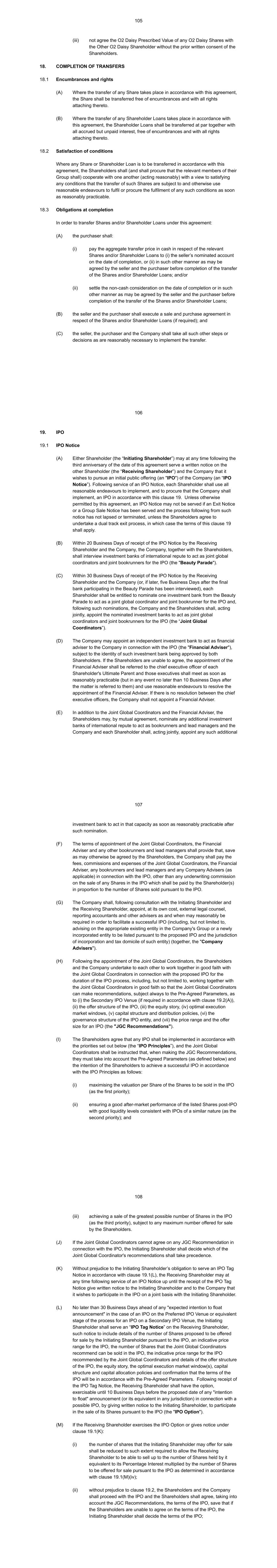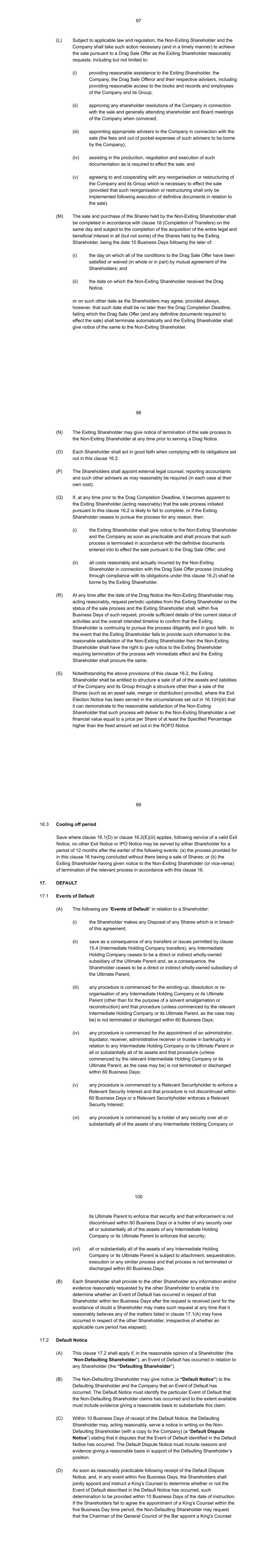 97 (L) Subject to applicable law and regulation, the Non-Exiting Shareholder and the Company shall take such action necessary (and in a timely manner) to achieve the sale pursuant to a Drag Sale Offer as the Exiting Shareholder reasonably requests, including but not limited to: (i) providing reasonable assistance to the Exiting Shareholder, the Company, the Drag Sale Offeror and their respective advisers, including providing reasonable access to the books and records and employees of the Company and its Group; (ii) approving any shareholder resolutions of the Company in connection with the sale and generally attending shareholder and Board meetings of the Company when convened; (iii) appointing appropriate advisers to the Company in connection with the sale (the fees and out of pocket expenses of such advisers to be borne by the Company); (iv) assisting in the production, negotiation and execution of such documentation as is required to effect the sale; and (v) agreeing to and cooperating with any reorganisation or restructuring of the Company and its Group which is necessary to effect the sale (provided that such reorganisation or restructuring shall only be implemented following execution of definitive documents in relation to the sale). (M) The sale and purchase of the Shares held by the Non-Exiting Shareholder shall be completed in accordance with clause 18 (Completion of Transfers) on the same day and subject to the completion of the acquisition of the entire legal and beneficial interest in all (but not some) of the Shares held by the Exiting Shareholder, being the date 10 Business Days following the later of: (i) the day on which all of the conditions to the Drag Sale Offer have been satisfied or waived (in whole or in part) by mutual agreement of the Shareholders; and (ii) the date on which the Non-Exiting Shareholder received the Drag Notice, or on such other date as the Shareholders may agree, provided always, however, that such date shall be no later than the Drag Completion Deadline, failing which the Drag Sale Offer (and any definitive documents required to effect the sale) shall terminate automatically and the Exiting Shareholder shall give notice of the same to the Non-Exiting Shareholder. 98 (N) The Exiting Shareholder may give notice of termination of the sale process to the Non-Exiting Shareholder at any time prior to serving a Drag Notice. (O) Each Shareholder shall act in good faith when complying with its obligations set out in this clause 16.2. (P) The Shareholders shall appoint external legal counsel, reporting accountants and such other advisers as may reasonably be required (in each case at their own cost). (Q) If, at any time prior to the Drag Completion Deadline, it becomes apparent to the Exiting Shareholder (acting reasonably) that the sale process initiated pursuant to this clause 16.2 is likely to fail to complete, or if the Exiting Shareholder ceases to pursue the process for any reason, then: (i) the Exiting Shareholder shall give notice to the Non-Exiting Shareholder and the Company as soon as practicable and shall procure that such process is terminated in accordance with the definitive documents entered into to effect the sale pursuant to the Drag Sale Offer; and (ii) all costs reasonably and actually incurred by the Non-Exiting Shareholder in connection with the Drag Sale Offer process (including through compliance with its obligations under this clause 16.2) shall be borne by the Exiting Shareholder. (R) At any time after the date of the Drag Notice the Non-Exiting Shareholder may, acting reasonably, request periodic updates from the Exiting Shareholder on the status of the sale process and the Exiting Shareholder shall, within five Business Days of such request, provide sufficient details of the current status of activities and the overall intended timeline to confirm that the Exiting Shareholder is continuing to pursue the process diligently and in good faith. In the event that the Exiting Shareholder fails to provide such information to the reasonable satisfaction of the Non-Exiting Shareholder then the Non-Exiting Shareholder shall have the right to give notice to the Exiting Shareholder requiring termination of the process with immediate effect and the Exiting Shareholder shall procure the same. (S) Notwithstanding the above provisions of this clause 16.2, the Exiting Shareholder shall be entitled to structure a sale of all of the assets and liabilities of the Company and its Group through a structure other than a sale of the Shares (such as an asset sale, merger or distribution) provided, where the Exit Election Notice has been served in the circumstances set out in 16.1(H)(iii) that it can demonstrate to the reasonable satisfaction of the Non-Exiting Shareholder that such process will deliver to the Non-Exiting Shareholder a net financial value equal to a price per Share of at least the Specified Percentage higher than the fixed amount set out in the ROFO Notice. 99 16.3 Cooling off period Save where clause 16.1(D) or clause 16.2(E)(iii) applies, following service of a valid Exit Notice, no other Exit Notice or IPO Notice may be served by either Shareholder for a period of 12 months after the earlier of the following events: (a) the process provided for in this clause 16 having concluded without there being a sale of Shares; or (b) the Exiting Shareholder having given notice to the Non-Exiting Shareholder (or vice-versa) of termination of the relevant process in accordance with this clause 16. 17. DEFAULT 17.1 Events of Default (A) The following are “Events of Default” in relation to a Shareholder: (i) the Shareholder makes any Disposal of any Shares which is in breach of this agreement; (ii) save as a consequence of any transfers or issues permitted by clause 15.4 (Intermediate Holding Company transfers), any Intermediate Holding Company ceases to be a direct or indirect wholly-owned subsidiary of the Ultimate Parent and, as a consequence