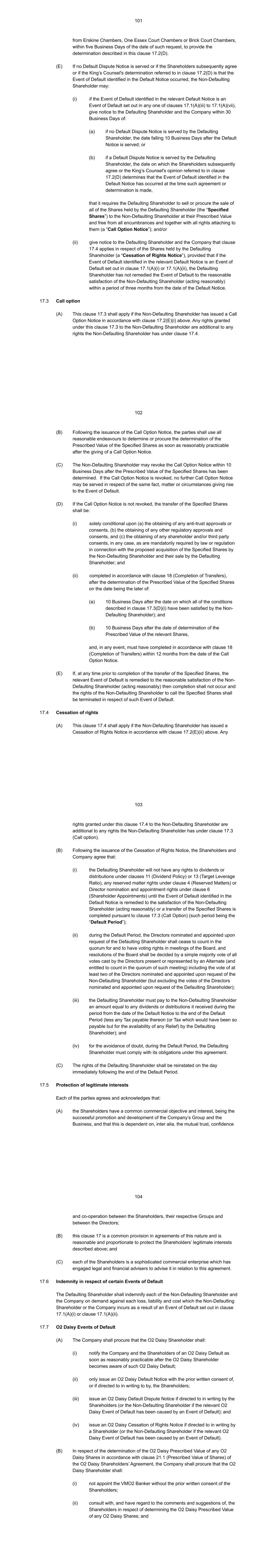 101 from Erskine Chambers, One Essex Court Chambers or Brick Court Chambers, within five Business Days of the date of such request, to provide the determination described in this clause 17.2(D). (E) If no Default Dispute Notice is served or if the Shareholders subsequently agree or if the King’s Counsel's determination referred to in clause 17.2(D) is that the Event of Default identified in the Default Notice occurred, the Non-Defaulting Shareholder may: (i) if the Event of Default identified in the relevant Default Notice is an Event of Default set out in any one of clauses 17.1(A)(iii) to 17.1(A)(vii), give notice to the Defaulting Shareholder and the Company within 30 Business Days of: (a) if no Default Dispute Notice is served by the Defaulting Shareholder, the date falling 10 Business Days after the Default Notice is served; or (b) if a Default Dispute Notice is served by the Defaulting Shareholder, the date on which the Shareholders subsequently agree or the King’s Counsel's opinion referred to in clause 17.2(D) determines that the Event of Default identified in the Default Notice has occurred at the time such agreement or determination is made, that it requires the Defaulting Shareholder to sell or procure the sale of all of the Shares held by the Defaulting Shareholder (the “Specified Shares”) to the Non-Defaulting Shareholder at their Prescribed Value and free from all encumbrances and together with all rights attaching to them (a “Call Option Notice”); and/or (ii) give notice to the Defaulting Shareholder and the Company that clause 17.4 applies in respect of the Shares held by the Defaulting Shareholder (a “Cessation of Rights Notice”), provided that if the Event of Default identified in the relevant Default Notice is an Event of Default set out in clause 17.1(A)(i) or 17.1(A)(ii), the Defaulting Shareholder has not remedied the Event of Default to the reasonable satisfaction of the Non-Defaulting Shareholder (acting reasonably) within a period of three months from the date of the Default Notice. 17.3 Call option (A) This clause 17.3 shall apply if the Non-Defaulting Shareholder has issued a Call Option Notice in accordance with clause 17.2(E)(i) above. Any rights granted under this clause 17.3 to the Non-Defaulting Shareholder are additional to any rights the Non-Defaulting Shareholder has under clause 17.4. 102 (B) Following the issuance of the Call Option Notice, the parties shall use all reasonable endeavours to determine or procure the determination of the Prescribed Value of the Specified Shares as soon as reasonably practicable after the giving of a Call Option Notice. (C) The Non-Defaulting Shareholder may revoke the Call Option Notice within 10 Business Days after the Prescribed Value of the Specified Shares has been determined. If the Call Option Notice is revoked, no further Call Option Notice may be served in respect of the same fact, matter or circumstances giving rise to the Event of Default. (D) If the Call Option Notice is not revoked, the transfer of the Specified Shares shall be: (i) solely conditional upon (a) the obtaining of any anti-trust approvals or consents, (b) the obtaining of any other regulatory approvals and consents, and (c) the obtaining of any shareholder and/or third party consents, in any case, as are mandatorily required by law or regulation in connection with the proposed acquisition of the Specified Shares by the Non-Defaulting Shareholder and their sale by the Defaulting Shareholder; and (ii) completed in accordance with clause 18 (Completion of Transfers), after the determination of the Prescribed Value of the Specified Shares on the date being the later of: (a) 10 Business Days after the date on which all of the conditions described in clause 17.3(D)(i) have been satisfied by the Non- Defaulting Shareholder); and (b) 10 Business Days after the date of determination of the Prescribed Value of the relevant Shares, and, in any event, must have completed in accordance with clause 18 (Completion of Transfers) within 12 months from the date of the Call Option Notice. (E) If, at any time prior to completion of the transfer of the Specified Shares, the relevant Event of Default is remedied to the reasonable satisfaction of the Non- Defaulting Shareholder (acting reasonably) then completion shall not occur and the rights of the Non-Defaulting Shareholder to call the Specified Shares shall be terminated in respect of such Event of Default. 17.4 Cessation of rights (A) This clause 17.4 shall apply if the Non-Defaulting Shareholder has issued a Cessation of Rights Notice in accordance with clause 17.2(E)(ii) above. Any 103 rights granted under this clause 17.4 to the Non-Defaulting Shareholder are additional to any rights the Non-Defaulting Shareholder has under clause 17.3 (Call option). (B) Following the issuance of the Cessation of Rights Notice, the Shareholders and Company agree that: (i) the Defaulting Shareholder will not have any rights to dividends or distributions under clauses 11 (Dividend Policy) or 13 (Target Leverage Ratio), any reserved matter rights under clause 4 (Reserved Matters) or Director nomination and appointment rights under clause 6 (Shareholder Appointments) until the Event of Default identified in the Default Notice is remedied to the satisfaction of the Non-Defaulting Shareholder (acting reasonably) or a transfer of the Specified Shares is completed pursuant to clause 17.3 (Call Option) (such period being the “Default Period”); (ii) during the Default Period, the Directors nominated and appointed upon request of the Defaulting Shareholder shall cease to count in the quorum for and to have voting rights in meetings of the Board, and resolutions of the Board shall be decided by a simple majority vote of all votes cast by the Directors present or represented by an Alternate (and entitled to count in the quorum of such meeting) including the vote of at least two of the Directors nominated and appointed u
