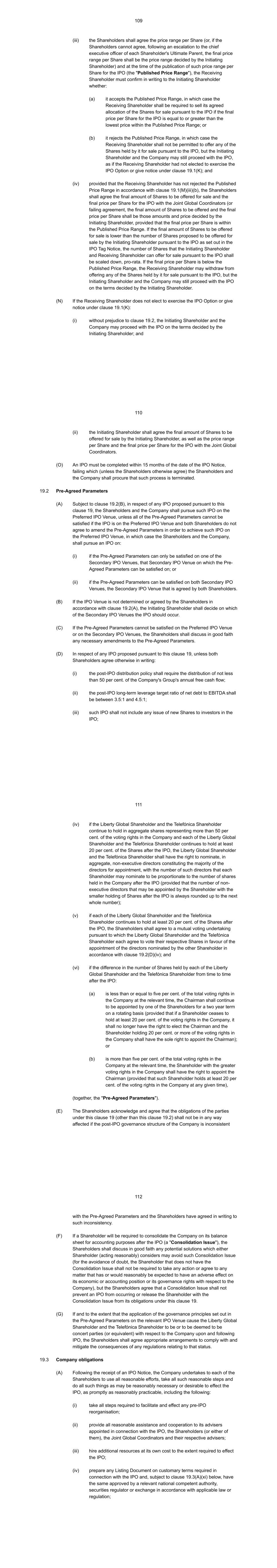 109 (iii) the Shareholders shall agree the price range per Share (or, if the Shareholders cannot agree, following an escalation to the chief executive officer of each Shareholder's Ultimate Parent, the final price range per Share shall be the price range decided by the Initiating Shareholder) and at the time of the publication of such price range per Share for the IPO (the "Published Price Range"), the Receiving Shareholder must confirm in writing to the Initiating Shareholder whether: (a) it accepts the Published Price Range, in which case the Receiving Shareholder shall be required to sell its agreed allocation of the Shares for sale pursuant to the IPO if the final price per Share for the IPO is equal to or greater than the lowest price within the Published Price Range; or (b) it rejects the Published Price Range, in which case the Receiving Shareholder shall not be permitted to offer any of the Shares held by it for sale pursuant to the IPO, but the Initiating Shareholder and the Company may still proceed with the IPO, as if the Receiving Shareholder had not elected to exercise the IPO Option or give notice under clause 19.1(K); and (iv) provided that the Receiving Shareholder has not rejected the Published Price Range in accordance with clause 19.1(M)(iii)(b), the Shareholders shall agree the final amount of Shares to be offered for sale and the final price per Share for the IPO with the Joint Global Coordinators (or failing agreement, the final amount of Shares to be offered and the final price per Share shall be those amounts and price decided by the Initiating Shareholder, provided that the final price per Share is within the Published Price Range. If the final amount of Shares to be offered for sale is lower than the number of Shares proposed to be offered for sale by the Initiating Shareholder pursuant to the IPO as set out in the IPO Tag Notice, the number of Shares that the Initiating Shareholder and Receiving Shareholder can offer for sale pursuant to the IPO shall be scaled down, pro-rata. If the final price per Share is below the Published Price Range, the Receiving Shareholder may withdraw from offering any of the Shares held by it for sale pursuant to the IPO, but the Initiating Shareholder and the Company may still proceed with the IPO on the terms decided by the Initiating Shareholder. (N) If the Receiving Shareholder does not elect to exercise the IPO Option or give notice under clause 19.1(K): (i) without prejudice to clause 19.2, the Initiating Shareholder and the Company may proceed with the IPO on the terms decided by the Initiating Shareholder; and 110 (ii) the Initiating Shareholder shall agree the final amount of Shares to be offered for sale by the Initiating Shareholder, as well as the price range per Share and the final price per Share for the IPO with the Joint Global Coordinators. (O) An IPO must be completed within 15 months of the date of the IPO Notice, failing which (unless the Shareholders otherwise agree) the Shareholders and the Company shall procure that such process is terminated. 19.2 Pre-Agreed Parameters (A) Subject to clause 19.2(B), in respect of any IPO proposed pursuant to this clause 19, the Shareholders and the Company shall pursue such IPO on the Preferred IPO Venue, unless all of the Pre-Agreed Parameters cannot be satisfied if the IPO is on the Preferred IPO Venue and both Shareholders do not agree to amend the Pre-Agreed Parameters in order to achieve such IPO on the Preferred IPO Venue, in which case the Shareholders and the Company, shall pursue an IPO on: (i) if the Pre-Agreed Parameters can only be satisfied on one of the Secondary IPO Venues, that Secondary IPO Venue on which the Pre- Agreed Parameters can be satisfied on; or (ii) if the Pre-Agreed Parameters can be satisfied on both Secondary IPO Venues, the Secondary IPO Venue that is agreed by both Shareholders. (B) If the IPO Venue is not determined or agreed by the Shareholders in accordance with clause 19.2(A), the Initiating Shareholder shall decide on which of the Secondary IPO Venues the IPO should occur. (C) If the Pre-Agreed Parameters cannot be satisfied on the Preferred IPO Venue or on the Secondary IPO Venues, the Shareholders shall discuss in good faith any necessary amendments to the Pre-Agreed Parameters. (D) In respect of any IPO proposed pursuant to this clause 19, unless both Shareholders agree otherwise in writing: (i) the post-IPO distribution policy shall require the distribution of not less than 50 per cent. of the Company's Group's annual free cash flow; (ii) the post-IPO long-term leverage target ratio of net debt to EBITDA shall be between 3.5:1 and 4.5:1; (iii) such IPO shall not include any issue of new Shares to investors in the IPO; 111 (iv) if the Liberty Global Shareholder and the Telefónica Shareholder continue to hold in aggregate shares representing more than 50 per cent. of the voting rights in the Company and each of the Liberty Global Shareholder and the Telefónica Shareholder continues to hold at least 20 per cent. of the Shares after the IPO, the Liberty Global Shareholder and the Telefónica Shareholder shall have the right to nominate, in aggregate, non-executive directors constituting the majority of the directors for appointment, with the number of such directors that each Shareholder may nominate to be proportionate to the number of shares held in the Company after the IPO (provided that the number of non- executive directors that may be appointed by the Shareholder with the smaller holding of Shares after the IPO is always rounded up to the next whole number); (v) if each of the Liberty Global Shareholder and the Telefónica Shareholder continues to hold at least 20 per cent. of the Shares after the IPO, the Shareholders shall agree to a mutual voting undertaking pursuant to which the Liberty Global Shareholder and the Telefónica Shareholder each agree to vote their respective Shares in favour of the appointment of the directors n