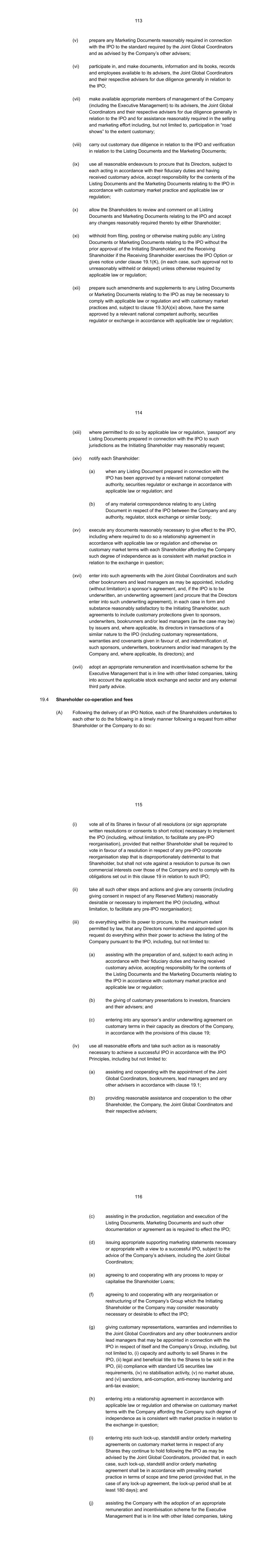 113 (v) prepare any Marketing Documents reasonably required in connection with the IPO to the standard required by the Joint Global Coordinators and as advised by the Company’s other advisers; (vi) participate in, and make documents, information and its books, records and employees available to its advisers, the Joint Global Coordinators and their respective advisers for due diligence generally in relation to the IPO; (vii) make available appropriate members of management of the Company (including the Executive Management) to its advisers, the Joint Global Coordinators and their respective advisers for due diligence generally in relation to the IPO and for assistance reasonably required in the selling and marketing effort including, but not limited to, participation in “road shows” to the extent customary; (viii) carry out customary due diligence in relation to the IPO and verification in relation to the Listing Documents and the Marketing Documents; (ix) use all reasonable endeavours to procure that its Directors, subject to each acting in accordance with their fiduciary duties and having received customary advice, accept responsibility for the contents of the Listing Documents and the Marketing Documents relating to the IPO in accordance with customary market practice and applicable law or regulation; (x) allow the Shareholders to review and comment on all Listing Documents and Marketing Documents relating to the IPO and accept any changes reasonably required thereto by either Shareholder; (xi) withhold from filing, posting or otherwise making public any Listing Documents or Marketing Documents relating to the IPO without the prior approval of the Initiating Shareholder, and the Receiving Shareholder if the Receiving Shareholder exercises the IPO Option or gives notice under clause 19.1(K), (in each case, such approval not to unreasonably withheld or delayed) unless otherwise required by applicable law or regulation; (xii) prepare such amendments and supplements to any Listing Documents or Marketing Documents relating to the IPO as may be necessary to comply with applicable law or regulation and with customary market practices and, subject to clause 19.3(A)(xi) above, have the same approved by a relevant national competent authority, securities regulator or exchange in accordance with applicable law or regulation; 114 (xiii) where permitted to do so by applicable law or regulation, ‘passport’ any Listing Documents prepared in connection with the IPO to such jurisdictions as the Initiating Shareholder may reasonably request; (xiv) notify each Shareholder: (a) when any Listing Document prepared in connection with the IPO has been approved by a relevant national competent authority, securities regulator or exchange in accordance with applicable law or regulation; and (b) of any material correspondence relating to any Listing Document in respect of the IPO between the Company and any authority, regulator, stock exchange or similar body; (xv) execute any documents reasonably necessary to give effect to the IPO, including where required to do so a relationship agreement in accordance with applicable law or regulation and otherwise on customary market terms with each Shareholder affording the Company such degree of independence as is consistent with market practice in relation to the exchange in question; (xvi) enter into such agreements with the Joint Global Coordinators and such other bookrunners and lead managers as may be appointed, including (without limitation) a sponsor’s agreement, and, if the IPO is to be underwritten, an underwriting agreement (and procure that the Directors enter into such underwriting agreement), in each case in form and substance reasonably satisfactory to the Initiating Shareholder, such agreements to include customary protections given to sponsors, underwriters, bookrunners and/or lead managers (as the case may be) by issuers and, where applicable, its directors in transactions of a similar nature to the IPO (including customary representations, warranties and covenants given in favour of, and indemnification of, such sponsors, underwriters, bookrunners and/or lead managers by the Company and, where applicable, its directors); and (xvii) adopt an appropriate remuneration and incentivisation scheme for the Executive Management that is in line with other listed companies, taking into account the applicable stock exchange and sector and any external third party advice. 19.4 Shareholder co-operation and fees (A) Following the delivery of an IPO Notice, each of the Shareholders undertakes to each other to do the following in a timely manner following a request from either Shareholder or the Company to do so: 115 (i) vote all of its Shares in favour of all resolutions (or sign appropriate written resolutions or consents to short notice) necessary to implement the IPO (including, without limitation, to facilitate any pre-IPO reorganisation), provided that neither Shareholder shall be required to vote in favour of a resolution in respect of any pre-IPO corporate reorganisation step that is disproportionately detrimental to that Shareholder, but shall not vote against a resolution to pursue its own commercial interests over those of the Company and to comply with its obligations set out in this clause 19 in relation to such IPO; (ii) take all such other steps and actions and give any consents (including giving consent in respect of any Reserved Matters) reasonably desirable or necessary to implement the IPO (including, without limitation, to facilitate any pre-IPO reorganisation); (iii) do everything within its power to procure, to the maximum extent permitted by law, that any Directors nominated and appointed upon its request do everything within their power to achieve the listing of the Company pursuant to the IPO, including, but not limited to: (a) assisting with the preparation of and, subject to each acting in accordance with their fiduciary duties and 