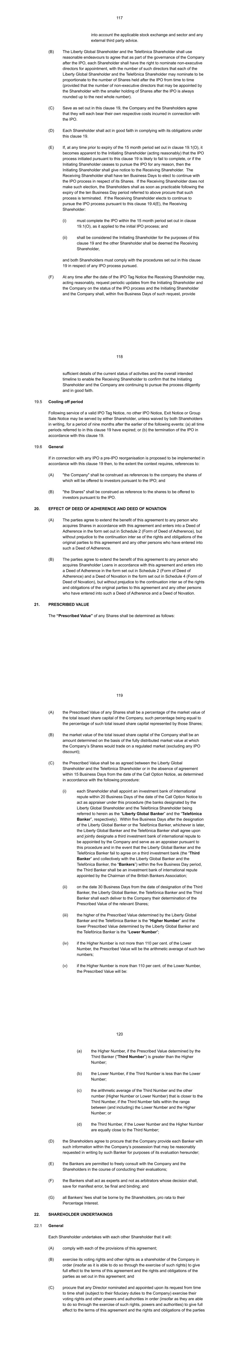 117 into account the applicable stock exchange and sector and any external third party advice. (B) The Liberty Global Shareholder and the Telefónica Shareholder shall use reasonable endeavours to agree that as part of the governance of the Company after the IPO, each Shareholder shall have the right to nominate non-executive directors for appointment, with the number of such directors that each of the Liberty Global Shareholder and the Telefónica Shareholder may nominate to be proportionate to the number of Shares held after the IPO from time to time (provided that the number of non-executive directors that may be appointed by the Shareholder with the smaller holding of Shares after the IPO is always rounded up to the next whole number). (C) Save as set out in this clause 19, the Company and the Shareholders agree that they will each bear their own respective costs incurred in connection with the IPO. (D) Each Shareholder shall act in good faith in complying with its obligations under this clause 19. (E) If, at any time prior to expiry of the 15 month period set out in clause 19.1(O), it becomes apparent to the Initiating Shareholder (acting reasonably) that the IPO process initiated pursuant to this clause 19 is likely to fail to complete, or if the Initiating Shareholder ceases to pursue the IPO for any reason, then the Initiating Shareholder shall give notice to the Receiving Shareholder. The Receiving Shareholder shall have ten Business Days to elect to continue with the IPO process in respect of its Shares. If the Receiving Shareholder does not make such election, the Shareholders shall as soon as practicable following the expiry of the ten Business Day period referred to above procure that such process is terminated. If the Receiving Shareholder elects to continue to pursue the IPO process pursuant to this clause 19.4(E), the Receiving Shareholder: (i) must complete the IPO within the 15 month period set out in clause 19.1(O), as it applied to the initial IPO process; and (ii) shall be considered the Initiating Shareholder for the purposes of this clause 19 and the other Shareholder shall be deemed the Receiving Shareholder, and both Shareholders must comply with the procedures set out in this clause 19 in respect of any IPO process pursued. (F) At any time after the date of the IPO Tag Notice the Receiving Shareholder may, acting reasonably, request periodic updates from the Initiating Shareholder and the Company on the status of the IPO process and the Initiating Shareholder and the Company shall, within five Business Days of such request, provide 118 sufficient details of the current status of activities and the overall intended timeline to enable the Receiving Shareholder to confirm that the Initiating Shareholder and the Company are continuing to pursue the process diligently and in good faith. 19.5 Cooling off period Following service of a valid IPO Tag Notice, no other IPO Notice, Exit Notice or Group Sale Notice may be served by either Shareholder, unless waived by both Shareholders in writing, for a period of nine months after the earlier of the following events: (a) all time periods referred to in this clause 19 have expired; or (b) the termination of the IPO in accordance with this clause 19. 19.6 General If in connection with any IPO a pre-IPO reorganisation is proposed to be implemented in accordance with this clause 19 then, to the extent the context requires, references to: (A) "the Company" shall be construed as references to the company the shares of which will be offered to investors pursuant to the IPO; and (B) "the Shares" shall be construed as reference to the shares to be offered to investors pursuant to the IPO. 20. EFFECT OF DEED OF ADHERENCE AND DEED OF NOVATION (A) The parties agree to extend the benefit of this agreement to any person who acquires Shares in accordance with this agreement and enters into a Deed of Adherence in the form set out in Schedule 2 (Form of Deed of Adherence), but without prejudice to the continuation inter se of the rights and obligations of the original parties to this agreement and any other persons who have entered into such a Deed of Adherence. (B) The parties agree to extend the benefit of this agreement to any person who acquires Shareholder Loans in accordance with this agreement and enters into a Deed of Adherence in the form set out in Schedule 2 (Form of Deed of Adherence) and a Deed of Novation in the form set out in Schedule 4 (Form of Deed of Novation), but without prejudice to the continuation inter se of the rights and obligations of the original parties to this agreement and any other persons who have entered into such a Deed of Adherence and a Deed of Novation. 21. PRESCRIBED VALUE The “Prescribed Value” of any Shares shall be determined as follows: 119 (A) the Prescribed Value of any Shares shall be a percentage of the market value of the total issued share capital of the Company, such percentage being equal to the percentage of such total issued share capital represented by those Shares; (B) the market value of the total issued share capital of the Company shall be an amount determined on the basis of the fully distributed market value at which the Company’s Shares would trade on a regulated market (excluding any IPO discount); (C) the Prescribed Value shall be as agreed between the Liberty Global Shareholder and the Telefónica Shareholder or in the absence of agreement within 15 Business Days from the date of the Call Option Notice, as determined in accordance with the following procedure: (i) each Shareholder shall appoint an investment bank of international repute within 20 Business Days of the date of the Call Option Notice to act as appraiser under this procedure (the banks designated by the Liberty Global Shareholder and the Telefónica Shareholder being referred to herein as the “Liberty Global Banker” and the “Telefónica Banker”, respectively). Within five Business Days after the desig