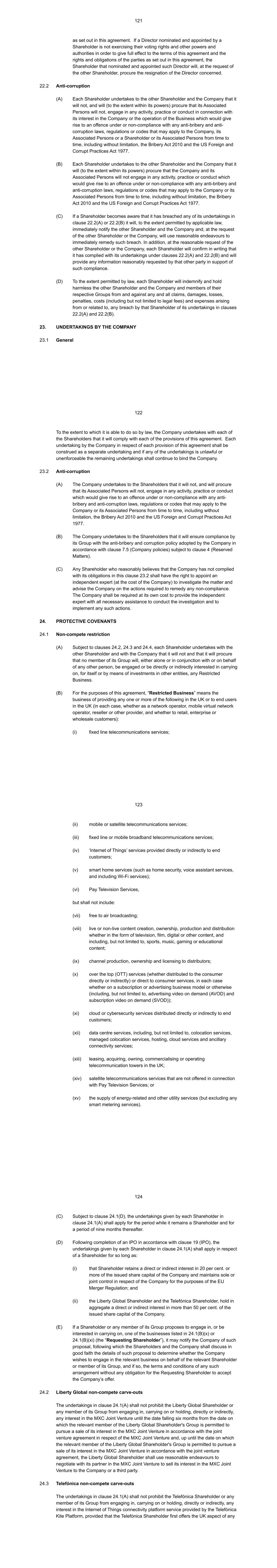 121 as set out in this agreement. If a Director nominated and appointed by a Shareholder is not exercising their voting rights and other powers and authorities in order to give full effect to the terms of this agreement and the rights and obligations of the parties as set out in this agreement, the Shareholder that nominated and appointed such Director will, at the request of the other Shareholder, procure the resignation of the Director concerned. 22.2 Anti-corruption (A) Each Shareholder undertakes to the other Shareholder and the Company that it will not, and will (to the extent within its powers) procure that its Associated Persons will not, engage in any activity, practice or conduct in connection with its interest in the Company or the operation of the Business which would give rise to an offence under or non-compliance with any anti-bribery and anti- corruption laws, regulations or codes that may apply to the Company, its Associated Persons or a Shareholder or its Associated Persons from time to time, including without limitation, the Bribery Act 2010 and the US Foreign and Corrupt Practices Act 1977. (B) Each Shareholder undertakes to the other Shareholder and the Company that it will (to the extent within its powers) procure that the Company and its Associated Persons will not engage in any activity, practice or conduct which would give rise to an offence under or non-compliance with any anti-bribery and anti-corruption laws, regulations or codes that may apply to the Company or its Associated Persons from time to time, including without limitation, the Bribery Act 2010 and the US Foreign and Corrupt Practices Act 1977. (C) If a Shareholder becomes aware that it has breached any of its undertakings in clause 22.2(A) or 22.2(B) it will, to the extent permitted by applicable law, immediately notify the other Shareholder and the Company and, at the request of the other Shareholder or the Company, will use reasonable endeavours to immediately remedy such breach. In addition, at the reasonable request of the other Shareholder or the Company, each Shareholder will confirm in writing that it has complied with its undertakings under clauses 22.2(A) and 22.2(B) and will provide any information reasonably requested by that other party in support of such compliance. (D) To the extent permitted by law, each Shareholder will indemnify and hold harmless the other Shareholder and the Company and members of their respective Groups from and against any and all claims, damages, losses, penalties, costs (including but not limited to legal fees) and expenses arising from or related to, any breach by that Shareholder of its undertakings in clauses 22.2(A) and 22.2(B). 23. UNDERTAKINGS BY THE COMPANY 23.1 General 122 To the extent to which it is able to do so by law, the Company undertakes with each of the Shareholders that it will comply with each of the provisions of this agreement. Each undertaking by the Company in respect of each provision of this agreement shall be construed as a separate undertaking and if any of the undertakings is unlawful or unenforceable the remaining undertakings shall continue to bind the Company. 23.2 Anti-corruption (A) The Company undertakes to the Shareholders that it will not, and will procure that its Associated Persons will not, engage in any activity, practice or conduct which would give rise to an offence under or non-compliance with any anti- bribery and anti-corruption laws, regulations or codes that may apply to the Company or its Associated Persons from time to time, including without limitation, the Bribery Act 2010 and the US Foreign and Corrupt Practices Act 1977. (B) The Company undertakes to the Shareholders that it will ensure compliance by its Group with the anti-bribery and corruption policy adopted by the Company in accordance with clause 7.5 (Company policies) subject to clause 4 (Reserved Matters). (C) Any Shareholder who reasonably believes that the Company has not complied with its obligations in this clause 23.2 shall have the right to appoint an independent expert (at the cost of the Company) to investigate the matter and advise the Company on the actions required to remedy any non-compliance. The Company shall be required at its own cost to provide the independent expert with all necessary assistance to conduct the investigation and to implement any such actions. 24. PROTECTIVE COVENANTS 24.1 Non-compete restriction (A) Subject to clauses 24.2, 24.3 and 24.4, each Shareholder undertakes with the other Shareholder and with the Company that it will not and that it will procure that no member of its Group will, either alone or in conjunction with or on behalf of any other person, be engaged or be directly or indirectly interested in carrying on, for itself or by means of investments in other entities, any Restricted Business. (B) For the purposes of this agreement, “Restricted Business” means the business of providing any one or more of the following in the UK or to end users in the UK (in each case, whether as a network operator, mobile virtual network operator, reseller or other provider, and whether to retail, enterprise or wholesale customers): (i) fixed line telecommunications services; 123 (ii) mobile or satellite telecommunications services; (iii) fixed line or mobile broadband telecommunications services; (iv) ‘Internet of Things’ services provided directly or indirectly to end customers; (v) smart home services (such as home security, voice assistant services, and including Wi-Fi services); (vi) Pay Television Services, but shall not include: (vii) free to air broadcasting; (viii) live or non-live content creation, ownership, production and distribution whether in the form of television, film, digital or other content, and including, but not limited to, sports, music, gaming or educational content; (ix) channel production, ownership and licensing to distributors; (x) over the top (OTT) services (whether distributed to the consum