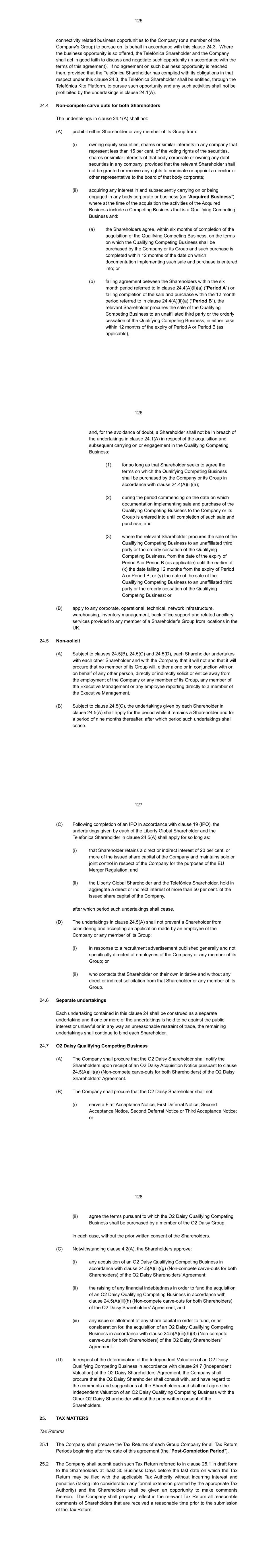 125 connectivity related business opportunities to the Company (or a member of the Company's Group) to pursue on its behalf in accordance with this clause 24.3. Where the business opportunity is so offered, the Telefónica Shareholder and the Company shall act in good faith to discuss and negotiate such opportunity (in accordance with the terms of this agreement). If no agreement on such business opportunity is reached then, provided that the Telefónica Shareholder has complied with its obligations in that respect under this clause 24.3, the Telefónica Shareholder shall be entitled, through the Telefónica Kite Platform, to pursue such opportunity and any such activities shall not be prohibited by the undertakings in clause 24.1(A). 24.4 Non-compete carve outs for both Shareholders The undertakings in clause 24.1(A) shall not: (A) prohibit either Shareholder or any member of its Group from: (i) owning equity securities, shares or similar interests in any company that represent less than 15 per cent. of the voting rights of the securities, shares or similar interests of that body corporate or owning any debt securities in any company, provided that the relevant Shareholder shall not be granted or receive any rights to nominate or appoint a director or other representative to the board of that body corporate; (ii) acquiring any interest in and subsequently carrying on or being engaged in any body corporate or business (an “Acquired Business”) where at the time of the acquisition the activities of the Acquired Business include a Competing Business that is a Qualifying Competing Business and: (a) the Shareholders agree, within six months of completion of the acquisition of the Qualifying Competing Business, on the terms on which the Qualifying Competing Business shall be purchased by the Company or its Group and such purchase is completed within 12 months of the date on which documentation implementing such sale and purchase is entered into; or (b) failing agreement between the Shareholders within the six month period referred to in clause 24.4(A)(ii)(a) (“Period A”) or failing completion of the sale and purchase within the 12 month period referred to in clause 24.4(A)(ii)(a) (“Period B”), the relevant Shareholder procures the sale of the Qualifying Competing Business to an unaffiliated third party or the orderly cessation of the Qualifying Competing Business, in either case within 12 months of the expiry of Period A or Period B (as applicable), 126 and, for the avoidance of doubt, a Shareholder shall not be in breach of the undertakings in clause 24.1(A) in respect of the acquisition and subsequent carrying on or engagement in the Qualifying Competing Business: (1) for so long as that Shareholder seeks to agree the terms on which the Qualifying Competing Business shall be purchased by the Company or its Group in accordance with clause 24.4(A)(ii)(a); (2) during the period commencing on the date on which documentation implementing sale and purchase of the Qualifying Competing Business to the Company or its Group is entered into until completion of such sale and purchase; and (3) where the relevant Shareholder procures the sale of the Qualifying Competing Business to an unaffiliated third party or the orderly cessation of the Qualifying Competing Business, from the date of the expiry of Period A or Period B (as applicable) until the earlier of: (x) the date falling 12 months from the expiry of Period A or Period B; or (y) the date of the sale of the Qualifying Competing Business to an unaffiliated third party or the orderly cessation of the Qualifying Competing Business; or (B) apply to any corporate, operational, technical, network infrastructure, warehousing, inventory management, back office support and related ancillary services provided to any member of a Shareholder’s Group from locations in the UK. 24.5 Non-solicit (A) Subject to clauses 24.5(B), 24.5(C) and 24.5(D), each Shareholder undertakes with each other Shareholder and with the Company that it will not and that it will procure that no member of its Group will, either alone or in conjunction with or on behalf of any other person, directly or indirectly solicit or entice away from the employment of the Company or any member of its Group, any member of the Executive Management or any employee reporting directly to a member of the Executive Management. (B) Subject to clause 24.5(C), the undertakings given by each Shareholder in clause 24.5(A) shall apply for the period while it remains a Shareholder and for a period of nine months thereafter, after which period such undertakings shall cease. 127 (C) Following completion of an IPO in accordance with clause 19 (IPO), the undertakings given by each of the Liberty Global Shareholder and the Telefónica Shareholder in clause 24.5(A) shall apply for so long as: (i) that Shareholder retains a direct or indirect interest of 20 per cent. or more of the issued share capital of the Company and maintains sole or joint control in respect of the Company for the purposes of the EU Merger Regulation; and (ii) the Liberty Global Shareholder and the Telefónica Shareholder, hold in aggregate a direct or indirect interest of more than 50 per cent. of the issued share capital of the Company, after which period such undertakings shall cease. (D) The undertakings in clause 24.5(A) shall not prevent a Shareholder from considering and accepting an application made by an employee of the Company or any member of its Group: (i) in response to a recruitment advertisement published generally and not specifically directed at employees of the Company or any member of its Group; or (ii) who contacts that Shareholder on their own initiative and without any direct or indirect solicitation from that Shareholder or any member of its Group. 24.6 Separate undertakings Each undertaking contained in this clause 24 shall be construed as a separate undertaking and if one or more of the undertakings is held t