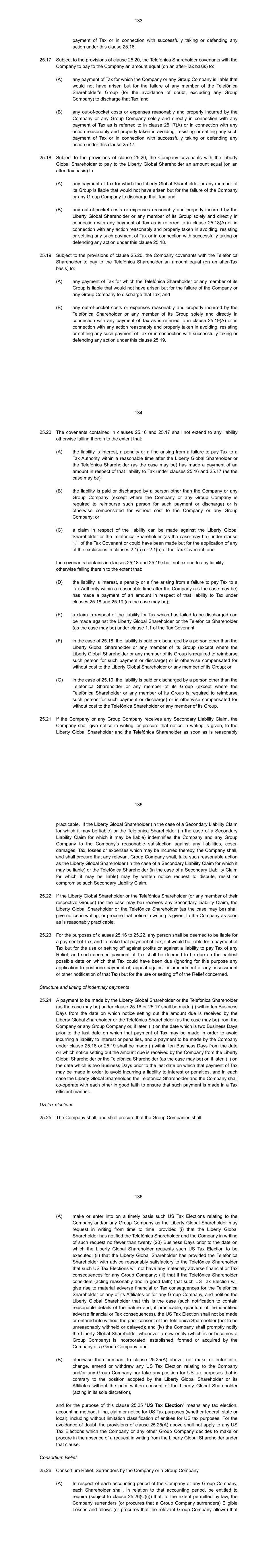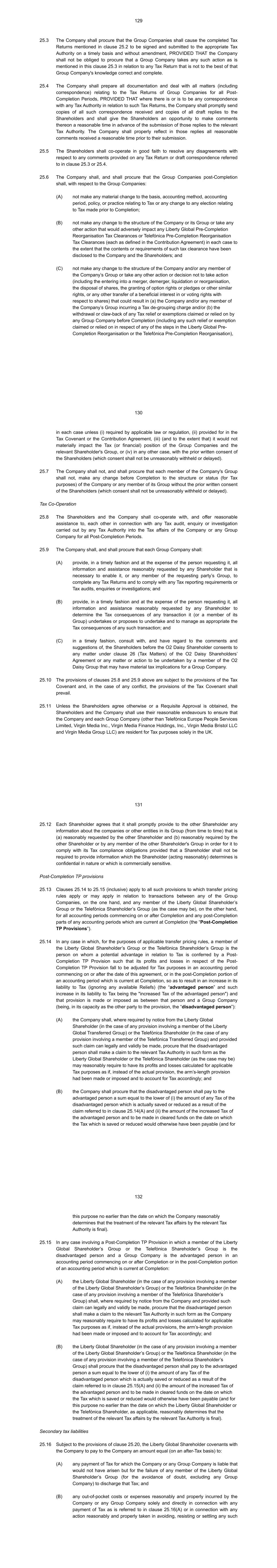 133 payment of Tax or in connection with successfully taking or defending any action under this clause 25.16. 25.17 Subject to the provisions of clause 25.20, the Telefónica Shareholder covenants with the Company to pay to the Company an amount equal (on an after-Tax basis) to: (A) any payment of Tax for which the Company or any Group Company is liable that would not have arisen but for the failure of any member of the Telefónica Shareholder’s Group (for the avoidance of doubt, excluding any Group Company) to discharge that Tax; and (B) any out-of-pocket costs or expenses reasonably and properly incurred by the Company or any Group Company solely and directly in connection with any payment of Tax as is referred to in clause 25.17(A) or in connection with any action reasonably and properly taken in avoiding, resisting or settling any such payment of Tax or in connection with successfully taking or defending any action under this clause 25.17. 25.18 Subject to the provisions of clause 25.20, the Company covenants with the Liberty Global Shareholder to pay to the Liberty Global Shareholder an amount equal (on an after-Tax basis) to: (A) any payment of Tax for which the Liberty Global Shareholder or any member of its Group is liable that would not have arisen but for the failure of the Company or any Group Company to discharge that Tax; and (B) any out-of-pocket costs or expenses reasonably and properly incurred by the Liberty Global Shareholder or any member of its Group solely and directly in connection with any payment of Tax as is referred to in clause 25.18(A) or in connection with any action reasonably and properly taken in avoiding, resisting or settling any such payment of Tax or in connection with successfully taking or defending any action under this clause 25.18. 25.19 Subject to the provisions of clause 25.20, the Company covenants with the Telefónica Shareholder to pay to the Telefónica Shareholder an amount equal (on an after-Tax basis) to: (A) any payment of Tax for which the Telefónica Shareholder or any member of its Group is liable that would not have arisen but for the failure of the Company or any Group Company to discharge that Tax; and (B) any out-of-pocket costs or expenses reasonably and properly incurred by the Telefónica Shareholder or any member of its Group solely and directly in connection with any payment of Tax as is referred to in clause 25.19(A) or in connection with any action reasonably and properly taken in avoiding, resisting or settling any such payment of Tax or in connection with successfully taking or defending any action under this clause 25.19. 134 25.20 The covenants contained in clauses 25.16 and 25.17 shall not extend to any liability otherwise falling therein to the extent that: (A) the liability is interest, a penalty or a fine arising from a failure to pay Tax to a Tax Authority within a reasonable time after the Liberty Global Shareholder or the Telefónica Shareholder (as the case may be) has made a payment of an amount in respect of that liability to Tax under clauses 25.16 and 25.17 (as the case may be); (B) the liability is paid or discharged by a person other than the Company or any Group Company (except where the Company or any Group Company is required to reimburse such person for such payment or discharge) or is otherwise compensated for without cost to the Company or any Group Company; or (C) a claim in respect of the liability can be made against the Liberty Global Shareholder or the Telefónica Shareholder (as the case may be) under clause 1.1 of the Tax Covenant or could have been made but for the application of any of the exclusions in clauses 2.1(a) or 2.1(b) of the Tax Covenant, and the covenants contains in clauses 25.18 and 25.19 shall not extend to any liability otherwise falling therein to the extent that: (D) the liability is interest, a penalty or a fine arising from a failure to pay Tax to a Tax Authority within a reasonable time after the Company (as the case may be) has made a payment of an amount in respect of that liability to Tax under clauses 25.18 and 25.19 (as the case may be); (E) a claim in respect of the liability for Tax which has failed to be discharged can be made against the Liberty Global Shareholder or the Telefónica Shareholder (as the case may be) under clause 1.1 of the Tax Covenant; (F) in the case of 25.18, the liability is paid or discharged by a person other than the Liberty Global Shareholder or any member of its Group (except where the Liberty Global Shareholder or any member of its Group is required to reimburse such person for such payment or discharge) or is otherwise compensated for without cost to the Liberty Global Shareholder or any member of its Group; or (G) in the case of 25.19, the liability is paid or discharged by a person other than the Telefónica Shareholder or any member of its Group (except where the Telefónica Shareholder or any member of its Group is required to reimburse such person for such payment or discharge) or is otherwise compensated for without cost to the Telefónica Shareholder or any member of its Group. 25.21 If the Company or any Group Company receives any Secondary Liability Claim, the Company shall give notice in writing, or procure that notice in writing is given, to the Liberty Global Shareholder and the Telefónica Shareholder as soon as is reasonably 135 practicable. If the Liberty Global Shareholder (in the case of a Secondary Liability Claim for which it may be liable) or the Telefónica Shareholder (in the case of a Secondary Liability Claim for which it may be liable) indemnifies the Company and any Group Company to the Company’s reasonable satisfaction against any liabilities, costs, damages, Tax, losses or expenses which may be incurred thereby, the Company shall, and shall procure that any relevant Group Company shall, take such reasonable action as the Liberty Global Shareholder (in the case of a Secondary Liability Claim for which it m