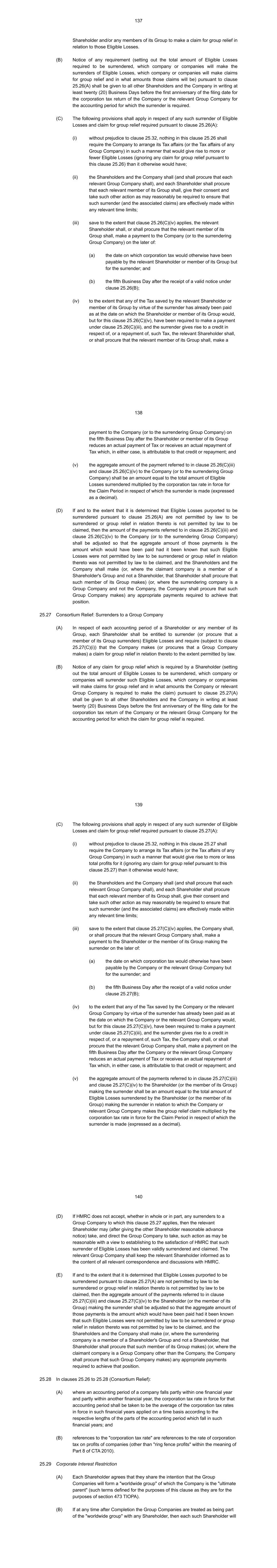 137 Shareholder and/or any members of its Group to make a claim for group relief in relation to those Eligible Losses. (B) Notice of any requirement (setting out the total amount of Eligible Losses required to be surrendered, which company or companies will make the surrenders of Eligible Losses, which company or companies will make claims for group relief and in what amounts those claims will be) pursuant to clause 25.26(A) shall be given to all other Shareholders and the Company in writing at least twenty (20) Business Days before the first anniversary of the filing date for the corporation tax return of the Company or the relevant Group Company for the accounting period for which the surrender is required. (C) The following provisions shall apply in respect of any such surrender of Eligible Losses and claim for group relief required pursuant to clause 25.26(A): (i) without prejudice to clause 25.32, nothing in this clause 25.26 shall require the Company to arrange its Tax affairs (or the Tax affairs of any Group Company) in such a manner that would give rise to more or fewer Eligible Losses (ignoring any claim for group relief pursuant to this clause 25.26) than it otherwise would have; (ii) the Shareholders and the Company shall (and shall procure that each relevant Group Company shall), and each Shareholder shall procure that each relevant member of its Group shall, give their consent and take such other action as may reasonably be required to ensure that such surrender (and the associated claims) are effectively made within any relevant time limits; (iii) save to the extent that clause 25.26(C)(iv) applies, the relevant Shareholder shall, or shall procure that the relevant member of its Group shall, make a payment to the Company (or to the surrendering Group Company) on the later of: (a) the date on which corporation tax would otherwise have been payable by the relevant Shareholder or member of its Group but for the surrender; and (b) the fifth Business Day after the receipt of a valid notice under clause 25.26(B); (iv) to the extent that any of the Tax saved by the relevant Shareholder or member of its Group by virtue of the surrender has already been paid as at the date on which the Shareholder or member of its Group would, but for this clause 25.26(C)(iv), have been required to make a payment under clause 25.26(C)(iii), and the surrender gives rise to a credit in respect of, or a repayment of, such Tax, the relevant Shareholder shall, or shall procure that the relevant member of its Group shall, make a 138 payment to the Company (or to the surrendering Group Company) on the fifth Business Day after the Shareholder or member of its Group reduces an actual payment of Tax or receives an actual repayment of Tax which, in either case, is attributable to that credit or repayment; and (v) the aggregate amount of the payment referred to in clause 25.26(C)(iii) and clause 25.26(C)(iv) to the Company (or to the surrendering Group Company) shall be an amount equal to the total amount of Eligible Losses surrendered multiplied by the corporation tax rate in force for the Claim Period in respect of which the surrender is made (expressed as a decimal). (D) If and to the extent that it is determined that Eligible Losses purported to be surrendered pursuant to clause 25.26(A) are not permitted by law to be surrendered or group relief in relation thereto is not permitted by law to be claimed, then the amount of the payments referred to in clause 25.26(C)(iii) and clause 25.26(C)(iv) to the Company (or to the surrendering Group Company) shall be adjusted so that the aggregate amount of those payments is the amount which would have been paid had it been known that such Eligible Losses were not permitted by law to be surrendered or group relief in relation thereto was not permitted by law to be claimed, and the Shareholders and the Company shall make (or, where the claimant company is a member of a Shareholder's Group and not a Shareholder, that Shareholder shall procure that such member of its Group makes) (or, where the surrendering company is a Group Company and not the Company, the Company shall procure that such Group Company makes) any appropriate payments required to achieve that position. 25.27 Consortium Relief: Surrenders to a Group Company (A) In respect of each accounting period of a Shareholder or any member of its Group, each Shareholder shall be entitled to surrender (or procure that a member of its Group surrenders) Eligible Losses and require (subject to clause 25.27(C)(i)) that the Company makes (or procures that a Group Company makes) a claim for group relief in relation thereto to the extent permitted by law. (B) Notice of any claim for group relief which is required by a Shareholder (setting out the total amount of Eligible Losses to be surrendered, which company or companies will surrender such Eligible Losses, which company or companies will make claims for group relief and in what amounts the Company or relevant Group Company is required to make the claim) pursuant to clause 25.27(A) shall be given to all other Shareholders and the Company in writing at least twenty (20) Business Days before the first anniversary of the filing date for the corporation tax return of the Company or the relevant Group Company for the accounting period for which the claim for group relief is required. 139 (C) The following provisions shall apply in respect of any such surrender of Eligible Losses and claim for group relief required pursuant to clause 25.27(A): (i) without prejudice to clause 25.32, nothing in this clause 25.27 shall require the Company to arrange its Tax affairs (or the Tax affairs of any Group Company) in such a manner that would give rise to more or less total profits for it (ignoring any claim for group relief pursuant to this clause 25.27) than it otherwise would have; (ii) the Shareholders and the Company shall (and shall procure that each relevant Group Company shall), and 