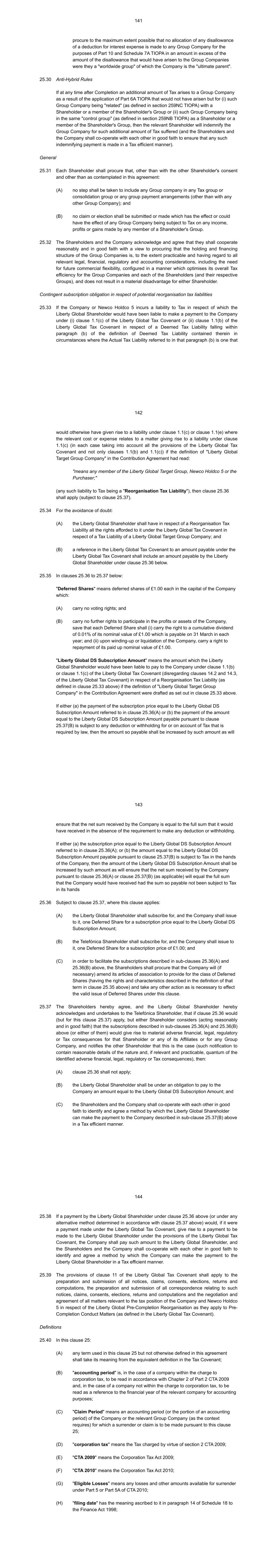 141 procure to the maximum extent possible that no allocation of any disallowance of a deduction for interest expense is made to any Group Company for the purposes of Part 10 and Schedule 7A TIOPA in an amount in excess of the amount of the disallowance that would have arisen to the Group Companies were they a "worldwide group" of which the Company is the "ultimate parent". 25.30 Anti-Hybrid Rules If at any time after Completion an additional amount of Tax arises to a Group Company as a result of the application of Part 6A TIOPA that would not have arisen but for (i) such Group Company being "related" (as defined in section 259NC TIOPA) with a Shareholder or a member of the Shareholder's Group or (ii) such Group Company being in the same "control group" (as defined in section 259NB TIOPA) as a Shareholder or a member of the Shareholder's Group, then the relevant Shareholder will indemnify the Group Company for such additional amount of Tax suffered (and the Shareholders and the Company shall co-operate with each other in good faith to ensure that any such indemnifying payment is made in a Tax efficient manner). General 25.31 Each Shareholder shall procure that, other than with the other Shareholder's consent and other than as contemplated in this agreement: (A) no step shall be taken to include any Group company in any Tax group or consolidation group or any group payment arrangements (other than with any other Group Company); and (B) no claim or election shall be submitted or made which has the effect or could have the effect of any Group Company being subject to Tax on any income, profits or gains made by any member of a Shareholder's Group. 25.32 The Shareholders and the Company acknowledge and agree that they shall cooperate reasonably and in good faith with a view to procuring that the holding and financing structure of the Group Companies is, to the extent practicable and having regard to all relevant legal, financial, regulatory and accounting considerations, including the need for future commercial flexibility, configured in a manner which optimises its overall Tax efficiency for the Group Companies and each of the Shareholders (and their respective Groups), and does not result in a material disadvantage for either Shareholder. Contingent subscription obligation in respect of potential reorganisation tax liabilities 25.33 If the Company or Newco Holdco 5 incurs a liability to Tax in respect of which the Liberty Global Shareholder would have been liable to make a payment to the Company under (i) clause 1.1(c) of the Liberty Global Tax Covenant or (ii) clause 1.1(b) of the Liberty Global Tax Covenant in respect of a Deemed Tax Liability falling within paragraph (b) of the definition of Deemed Tax Liability contained therein in circumstances where the Actual Tax Liability referred to in that paragraph (b) is one that 142 would otherwise have given rise to a liability under clause 1.1(c) or clause 1.1(e) where the relevant cost or expense relates to a matter giving rise to a liability under clause 1.1(c) (in each case taking into account all the provisions of the Liberty Global Tax Covenant and not only clauses 1.1(b) and 1.1(c)) if the definition of "Liberty Global Target Group Company" in the Contribution Agreement had read: "means any member of the Liberty Global Target Group, Newco Holdco 5 or the Purchaser;" (any such liability to Tax being a "Reorganisation Tax Liability"), then clause 25.36 shall apply (subject to clause 25.37). 25.34 For the avoidance of doubt: (A) the Liberty Global Shareholder shall have in respect of a Reorganisation Tax Liability all the rights afforded to it under the Liberty Global Tax Covenant in respect of a Tax Liability of a Liberty Global Target Group Company; and (B) a reference in the Liberty Global Tax Covenant to an amount payable under the Liberty Global Tax Covenant shall include an amount payable by the Liberty Global Shareholder under clause 25.36 below. 25.35 In clauses 25.36 to 25.37 below: "Deferred Shares" means deferred shares of £1.00 each in the capital of the Company which: (A) carry no voting rights; and (B) carry no further rights to participate in the profits or assets of the Company, save that each Deferred Share shall (i) carry the right to a cumulative dividend of 0.01% of its nominal value of £1.00 which is payable on 31 March in each year; and (ii) upon winding-up or liquidation of the Company, carry a right to repayment of its paid up nominal value of £1.00. "Liberty Global DS Subscription Amount" means the amount which the Liberty Global Shareholder would have been liable to pay to the Company under clause 1.1(b) or clause 1.1(c) of the Liberty Global Tax Covenant (disregarding clauses 14.2 and 14.3, of the Liberty Global Tax Covenant) in respect of a Reorganisation Tax Liability (as defined in clause 25.33 above) if the definition of "Liberty Global Target Group Company" in the Contribution Agreement were drafted as set out in clause 25.33 above. If either (a) the payment of the subscription price equal to the Liberty Global DS Subscription Amount referred to in clause 25.36(A) or (b) the payment of the amount equal to the Liberty Global DS Subscription Amount payable pursuant to clause 25.37(B) is subject to any deduction or withholding for or on account of Tax that is required by law, then the amount so payable shall be increased by such amount as will 143 ensure that the net sum received by the Company is equal to the full sum that it would have received in the absence of the requirement to make any deduction or withholding. If either (a) the subscription price equal to the Liberty Global DS Subscription Amount referred to in clause 25.36(A); or (b) the amount equal to the Liberty Global DS Subscription Amount payable pursuant to clause 25.37(B) is subject to Tax in the hands of the Company, then the amount of the Liberty Global DS Subscription Amount shall be increased by such amount as will ensure that the net sum
