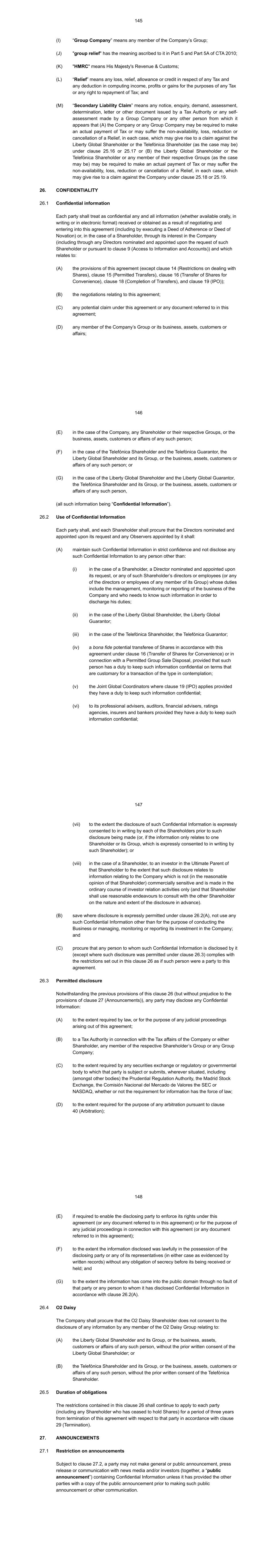 145 (I) “Group Company” means any member of the Company’s Group; (J) "group relief" has the meaning ascribed to it in Part 5 and Part 5A of CTA 2010; (K) "HMRC" means His Majesty's Revenue & Customs; (L) “Relief” means any loss, relief, allowance or credit in respect of any Tax and any deduction in computing income, profits or gains for the purposes of any Tax or any right to repayment of Tax; and (M) “Secondary Liability Claim” means any notice, enquiry, demand, assessment, determination, letter or other document issued by a Tax Authority or any self- assessment made by a Group Company or any other person from which it appears that (A) the Company or any Group Company may be required to make an actual payment of Tax or may suffer the non-availability, loss, reduction or cancellation of a Relief, in each case, which may give rise to a claim against the Liberty Global Shareholder or the Telefónica Shareholder (as the case may be) under clause 25.16 or 25.17 or (B) the Liberty Global Shareholder or the Telefónica Shareholder or any member of their respective Groups (as the case may be) may be required to make an actual payment of Tax or may suffer the non-availability, loss, reduction or cancellation of a Relief, in each case, which may give rise to a claim against the Company under clause 25.18 or 25.19. 26. CONFIDENTIALITY 26.1 Confidential information Each party shall treat as confidential any and all information (whether available orally, in writing or in electronic format) received or obtained as a result of negotiating and entering into this agreement (including by executing a Deed of Adherence or Deed of Novation) or, in the case of a Shareholder, through its interest in the Company (including through any Directors nominated and appointed upon the request of such Shareholder or pursuant to clause 9 (Access to Information and Accounts)) and which relates to: (A) the provisions of this agreement (except clause 14 (Restrictions on dealing with Shares), clause 15 (Permitted Transfers), clause 16 (Transfer of Shares for Convenience), clause 18 (Completion of Transfers), and clause 19 (IPO)); (B) the negotiations relating to this agreement; (C) any potential claim under this agreement or any document referred to in this agreement; (D) any member of the Company’s Group or its business, assets, customers or affairs; 146 (E) in the case of the Company, any Shareholder or their respective Groups, or the business, assets, customers or affairs of any such person; (F) in the case of the Telefónica Shareholder and the Telefónica Guarantor, the Liberty Global Shareholder and its Group, or the business, assets, customers or affairs of any such person; or (G) in the case of the Liberty Global Shareholder and the Liberty Global Guarantor, the Telefónica Shareholder and its Group, or the business, assets, customers or affairs of any such person, (all such information being “Confidential Information”). 26.2 Use of Confidential Information Each party shall, and each Shareholder shall procure that the Directors nominated and appointed upon its request and any Observers appointed by it shall: (A) maintain such Confidential Information in strict confidence and not disclose any such Confidential Information to any person other than: (i) in the case of a Shareholder, a Director nominated and appointed upon its request, or any of such Shareholder’s directors or employees (or any of the directors or employees of any member of its Group) whose duties include the management, monitoring or reporting of the business of the Company and who needs to know such information in order to discharge his duties; (ii) in the case of the Liberty Global Shareholder, the Liberty Global Guarantor; (iii) in the case of the Telefónica Shareholder, the Telefónica Guarantor; (iv) a bona fide potential transferee of Shares in accordance with this agreement under clause 16 (Transfer of Shares for Convenience) or in connection with a Permitted Group Sale Disposal, provided that such person has a duty to keep such information confidential on terms that are customary for a transaction of the type in contemplation; (v) the Joint Global Coordinators where clause 19 (IPO) applies provided they have a duty to keep such information confidential; (vi) to its professional advisers, auditors, financial advisers, ratings agencies, insurers and bankers provided they have a duty to keep such information confidential; 147 (vii) to the extent the disclosure of such Confidential Information is expressly consented to in writing by each of the Shareholders prior to such disclosure being made (or, if the information only relates to one Shareholder or its Group, which is expressly consented to in writing by such Shareholder); or (viii) in the case of a Shareholder, to an investor in the Ultimate Parent of that Shareholder to the extent that such disclosure relates to information relating to the Company which is not (in the reasonable opinion of that Shareholder) commercially sensitive and is made in the ordinary course of investor relation activities only (and that Shareholder shall use reasonable endeavours to consult with the other Shareholder on the nature and extent of the disclosure in advance). (B) save where disclosure is expressly permitted under clause 26.2(A), not use any such Confidential Information other than for the purpose of conducting the Business or managing, monitoring or reporting its investment in the Company; and (C) procure that any person to whom such Confidential Information is disclosed by it (except where such disclosure was permitted under clause 26.3) complies with the restrictions set out in this clause 26 as if such person were a party to this agreement. 26.3 Permitted disclosure Notwithstanding the previous provisions of this clause 26 (but without prejudice to the provisions of clause 27 (Announcements)), any party may disclose any Confidential Information: (A) to the extent required by law, or