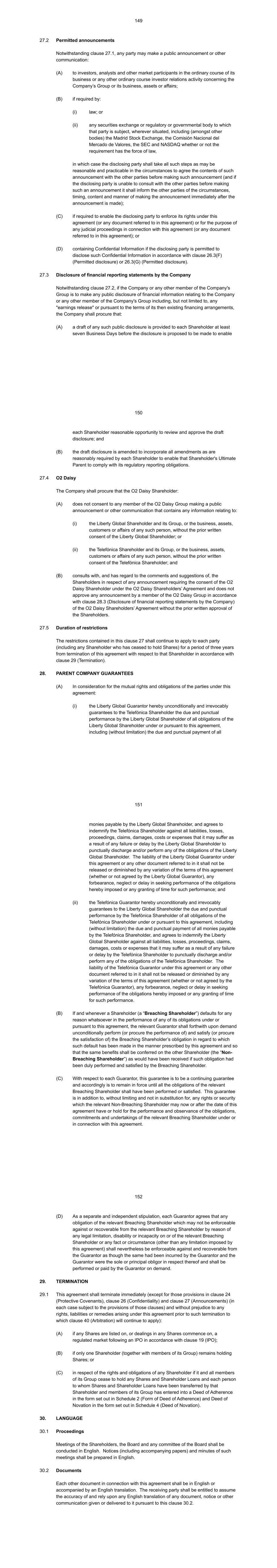 149 27.2 Permitted announcements Notwithstanding clause 27.1, any party may make a public announcement or other communication: (A) to investors, analysts and other market participants in the ordinary course of its business or any other ordinary course investor relations activity concerning the Company’s Group or its business, assets or affairs; (B) if required by: (i) law; or (ii) any securities exchange or regulatory or governmental body to which that party is subject, wherever situated, including (amongst other bodies) the Madrid Stock Exchange, the Comisión Nacional del Mercado de Valores, the SEC and NASDAQ whether or not the requirement has the force of law, in which case the disclosing party shall take all such steps as may be reasonable and practicable in the circumstances to agree the contents of such announcement with the other parties before making such announcement (and if the disclosing party is unable to consult with the other parties before making such an announcement it shall inform the other parties of the circumstances, timing, content and manner of making the announcement immediately after the announcement is made); (C) if required to enable the disclosing party to enforce its rights under this agreement (or any document referred to in this agreement) or for the purpose of any judicial proceedings in connection with this agreement (or any document referred to in this agreement); or (D) containing Confidential Information if the disclosing party is permitted to disclose such Confidential Information in accordance with clause 26.3(F) (Permitted disclosure) or 26.3(G) (Permitted disclosure). 27.3 Disclosure of financial reporting statements by the Company Notwithstanding clause 27.2, if the Company or any other member of the Company's Group is to make any public disclosure of financial information relating to the Company or any other member of the Company's Group including, but not limited to, any "earnings release" or pursuant to the terms of its then existing financing arrangements, the Company shall procure that: (A) a draft of any such public disclosure is provided to each Shareholder at least seven Business Days before the disclosure is proposed to be made to enable 150 each Shareholder reasonable opportunity to review and approve the draft disclosure; and (B) the draft disclosure is amended to incorporate all amendments as are reasonably required by each Shareholder to enable that Shareholder's Ultimate Parent to comply with its regulatory reporting obligations. 27.4 O2 Daisy The Company shall procure that the O2 Daisy Shareholder: (A) does not consent to any member of the O2 Daisy Group making a public announcement or other communication that contains any information relating to: (i) the Liberty Global Shareholder and its Group, or the business, assets, customers or affairs of any such person, without the prior written consent of the Liberty Global Shareholder; or (ii) the Telefónica Shareholder and its Group, or the business, assets, customers or affairs of any such person, without the prior written consent of the Telefónica Shareholder; and (B) consults with, and has regard to the comments and suggestions of, the Shareholders in respect of any announcement requiring the consent of the O2 Daisy Shareholder under the O2 Daisy Shareholders’ Agreement and does not approve any announcement by a member of the O2 Daisy Group in accordance with clause 28.3 (Disclosure of financial reporting statements by the Company) of the O2 Daisy Shareholders’ Agreement without the prior written approval of the Shareholders. 27.5 Duration of restrictions The restrictions contained in this clause 27 shall continue to apply to each party (including any Shareholder who has ceased to hold Shares) for a period of three years from termination of this agreement with respect to that Shareholder in accordance with clause 29 (Termination). 28. PARENT COMPANY GUARANTEES (A) In consideration for the mutual rights and obligations of the parties under this agreement: (i) the Liberty Global Guarantor hereby unconditionally and irrevocably guarantees to the Telefónica Shareholder the due and punctual performance by the Liberty Global Shareholder of all obligations of the Liberty Global Shareholder under or pursuant to this agreement, including (without limitation) the due and punctual payment of all 151 monies payable by the Liberty Global Shareholder, and agrees to indemnify the Telefónica Shareholder against all liabilities, losses, proceedings, claims, damages, costs or expenses that it may suffer as a result of any failure or delay by the Liberty Global Shareholder to punctually discharge and/or perform any of the obligations of the Liberty Global Shareholder. The liability of the Liberty Global Guarantor under this agreement or any other document referred to in it shall not be released or diminished by any variation of the terms of this agreement (whether or not agreed by the Liberty Global Guarantor), any forbearance, neglect or delay in seeking performance of the obligations hereby imposed or any granting of time for such performance; and (ii) the Telefónica Guarantor hereby unconditionally and irrevocably guarantees to the Liberty Global Shareholder the due and punctual performance by the Telefónica Shareholder of all obligations of the Telefónica Shareholder under or pursuant to this agreement, including (without limitation) the due and punctual payment of all monies payable by the Telefónica Shareholder, and agrees to indemnify the Liberty Global Shareholder against all liabilities, losses, proceedings, claims, damages, costs or expenses that it may suffer as a result of any failure or delay by the Telefónica Shareholder to punctually discharge and/or perform any of the obligations of the Telefónica Shareholder. The liability of the Telefónica Guarantor under this agreement or any other document referred to in it shall not be released or diminished by any variation of the t
