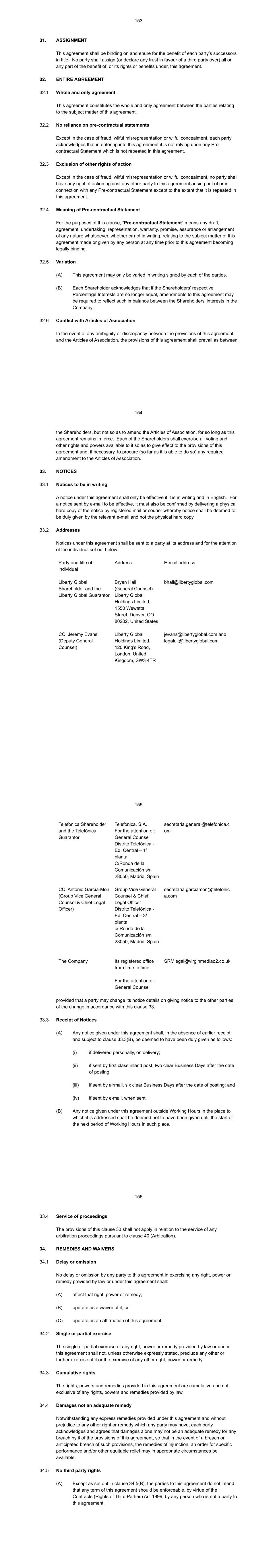 153 31. ASSIGNMENT This agreement shall be binding on and enure for the benefit of each party’s successors in title. No party shall assign (or declare any trust in favour of a third party over) all or any part of the benefit of, or its rights or benefits under, this agreement. 32. ENTIRE AGREEMENT 32.1 Whole and only agreement This agreement constitutes the whole and only agreement between the parties relating to the subject matter of this agreement. 32.2 No reliance on pre-contractual statements Except in the case of fraud, wilful misrepresentation or wilful concealment, each party acknowledges that in entering into this agreement it is not relying upon any Pre- contractual Statement which is not repeated in this agreement. 32.3 Exclusion of other rights of action Except in the case of fraud, wilful misrepresentation or wilful concealment, no party shall have any right of action against any other party to this agreement arising out of or in connection with any Pre-contractual Statement except to the extent that it is repeated in this agreement. 32.4 Meaning of Pre-contractual Statement For the purposes of this clause, “Pre-contractual Statement” means any draft, agreement, undertaking, representation, warranty, promise, assurance or arrangement of any nature whatsoever, whether or not in writing, relating to the subject matter of this agreement made or given by any person at any time prior to this agreement becoming legally binding. 32.5 Variation (A) This agreement may only be varied in writing signed by each of the parties. (B) Each Shareholder acknowledges that if the Shareholders’ respective Percentage Interests are no longer equal, amendments to this agreement may be required to reflect such imbalance between the Shareholders’ interests in the Company. 32.6 Conflict with Articles of Association In the event of any ambiguity or discrepancy between the provisions of this agreement and the Articles of Association, the provisions of this agreement shall prevail as between 154 the Shareholders, but not so as to amend the Articles of Association, for so long as this agreement remains in force. Each of the Shareholders shall exercise all voting and other rights and powers available to it so as to give effect to the provisions of this agreement and, if necessary, to procure (so far as it is able to do so) any required amendment to the Articles of Association. 33. NOTICES 33.1 Notices to be in writing A notice under this agreement shall only be effective if it is in writing and in English. For a notice sent by e-mail to be effective, it must also be confirmed by delivering a physical hard copy of the notice by registered mail or courier whereby notice shall be deemed to be duly given by the relevant e-mail and not the physical hard copy. 33.2 Addresses Notices under this agreement shall be sent to a party at its address and for the attention of the individual set out below: Party and title of individual Address E-mail address Liberty Global Shareholder and the Liberty Global Guarantor Bryan Hall (General Counsel) Liberty Global Holdings Limited, 1550 Wewatta Street, Denver, CO 80202, United States bhall@libertyglobal.com CC: Jeremy Evans (Deputy General Counsel) Liberty Global Holdings Limited, 120 King’s Road, London, United Kingdom, SW3 4TR jevans@libertyglobal.com and legaluk@libertyglobal.com 155 Telefónica Shareholder and the Telefónica Guarantor Telefónica, S.A. For the attention of: General Counsel Distrito Telefónica - Ed. Central – 1ª planta C/Ronda de la Comunicación s/n 28050, Madrid, Spain secretaria.general@telefonica.c om CC: Antonio García-Mon (Group Vice General Counsel & Chief Legal Officer) Group Vice General Counsel & Chief Legal Officer Distrito Telefónica - Ed. Central – 3ª planta c/ Ronda de la Comunicación s/n 28050, Madrid, Spain secretaria.garciamon@telefonic a.com The Company Its registered office from time to time For the attention of: General Counsel SRMlegal@virginmediao2.co.uk provided that a party may change its notice details on giving notice to the other parties of the change in accordance with this clause 33. 33.3 Receipt of Notices (A) Any notice given under this agreement shall, in the absence of earlier receipt and subject to clause 33.3(B), be deemed to have been duly given as follows: (i) if delivered personally, on delivery; (ii) if sent by first class inland post, two clear Business Days after the date of posting; (iii) if sent by airmail, six clear Business Days after the date of posting; and (iv) if sent by e-mail, when sent. (B) Any notice given under this agreement outside Working Hours in the place to which it is addressed shall be deemed not to have been given until the start of the next period of Working Hours in such place. 156 33.4 Service of proceedings The provisions of this clause 33 shall not apply in relation to the service of any arbitration proceedings pursuant to clause 40 (Arbitration). 34. REMEDIES AND WAIVERS 34.1 Delay or omission No delay or omission by any party to this agreement in exercising any right, power or remedy provided by law or under this agreement shall: (A) affect that right, power or remedy; (B) operate as a waiver of it; or (C) operate as an affirmation of this agreement. 34.2 Single or partial exercise The single or partial exercise of any right, power or remedy provided by law or under this agreement shall not, unless otherwise expressly stated, preclude any other or further exercise of it or the exercise of any other right, power or remedy. 34.3 Cumulative rights The rights, powers and remedies provided in this agreement are cumulative and not exclusive of any rights, powers and remedies provided by law. 34.4 Damages not an adequate remedy Notwithstanding any express remedies provided under this agreement and without prejudice to any other right or remedy which any party may have, each party acknowledges and agrees that damages alone may not be an adequate remedy for any breach by it 