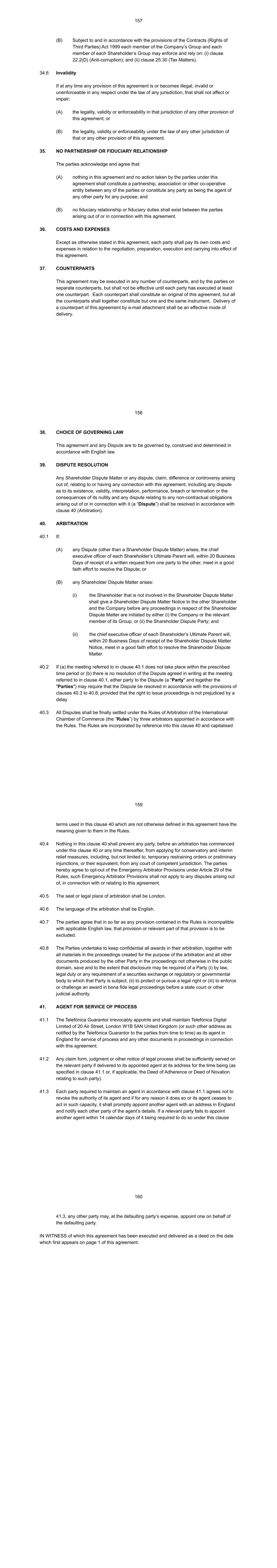 157 (B) Subject to and in accordance with the provisions of the Contracts (Rights of Third Parties) Act 1999 each member of the Company’s Group and each member of each Shareholder’s Group may enforce and rely on: (i) clause 22.2(D) (Anti-corruption); and (ii) clause 25.30 (Tax Matters). 34.6 Invalidity If at any time any provision of this agreement is or becomes illegal, invalid or unenforceable in any respect under the law of any jurisdiction, that shall not affect or impair: (A) the legality, validity or enforceability in that jurisdiction of any other provision of this agreement; or (B) the legality, validity or enforceability under the law of any other jurisdiction of that or any other provision of this agreement. 35. NO PARTNERSHIP OR FIDUCIARY RELATIONSHIP The parties acknowledge and agree that: (A) nothing in this agreement and no action taken by the parties under this agreement shall constitute a partnership, association or other co-operative entity between any of the parties or constitute any party as being the agent of any other party for any purpose; and (B) no fiduciary relationship or fiduciary duties shall exist between the parties arising out of or in connection with this agreement. 36. COSTS AND EXPENSES Except as otherwise stated in this agreement, each party shall pay its own costs and expenses in relation to the negotiation, preparation, execution and carrying into effect of this agreement. 37. COUNTERPARTS This agreement may be executed in any number of counterparts, and by the parties on separate counterparts, but shall not be effective until each party has executed at least one counterpart. Each counterpart shall constitute an original of this agreement, but all the counterparts shall together constitute but one and the same instrument. Delivery of a counterpart of this agreement by e-mail attachment shall be an effective mode of delivery. 158 38. CHOICE OF GOVERNING LAW This agreement and any Dispute are to be governed by, construed and determined in accordance with English law. 39. DISPUTE RESOLUTION Any Shareholder Dispute Matter or any dispute, claim, difference or controversy arising out of, relating to or having any connection with this agreement, including any dispute as to its existence, validity, interpretation, performance, breach or termination or the consequences of its nullity and any dispute relating to any non-contractual obligations arising out of or in connection with it (a “Dispute”) shall be resolved in accordance with clause 40 (Arbitration). 40. ARBITRATION 40.1 If: (A) any Dispute (other than a Shareholder Dispute Matter) arises, the chief executive officer of each Shareholder’s Ultimate Parent will, within 20 Business Days of receipt of a written request from one party to the other, meet in a good faith effort to resolve the Dispute; or (B) any Shareholder Dispute Matter arises: (i) the Shareholder that is not involved in the Shareholder Dispute Matter shall give a Shareholder Dispute Matter Notice to the other Shareholder and the Company before any proceedings in respect of the Shareholder Dispute Matter are initiated by either (i) the Company or the relevant member of its Group, or (ii) the Shareholder Dispute Party; and (ii) the chief executive officer of each Shareholder’s Ultimate Parent will, within 20 Business Days of receipt of the Shareholder Dispute Matter Notice, meet in a good faith effort to resolve the Shareholder Dispute Matter. 40.2 If (a) the meeting referred to in clause 40.1 does not take place within the prescribed time period or (b) there is no resolution of the Dispute agreed in writing at the meeting referred to in clause 40.1, either party to the Dispute (a "Party" and together the "Parties") may require that the Dispute be resolved in accordance with the provisions of clauses 40.3 to 40.8, provided that the right to issue proceedings is not prejudiced by a delay 40.3 All Disputes shall be finally settled under the Rules of Arbitration of the International Chamber of Commerce (the “Rules”) by three arbitrators appointed in accordance with the Rules. The Rules are incorporated by reference into this clause 40 and capitalised 159 terms used in this clause 40 which are not otherwise defined in this agreement have the meaning given to them in the Rules. 40.4 Nothing in this clause 40 shall prevent any party, before an arbitration has commenced under this clause 40 or any time thereafter, from applying for conservatory and interim relief measures, including, but not limited to, temporary restraining orders or preliminary injunctions, or their equivalent, from any court of competent jurisdiction. The parties hereby agree to opt-out of the Emergency Arbitrator Provisions under Article 29 of the Rules; such Emergency Arbitrator Provisions shall not apply to any disputes arising out of, in connection with or relating to this agreement. 40.5 The seat or legal place of arbitration shall be London. 40.6 The language of the arbitration shall be English. 40.7 The parties agree that in so far as any provision contained in the Rules is incompatible with applicable English law, that provision or relevant part of that provision is to be excluded. 40.8 The Parties undertake to keep confidential all awards in their arbitration, together with all materials in the proceedings created for the purpose of the arbitration and all other documents produced by the other Party in the proceedings not otherwise in the public domain, save and to the extent that disclosure may be required of a Party (i) by law, legal duty or any requirement of a securities exchange or regulatory or governmental body to which that Party is subject, (ii) to protect or pursue a legal right or (iii) to enforce or challenge an award in bona fide legal proceedings before a state court or other judicial authority. 41. AGENT FOR SERVICE OF PROCESS 41.1 The Telefónica Guarantor irrevocably appoints and shall maintain Telefónica Digital Limited of 20 Air Street,