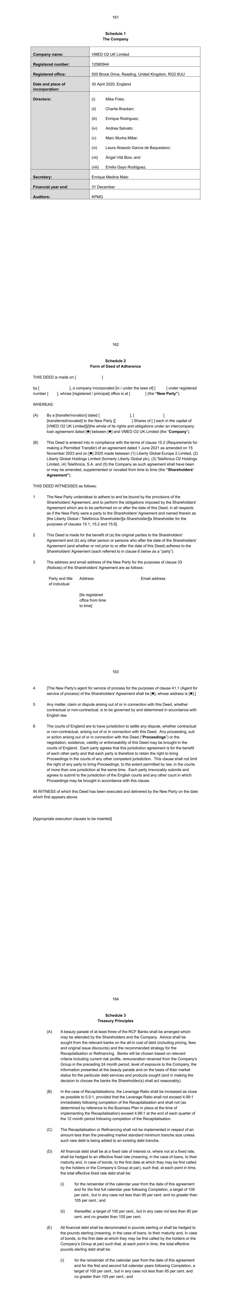 161 Schedule 1 The Company Company name: VMED O2 UK Limited Registered number: 12580944 Registered office: 500 Brook Drive, Reading, United Kingdom, RG2 6UU Date and place of incorporation: 30 April 2020, England Directors: (i) Mike Fries; (ii) Charlie Bracken; (iii) Enrique Rodriguez; (iv) Andrea Salvato; (v) Marc Murtra Millar; (vi) Laura Abasolo García de Baquedano; (vii) Ángel Vilá Boix; and (viii) Emilio Gayo Rodriguez. Secretary: Enrique Medina Malo Financial year end: 31 December Auditors: KPMG 162 Schedule 2 Form of Deed of Adherence THIS DEED is made on [ ] by [ ], a company incorporated [in / under the laws of] [ ] under registered number [ ], whose [registered / principal] office is at [ ] (the “New Party”). WHEREAS: (A) By a [transfer/novation] dated [ ], [ ] [transferred/novated] to the New Party [[ ] Shares of [ ] each in the capital of [VMED O2 UK Limited]]/[the whole of its rights and obligations under an intercompany loan agreement dated [] between [] and VMED O2 UK Limited (the “Company”). (B) This Deed is entered into in compliance with the terms of clause 15.2 (Requirements for making a Permitted Transfer) of an agreement dated 1 June 2021 as amended on 15 November 2023 and on [] 2025 made between (1) Liberty Global Europe 2 Limited, (2) Liberty Global Holdings Limited (formerly Liberty Global plc), (3) Telefónica O2 Holdings Limited, (4) Telefónica, S.A. and (5) the Company as such agreement shall have been or may be amended, supplemented or novated from time to time (the “Shareholders' Agreement”). THIS DEED WITNESSES as follows: 1 The New Party undertakes to adhere to and be bound by the provisions of the Shareholders' Agreement, and to perform the obligations imposed by the Shareholders' Agreement which are to be performed on or after the date of this Deed, in all respects as if the New Party were a party to the Shareholders' Agreement and named therein as [the Liberty Global / Telefónica Shareholder][a Shareholder][a Shareholder for the purposes of clauses 15.1, 15.2 and 15.6]. 2 This Deed is made for the benefit of (a) the original parties to the Shareholders' Agreement and (b) any other person or persons who after the date of the Shareholders' Agreement (and whether or not prior to or after the date of this Deed) adheres to the Shareholders' Agreement (each referred to in clause 6 below as a “party”). 3 The address and email address of the New Party for the purposes of clause 33 (Notices) of the Shareholders' Agreement are as follows: Party and title of individual Address Email address [Its registered office from time to time] 163 4 [The New Party’s agent for service of process for the purposes of clause 41.1 (Agent for service of process) of the Shareholders' Agreement shall be [], whose address is [].] 5 Any matter, claim or dispute arising out of or in connection with this Deed, whether contractual or non-contractual, is to be governed by and determined in accordance with English law. 6 The courts of England are to have jurisdiction to settle any dispute, whether contractual or non-contractual, arising out of or in connection with this Deed. Any proceeding, suit or action arising out of or in connection with this Deed (“Proceedings”) or the negotiation, existence, validity or enforceability of this Deed may be brought in the courts of England. Each party agrees that this jurisdiction agreement is for the benefit of each other party and that each party is therefore to retain the right to bring Proceedings in the courts of any other competent jurisdiction. This clause shall not limit the right of any party to bring Proceedings, to the extent permitted by law, in the courts of more than one jurisdiction at the same time. Each party irrevocably submits and agrees to submit to the jurisdiction of the English courts and any other court in which Proceedings may be brought in accordance with this clause. IN WITNESS of which this Deed has been executed and delivered by the New Party on the date which first appears above. [Appropriate execution clauses to be inserted] 164 Schedule 3 Treasury Principles (A) A beauty parade of at least three of the RCF Banks shall be arranged which may be attended by the Shareholders and the Company. Advice shall be sought from the relevant banks on the all-in cost of debt (including pricing, fees and original issue discounts) and the recommended strategy for the Recapitalisation or Refinancing. Banks will be chosen based on relevant criteria including current risk profile, remuneration received from the Company's Group in the preceding 24 month period, level of exposure to the Company, the information presented at the beauty parade and on the basis of their market status for the particular debt services and products sought (and in making the decision to choose the banks the Shareholder(s) shall act reasonably). (B) In the case of Recapitalisations, the Leverage Ratio shall be increased as close as possible to 5.0:1, provided that the Leverage Ratio shall not exceed 4.99:1 immediately following completion of the Recapitalisation and shall not (as determined by reference to the Business Plan in place at the time of implementing the Recapitalisation) exceed 4.99:1 at the end of each quarter of the 12 month period following completion of the Recapitalisation. (C) The Recapitalisation or Refinancing shall not be implemented in respect of an amount less than the prevailing market standard minimum tranche size unless such new debt is being added to an existing debt tranche. (D) All financial debt shall be at a fixed rate of interest or, where not at a fixed rate, shall be hedged to an effective fixed rate (meaning, in the case of loans, to their maturity and, in case of bonds, to the first date at which they may be first called by the holders or the Company’s Group at par), such that, at each point in time, the total effective fixed rate debt shall be: (i) for the remainder of the calendar year from the date of t