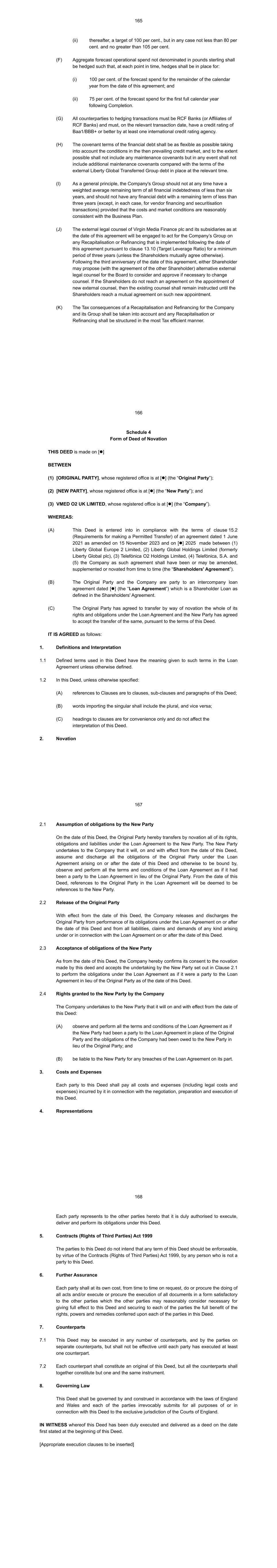 165 (ii) thereafter, a target of 100 per cent., but in any case not less than 80 per cent. and no greater than 105 per cent. (F) Aggregate forecast operational spend not denominated in pounds sterling shall be hedged such that, at each point in time, hedges shall be in place for: (i) 100 per cent. of the forecast spend for the remainder of the calendar year from the date of this agreement; and (ii) 75 per cent. of the forecast spend for the first full calendar year following Completion. (G) All counterparties to hedging transactions must be RCF Banks (or Affiliates of RCF Banks) and must, on the relevant transaction date, have a credit rating of Baa1/BBB+ or better by at least one international credit rating agency. (H) The covenant terms of the financial debt shall be as flexible as possible taking into account the conditions in the then prevailing credit market, and to the extent possible shall not include any maintenance covenants but in any event shall not include additional maintenance covenants compared with the terms of the external Liberty Global Transferred Group debt in place at the relevant time. (I) As a general principle, the Company's Group should not at any time have a weighted average remaining term of all financial indebtedness of less than six years, and should not have any financial debt with a remaining term of less than three years (except, in each case, for vendor financing and securitisation transactions) provided that the costs and market conditions are reasonably consistent with the Business Plan. (J) The external legal counsel of Virgin Media Finance plc and its subsidiaries as at the date of this agreement will be engaged to act for the Company’s Group on any Recapitalisation or Refinancing that is implemented following the date of this agreement pursuant to clause 13.10 (Target Leverage Ratio) for a minimum period of three years (unless the Shareholders mutually agree otherwise). Following the third anniversary of the date of this agreement, either Shareholder may propose (with the agreement of the other Shareholder) alternative external legal counsel for the Board to consider and approve if necessary to change counsel. If the Shareholders do not reach an agreement on the appointment of new external counsel, then the existing counsel shall remain instructed until the Shareholders reach a mutual agreement on such new appointment. (K) The Tax consequences of a Recapitalisation and Refinancing for the Company and its Group shall be taken into account and any Recapitalisation or Refinancing shall be structured in the most Tax efficient manner. 166 Schedule 4 Form of Deed of Novation THIS DEED is made on [] BETWEEN (1) [ORIGINAL PARTY], whose registered office is at [] (the “Original Party”); (2) [NEW PARTY], whose registered office is at [] (the “New Party”); and (3) VMED O2 UK LIMITED, whose registered office is at [] (the “Company”). WHEREAS: (A) This Deed is entered into in compliance with the terms of clause 15.2 (Requirements for making a Permitted Transfer) of an agreement dated 1 June 2021 as amended on 15 November 2023 and on [] 2025 made between (1) Liberty Global Europe 2 Limited, (2) Liberty Global Holdings Limited (formerly Liberty Global plc), (3) Telefónica O2 Holdings Limited, (4) Telefónica, S.A. and (5) the Company as such agreement shall have been or may be amended, supplemented or novated from time to time (the “Shareholders' Agreement”). (B) The Original Party and the Company are party to an intercompany loan agreement dated [] (the “Loan Agreement”) which is a Shareholder Loan as defined in the Shareholders' Agreement. (C) The Original Party has agreed to transfer by way of novation the whole of its rights and obligations under the Loan Agreement and the New Party has agreed to accept the transfer of the same, pursuant to the terms of this Deed. IT IS AGREED as follows: 1. Definitions and Interpretation 1.1 Defined terms used in this Deed have the meaning given to such terms in the Loan Agreement unless otherwise defined. 1.2 In this Deed, unless otherwise specified: (A) references to Clauses are to clauses, sub-clauses and paragraphs of this Deed; (B) words importing the singular shall include the plural, and vice versa; (C) headings to clauses are for convenience only and do not affect the interpretation of this Deed. 2. Novation 167 2.1 Assumption of obligations by the New Party On the date of this Deed, the Original Party hereby transfers by novation all of its rights, obligations and liabilities under the Loan Agreement to the New Party. The New Party undertakes to the Company that it will, on and with effect from the date of this Deed, assume and discharge all the obligations of the Original Party under the Loan Agreement arising on or after the date of this Deed and otherwise to be bound by, observe and perform all the terms and conditions of the Loan Agreement as if it had been a party to the Loan Agreement in lieu of the Original Party. From the date of this Deed, references to the Original Party in the Loan Agreement will be deemed to be references to the New Party. 2.2 Release of the Original Party With effect from the date of this Deed, the Company releases and discharges the Original Party from performance of its obligations under the Loan Agreement on or after the date of this Deed and from all liabilities, claims and demands of any kind arising under or in connection with the Loan Agreement on or after the date of this Deed. 2.3 Acceptance of obligations of the New Party As from the date of this Deed, the Company hereby confirms its consent to the novation made by this deed and accepts the undertaking by the New Party set out in Clause 2.1 to perform the obligations under the Loan Agreement as if it were a party to the Loan Agreement in lieu of the Original Party as of the date of this Deed. 2.4 Rights granted to the New Party by the Company The Company undertakes to the New Party that it will on and with