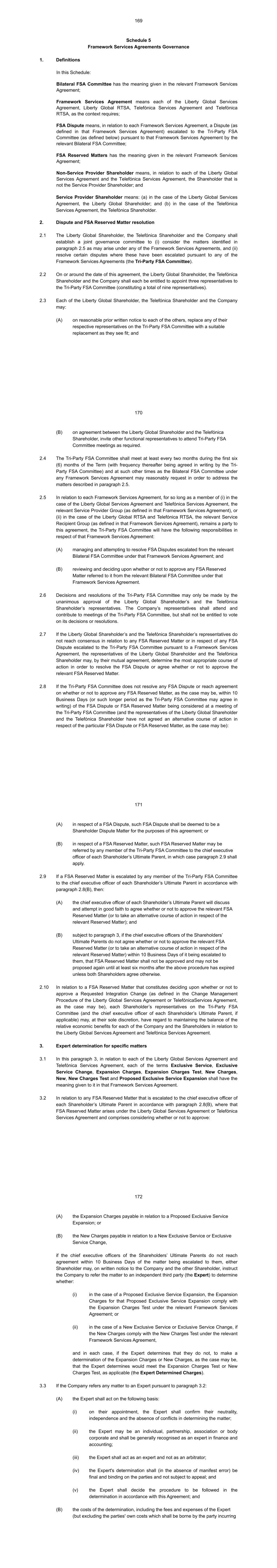 169 Schedule 5 Framework Services Agreements Governance 1. Definitions In this Schedule: Bilateral FSA Committee has the meaning given in the relevant Framework Services Agreement; Framework Services Agreement means each of the Liberty Global Services Agreement, Liberty Global RTSA, Telefónica Services Agreement and Telefónica RTSA, as the context requires; FSA Dispute means, in relation to each Framework Services Agreement, a Dispute (as defined in that Framework Services Agreement) escalated to the Tri-Party FSA Committee (as defined below) pursuant to that Framework Services Agreement by the relevant Bilateral FSA Committee; FSA Reserved Matters has the meaning given in the relevant Framework Services Agreement; Non-Service Provider Shareholder means, in relation to each of the Liberty Global Services Agreement and the Telefónica Services Agreement, the Shareholder that is not the Service Provider Shareholder; and Service Provider Shareholder means: (a) in the case of the Liberty Global Services Agreement, the Liberty Global Shareholder; and (b) in the case of the Telefónica Services Agreement, the Telefónica Shareholder. 2. Dispute and FSA Reserved Matter resolution 2.1 The Liberty Global Shareholder, the Telefónica Shareholder and the Company shall establish a joint governance committee to (i) consider the matters identified in paragraph 2.5 as may arise under any of the Framework Services Agreements, and (ii) resolve certain disputes where these have been escalated pursuant to any of the Framework Services Agreements (the Tri-Party FSA Committee). 2.2 On or around the date of this agreement, the Liberty Global Shareholder, the Telefónica Shareholder and the Company shall each be entitled to appoint three representatives to the Tri-Party FSA Committee (constituting a total of nine representatives). 2.3 Each of the Liberty Global Shareholder, the Telefónica Shareholder and the Company may: (A) on reasonable prior written notice to each of the others, replace any of their respective representatives on the Tri-Party FSA Committee with a suitable replacement as they see fit; and 170 (B) on agreement between the Liberty Global Shareholder and the Telefónica Shareholder, invite other functional representatives to attend Tri-Party FSA Committee meetings as required. 2.4 The Tri-Party FSA Committee shall meet at least every two months during the first six (6) months of the Term (with frequency thereafter being agreed in writing by the Tri- Party FSA Committee) and at such other times as the Bilateral FSA Committee under any Framework Services Agreement may reasonably request in order to address the matters described in paragraph 2.5. 2.5 In relation to each Framework Services Agreement, for so long as a member of (i) in the case of the Liberty Global Services Agreement and Telefónica Services Agreement, the relevant Service Provider Group (as defined in that Framework Services Agreement), or (ii) in the case of the Liberty Global RTSA and Telefónica RTSA, the relevant Service Recipient Group (as defined in that Framework Services Agreement), remains a party to this agreement, the Tri-Party FSA Committee will have the following responsibilities in respect of that Framework Services Agreement: (A) managing and attempting to resolve FSA Disputes escalated from the relevant Bilateral FSA Committee under that Framework Services Agreement; and (B) reviewing and deciding upon whether or not to approve any FSA Reserved Matter referred to it from the relevant Bilateral FSA Committee under that Framework Services Agreement. 2.6 Decisions and resolutions of the Tri-Party FSA Committee may only be made by the unanimous approval of the Liberty Global Shareholder’s and the Telefónica Shareholder’s representatives. The Company’s representatives shall attend and contribute to meetings of the Tri-Party FSA Committee, but shall not be entitled to vote on its decisions or resolutions. 2.7 If the Liberty Global Shareholder’s and the Telefónica Shareholder’s representatives do not reach consensus in relation to any FSA Reserved Matter or in respect of any FSA Dispute escalated to the Tri-Party FSA Committee pursuant to a Framework Services Agreement, the representatives of the Liberty Global Shareholder and the Telefónica Shareholder may, by their mutual agreement, determine the most appropriate course of action in order to resolve the FSA Dispute or agree whether or not to approve the relevant FSA Reserved Matter. 2.8 If the Tri-Party FSA Committee does not resolve any FSA Dispute or reach agreement on whether or not to approve any FSA Reserved Matter, as the case may be, within 10 Business Days (or such longer period as the Tri-Party FSA Committee may agree in writing) of the FSA Dispute or FSA Reserved Matter being considered at a meeting of the Tri-Party FSA Committee (and the representatives of the Liberty Global Shareholder and the Telefónica Shareholder have not agreed an alternative course of action in respect of the particular FSA Dispute or FSA Reserved Matter, as the case may be): 171 (A) in respect of a FSA Dispute, such FSA Dispute shall be deemed to be a Shareholder Dispute Matter for the purposes of this agreement; or (B) in respect of a FSA Reserved Matter, such FSA Reserved Matter may be referred by any member of the Tri-Party FSA Committee to the chief executive officer of each Shareholder’s Ultimate Parent, in which case paragraph 2.9 shall apply. 2.9 If a FSA Reserved Matter is escalated by any member of the Tri-Party FSA Committee to the chief executive officer of each Shareholder’s Ultimate Parent in accordance with paragraph 2.8(B), then: (A) the chief executive officer of each Shareholder’s Ultimate Parent will discuss and attempt in good faith to agree whether or not to approve the relevant FSA Reserved Matter (or to take an alternative course of action in respect of the relevant Reserved Matter); and (B) subject to paragraph 3, if the chief executive offi