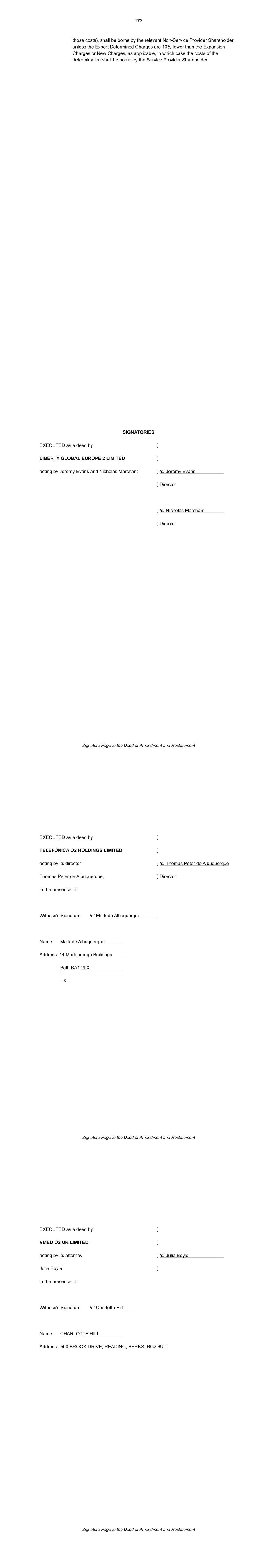 173 those costs), shall be borne by the relevant Non-Service Provider Shareholder, unless the Expert Determined Charges are 10% lower than the Expansion Charges or New Charges, as applicable, in which case the costs of the determination shall be borne by the Service Provider Shareholder. SIGNATORIES EXECUTED as a deed by ) LIBERTY GLOBAL EUROPE 2 LIMITED ) acting by Jeremy Evans and Nicholas Marchant ) /s/ Jeremy Evans ) Director ) /s/ Nicholas Marchant ) Director Signature Page to the Deed of Amendment and Restatement EXECUTED as a deed by ) TELEFÓNICA O2 HOLDINGS LIMITED ) acting by its director ) /s/ Thomas Peter de Albuquerque Thomas Peter de Albuquerque, ) Director in the presence of: Witness's Signature /s/ Mark de Albuquerque Name: Mark de Albuquerque Address: 14 Marlborough Buildings Bath BA1 2LX UK Signature Page to the Deed of Amendment and Restatement EXECUTED as a deed by ) VMED O2 UK LIMITED ) acting by its attorney ) /s/ Julia Boyle Julia Boyle ) in the presence of: Witness's Signature /s/ Charlotte Hill Name: CHARLOTTE HILL Address: 500 BROOK DRIVE, READING, BERKS. RG2 6UU Signature Page to the Deed of Amendment and Restatement