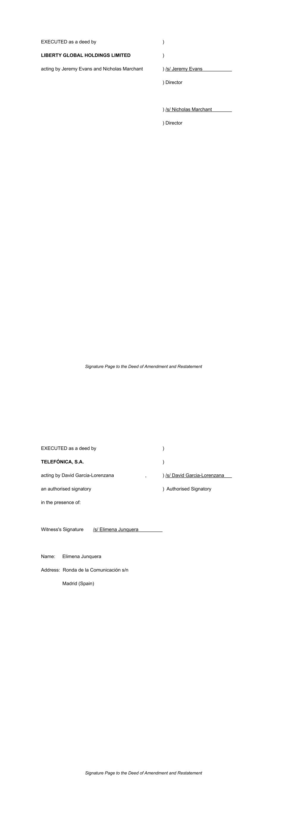 EXECUTED as a deed by ) LIBERTY GLOBAL HOLDINGS LIMITED ) acting by Jeremy Evans and Nicholas Marchant ) /s/ Jeremy Evans ) Director ) /s/ Nicholas Marchant ) Director Signature Page to the Deed of Amendment and Restatement EXECUTED as a deed by ) TELEFÓNICA, S.A. ) acting by David Garcia-Lorenzana , ) /s/ David Garcia-Lorenzana an authorised signatory ) Authorised Signatory in the presence of: Witness's Signature /s/ Elimena Junquera Name: Elimena Junquera Address: Ronda de la Comunicación s/n Madrid (Spain) Signature Page to the Deed of Amendment and Restatement