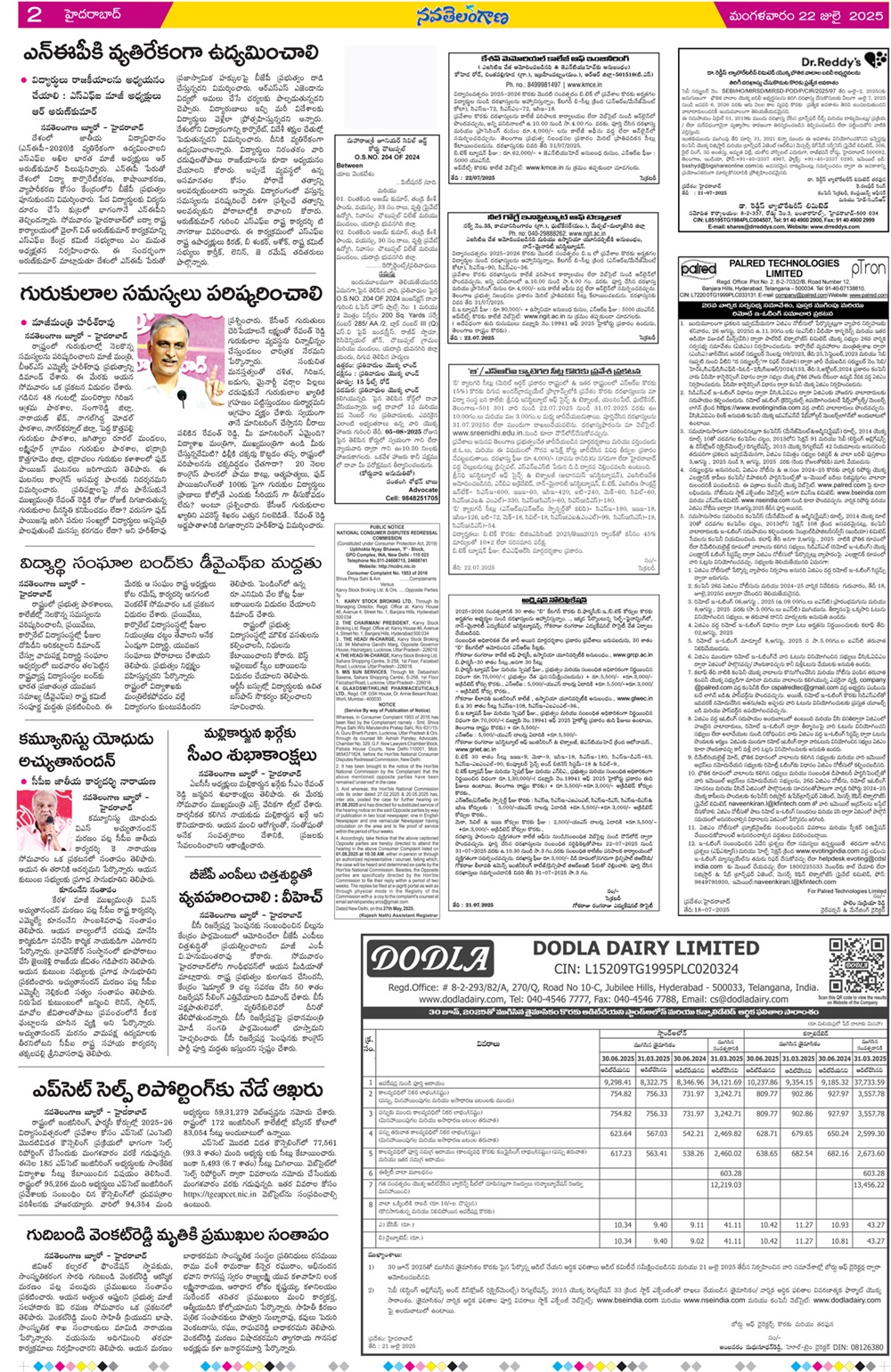 Pursuant to Regulation 47 of SEBI (Listing Obligations and Disclosure Requirements) Regulations, 2015, please find enclosed copies of newspaper advertisement regarding the opening of special window for re-lodgment of the transfer requests of physical shares as published in Business Standard and Nava Telangana.