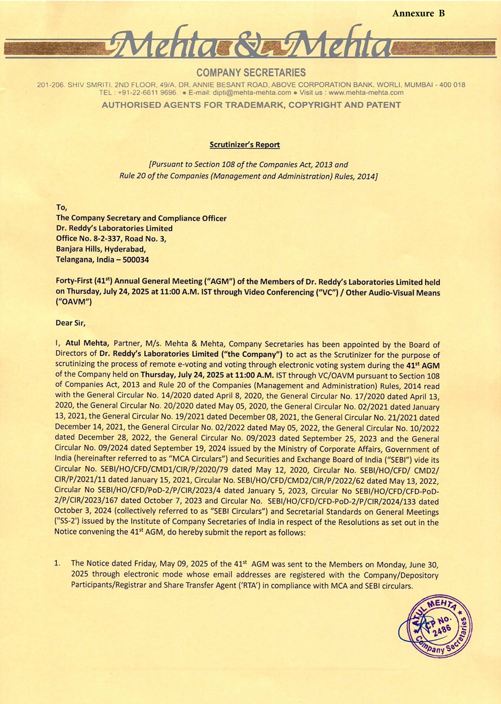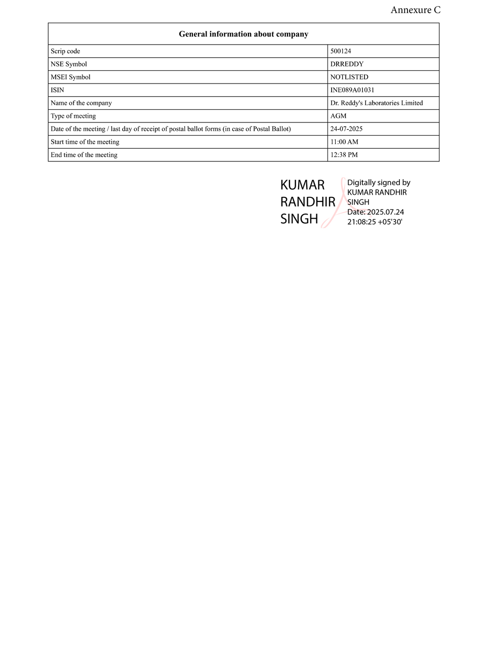 Summary of proceedings of the 41st Annual General Meeting (AGM) of the members of Dr. Reddy’s Laboratories Limited (‘the Company’) held on Thursday, July 24, 2025 at 11.00 AM (IST) through Video Conferencing (VC) /Other Audio Visual Means (OAVM).
