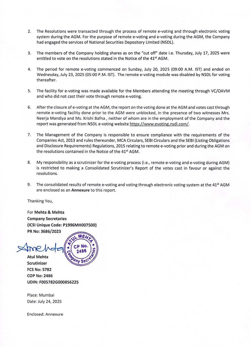 This is with reference to our earlier letters dated May 09, 2025 and June 30, 2025, regarding the 41st Annual General Meeting (AGM) of the Company, held today i.e. July 24, 2025.